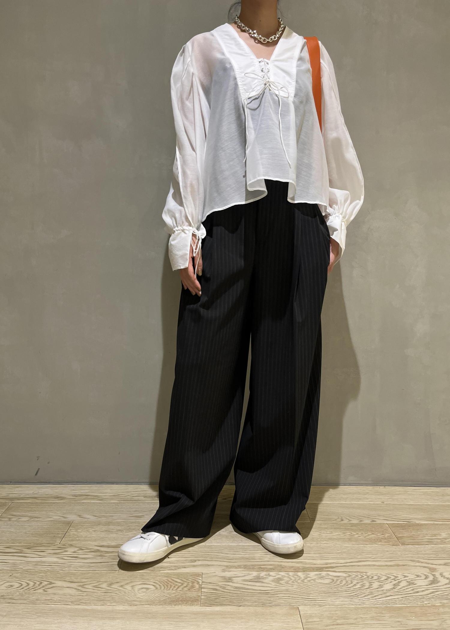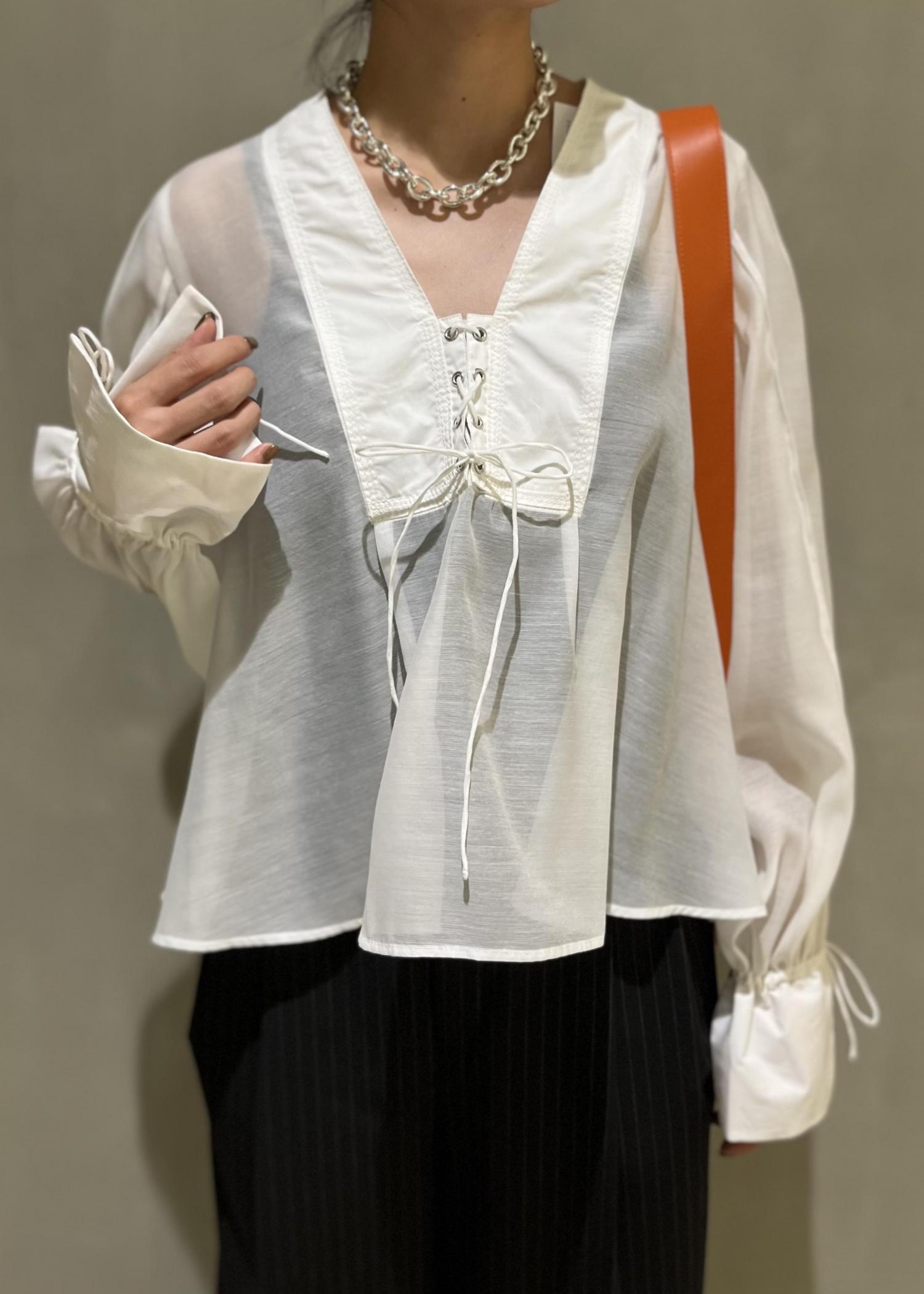 レースアップの甘めな要素と、シアー素材で大人な要素がミックスされたお洒落なブラウスです!!