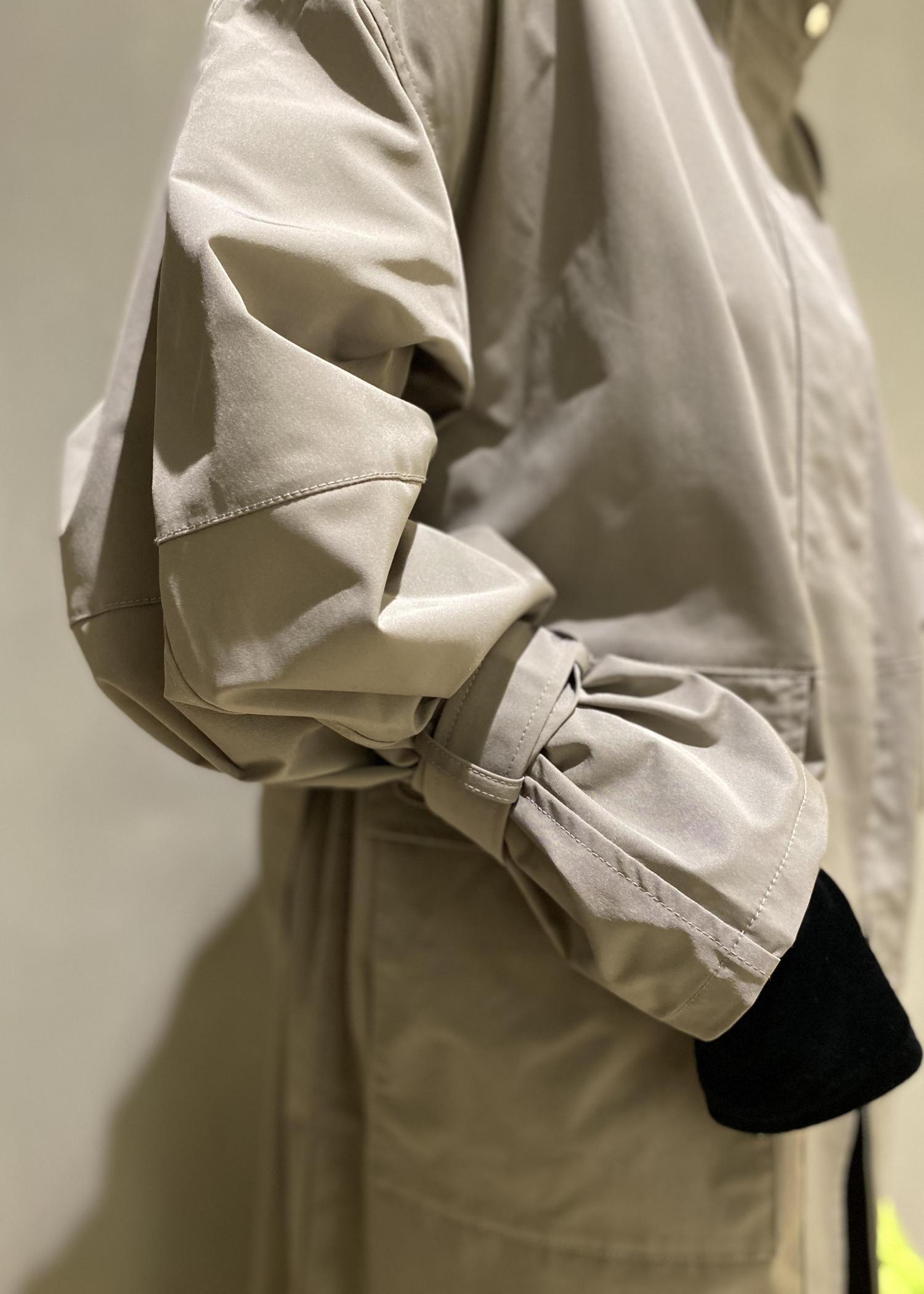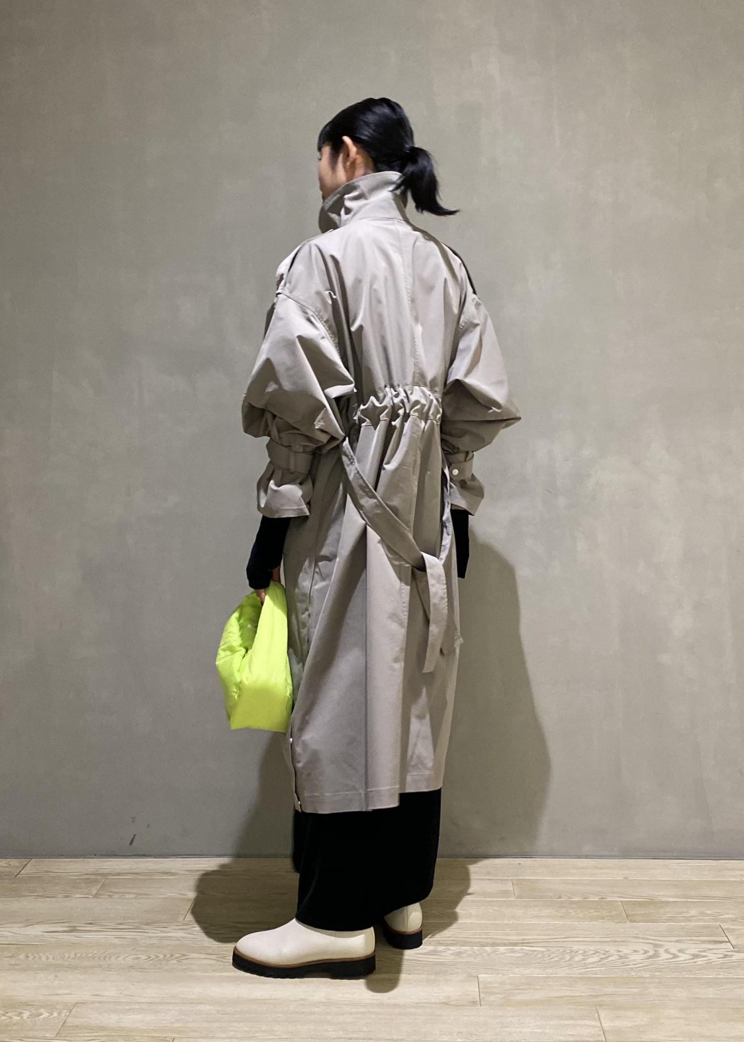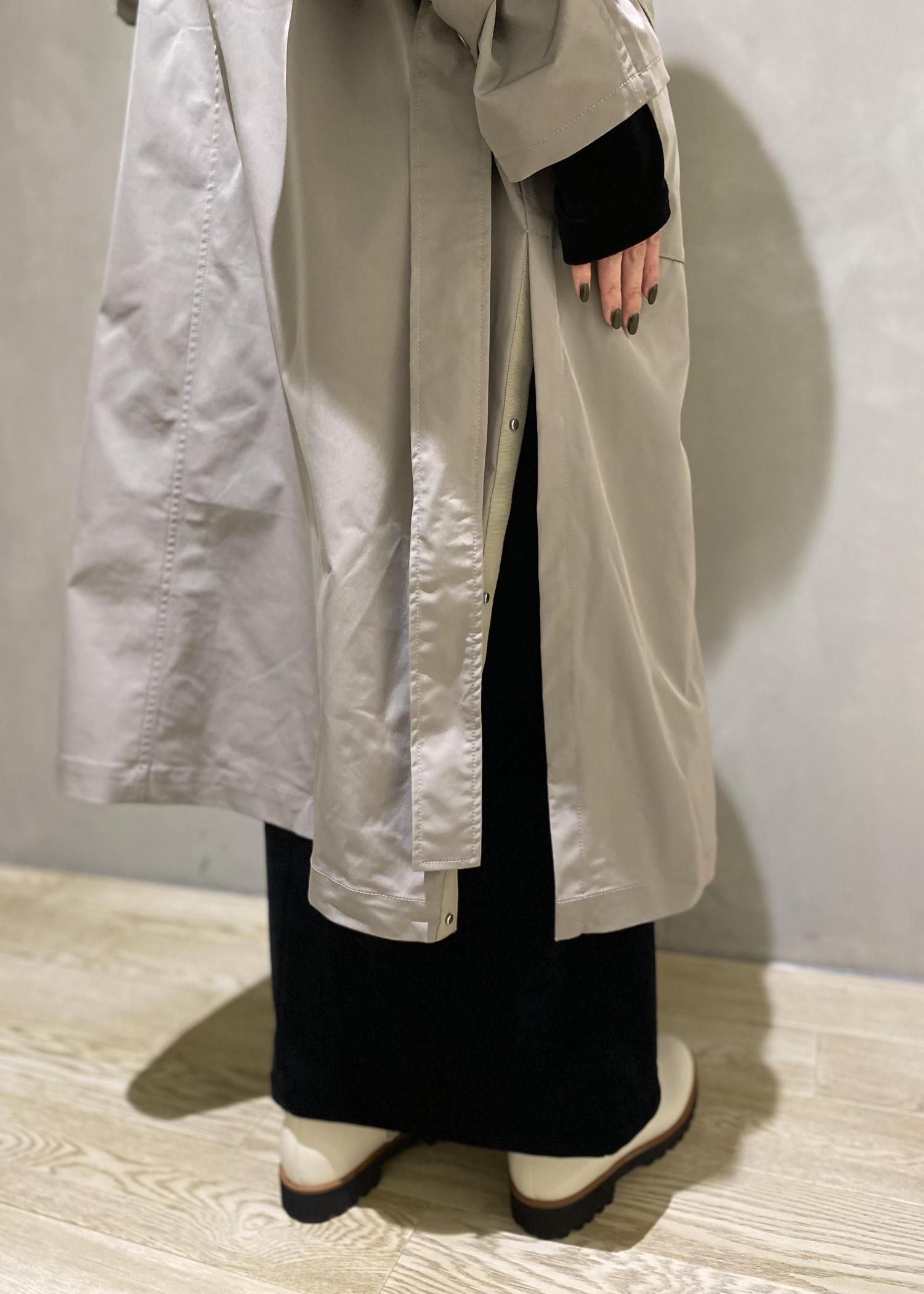 シンプルなのに着るだけで様になる、お洒落コート。色味はグレーのようなカーキで艶のあるお素材感なので、とても上品且つモードなアイテムです◎
