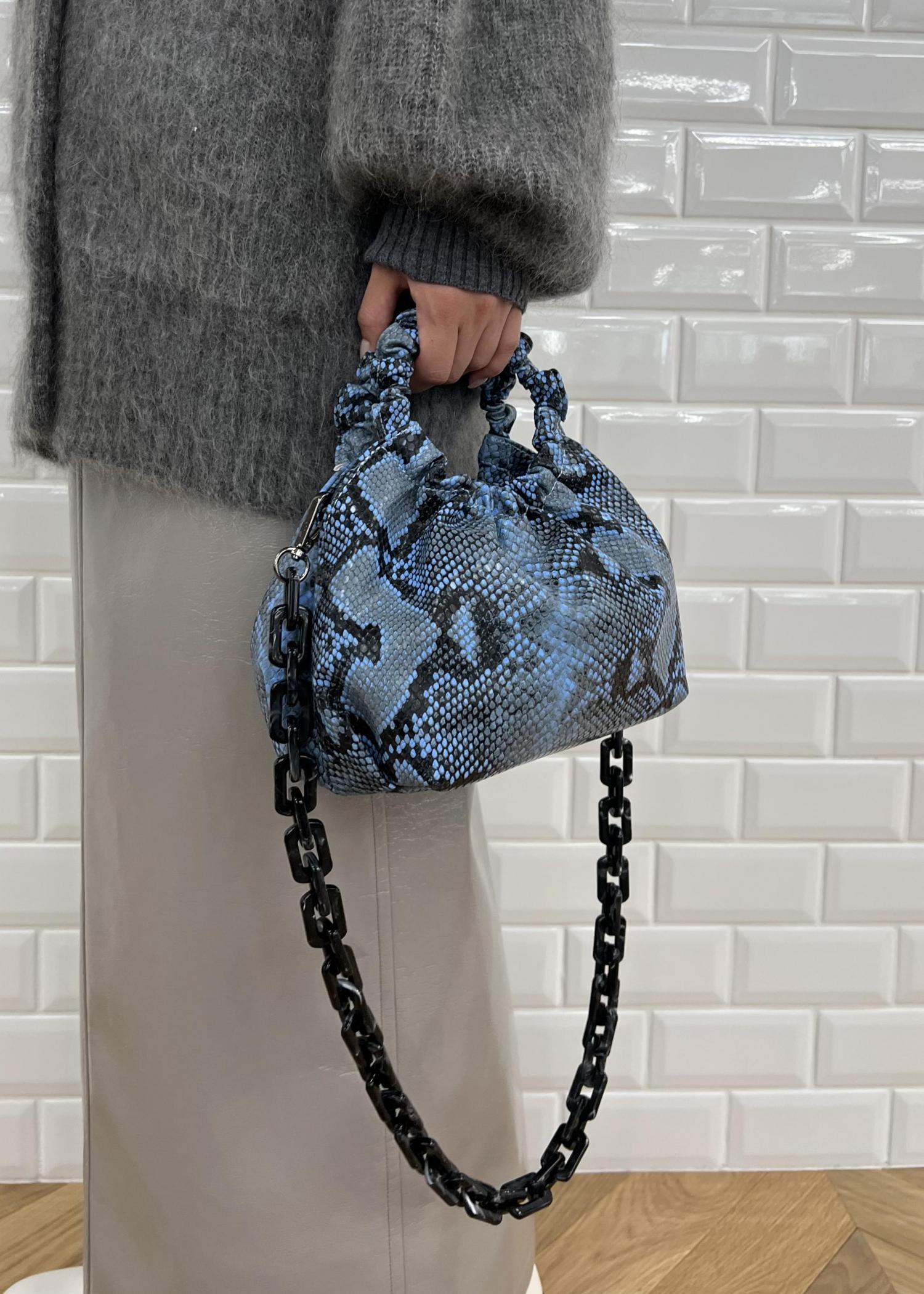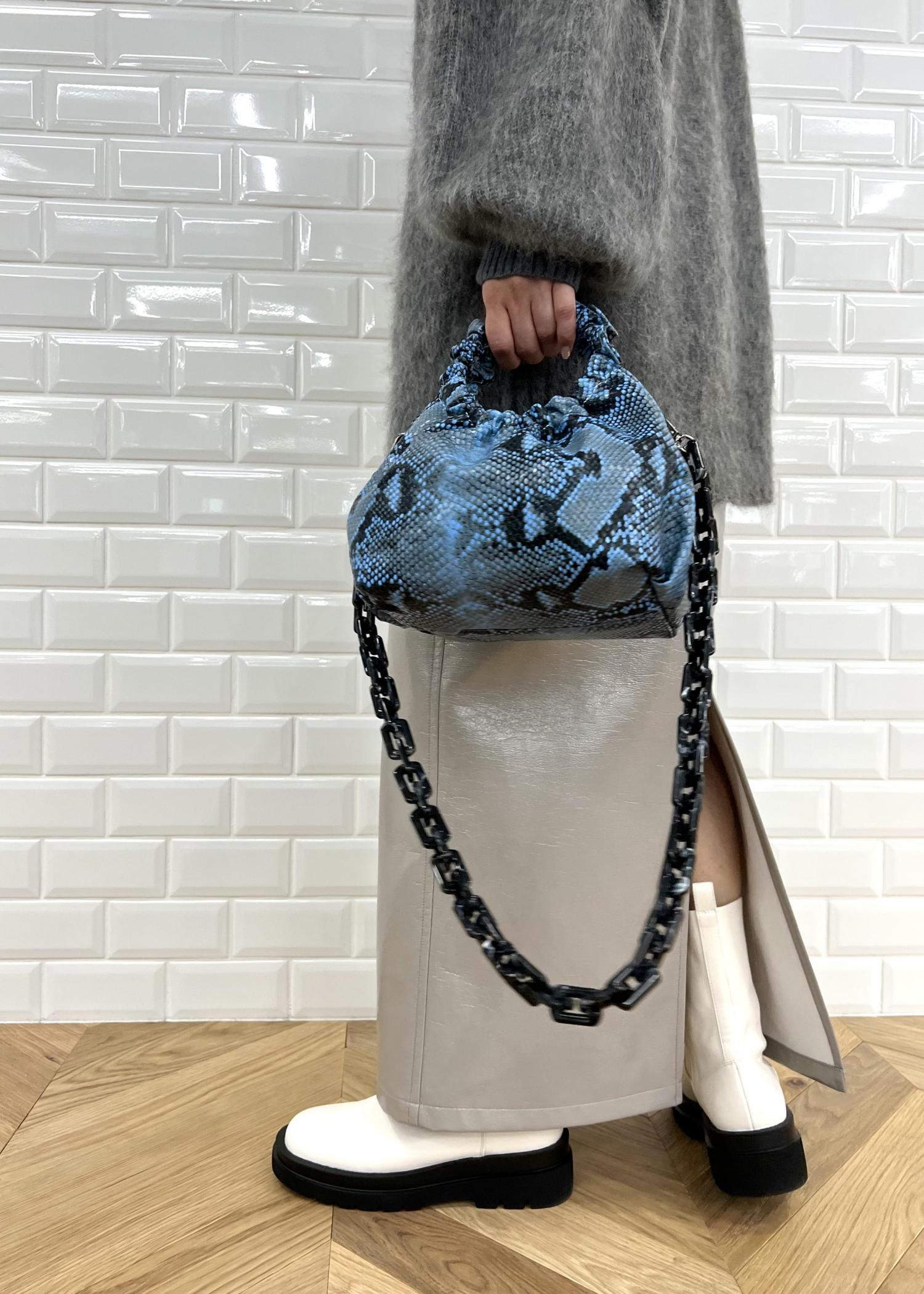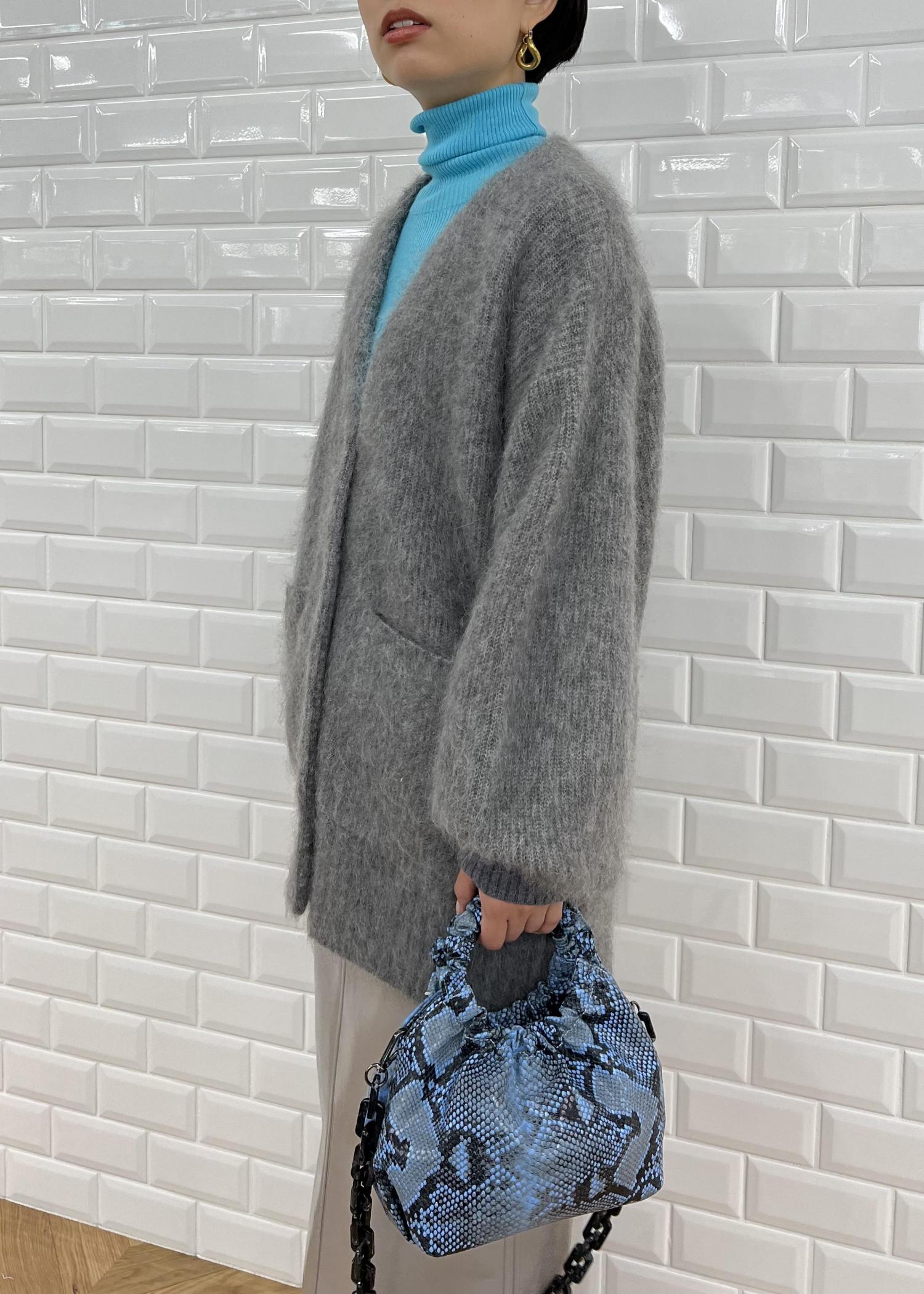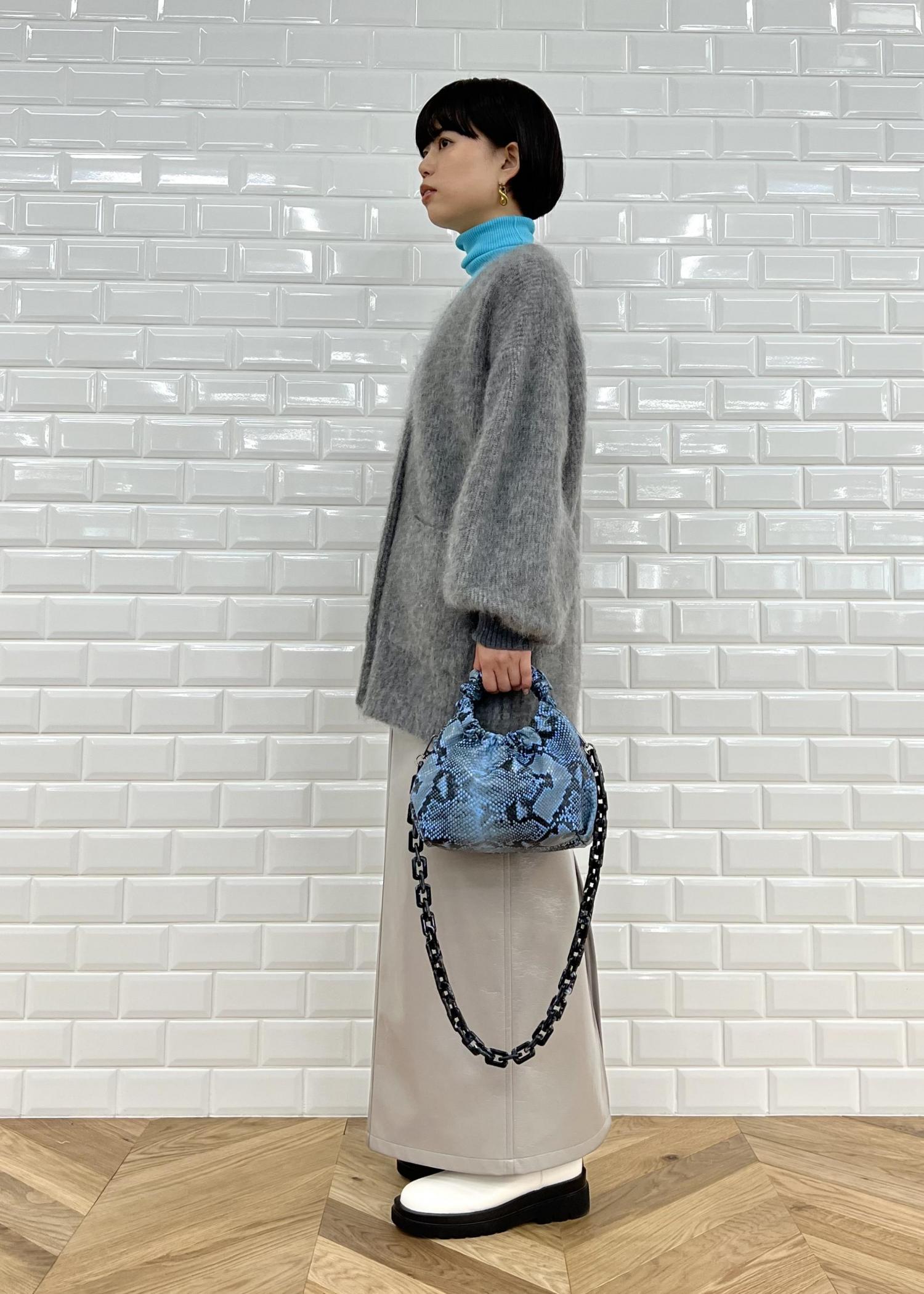 毛足長めのカーディガンには、ツヤのあるスカートを合わせてメリハリを効かせてモード感のある雰囲気を目指しました。