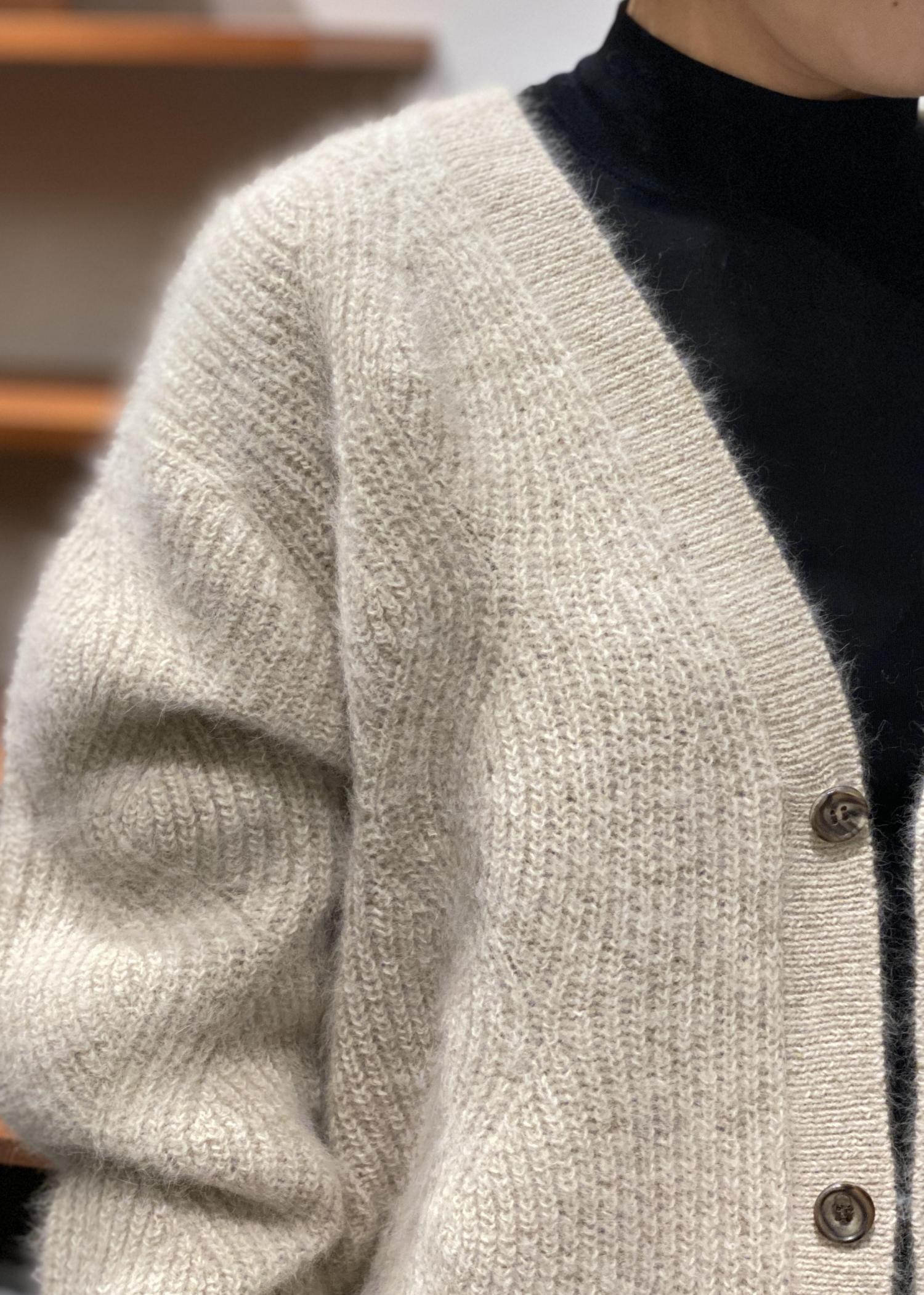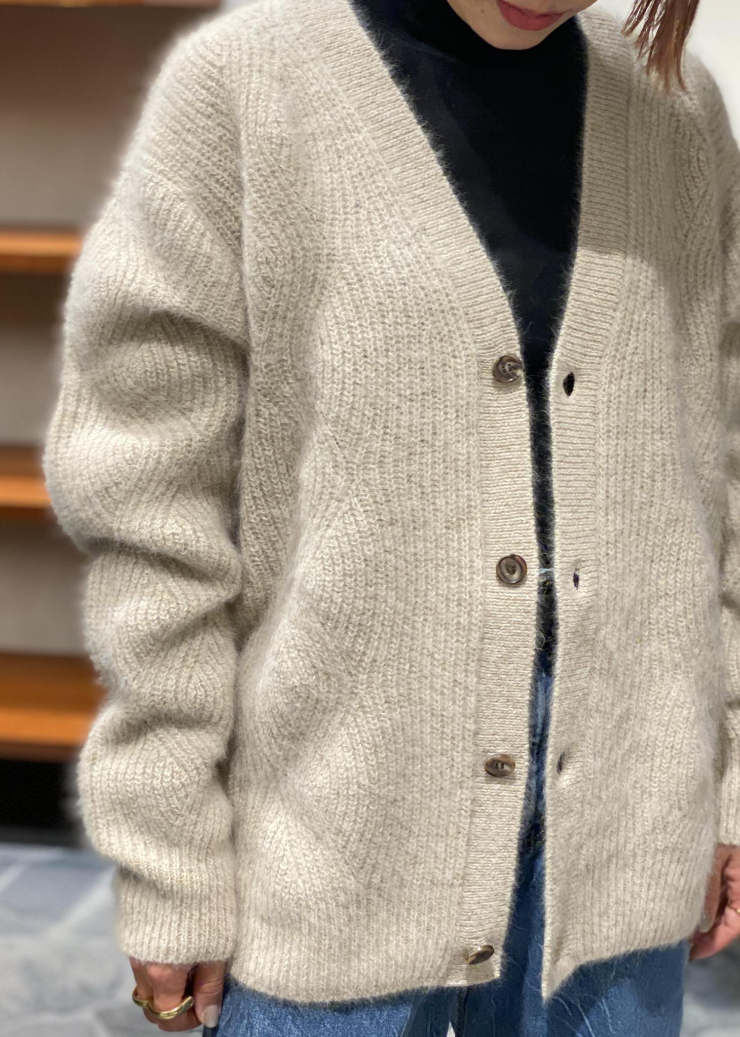 ゆったりとしたサイズ感でふんわりと柔らかい雰囲気を与えてくれます。ピリッと辛口なスタイルに合わせても、可愛らしいスカートスタイルに合わせてもハマるカーディガンです。