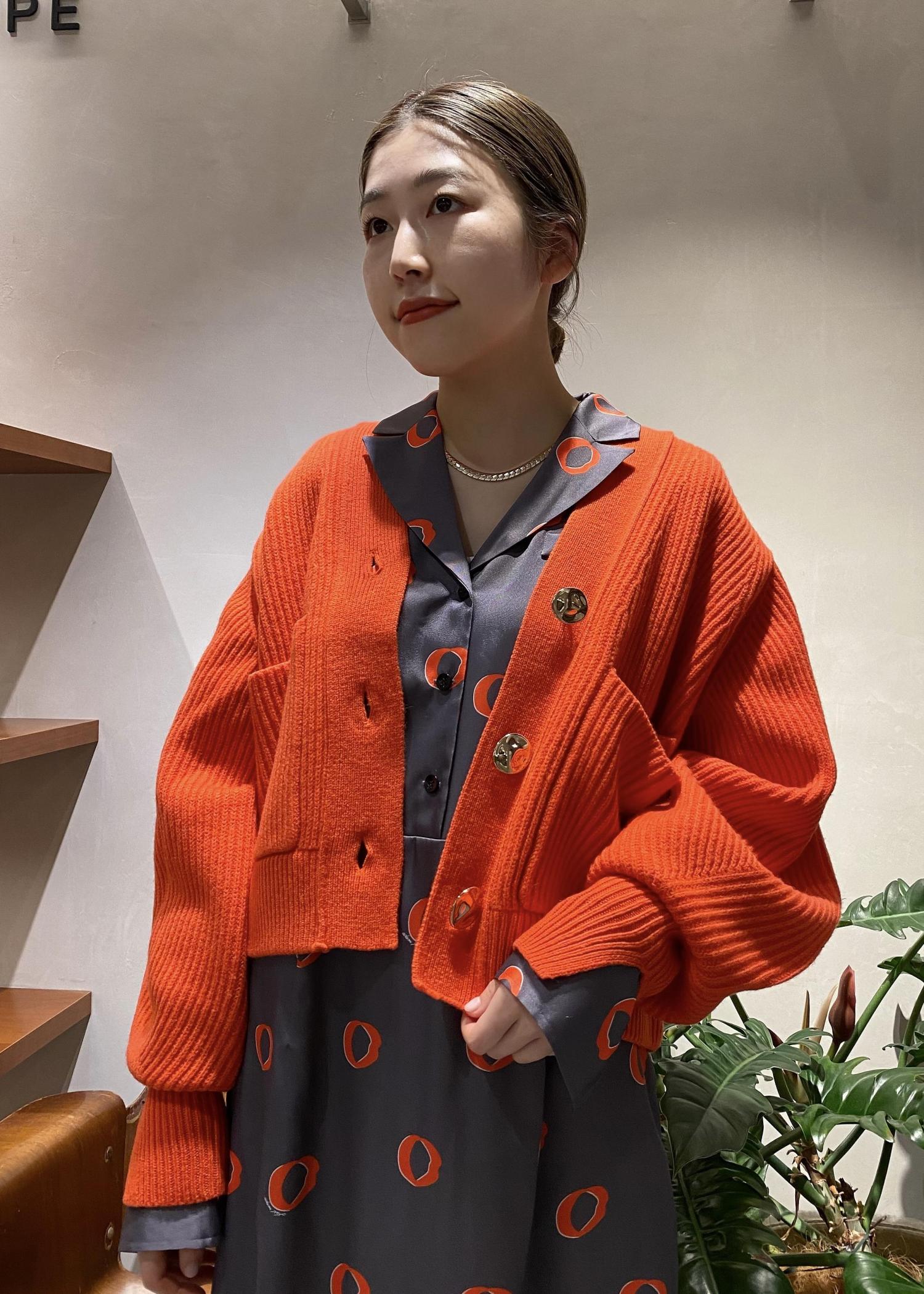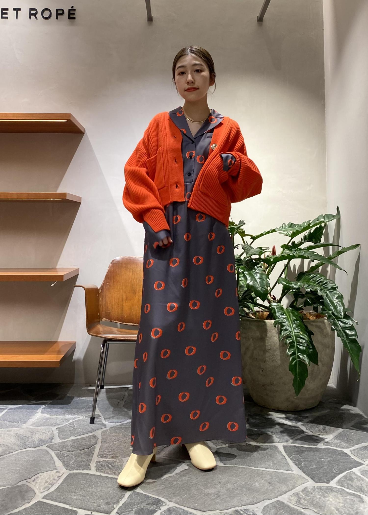 今回はオリジナルリップ柄のシャツワンピースとゴールドボタンが可愛いリブカーディガンで綺麗めな華やかスタイリングにしてみました~