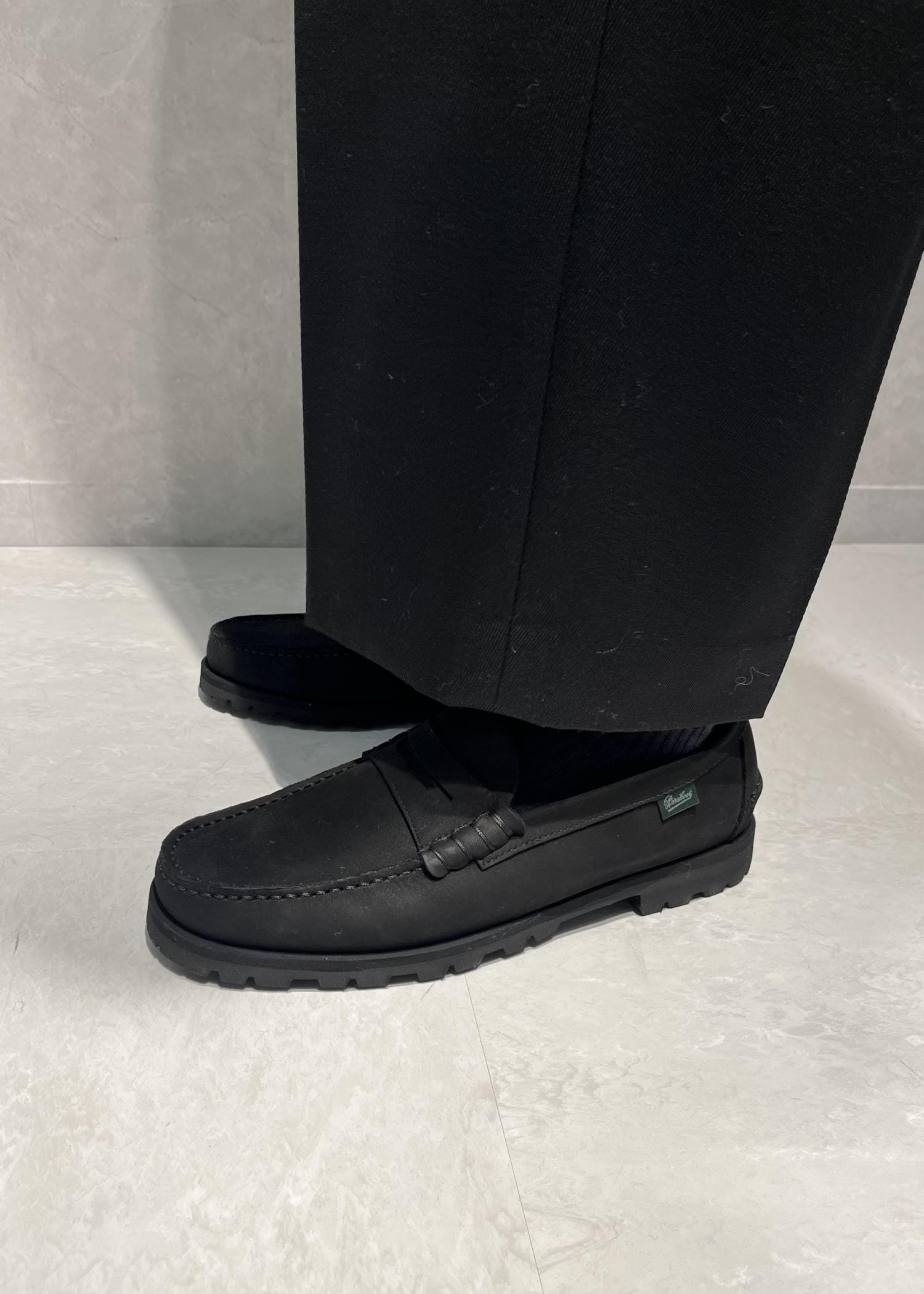 パラブーツ別注のローファーは、ヌバックレザーを使用していて品のある素材感となっています。履き心地も良いので、革靴慣れしていない方にも履いてみていただきたいです。