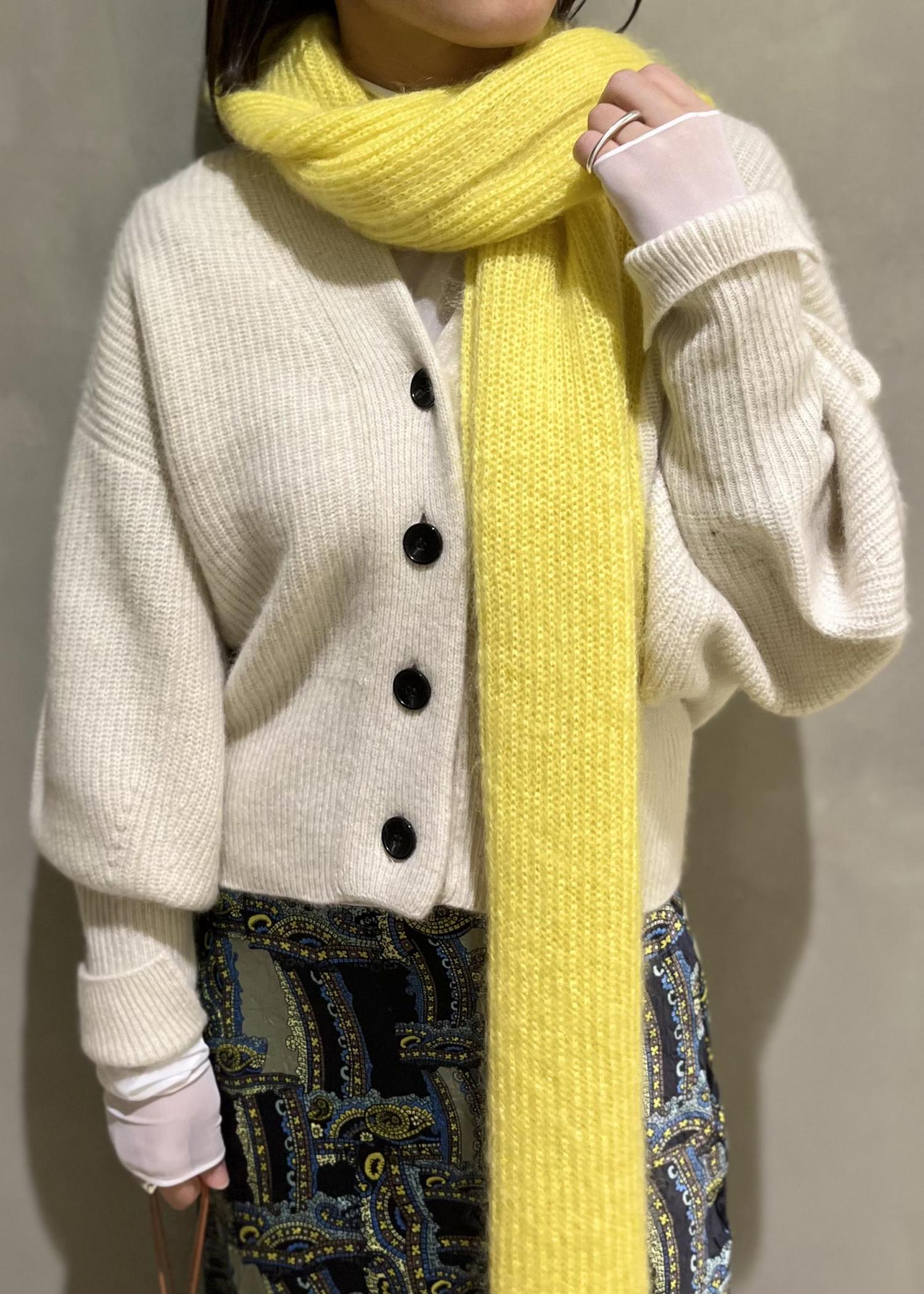 今回は柄のスカートや、イエローのマフラーをアクセントにスタイリング。