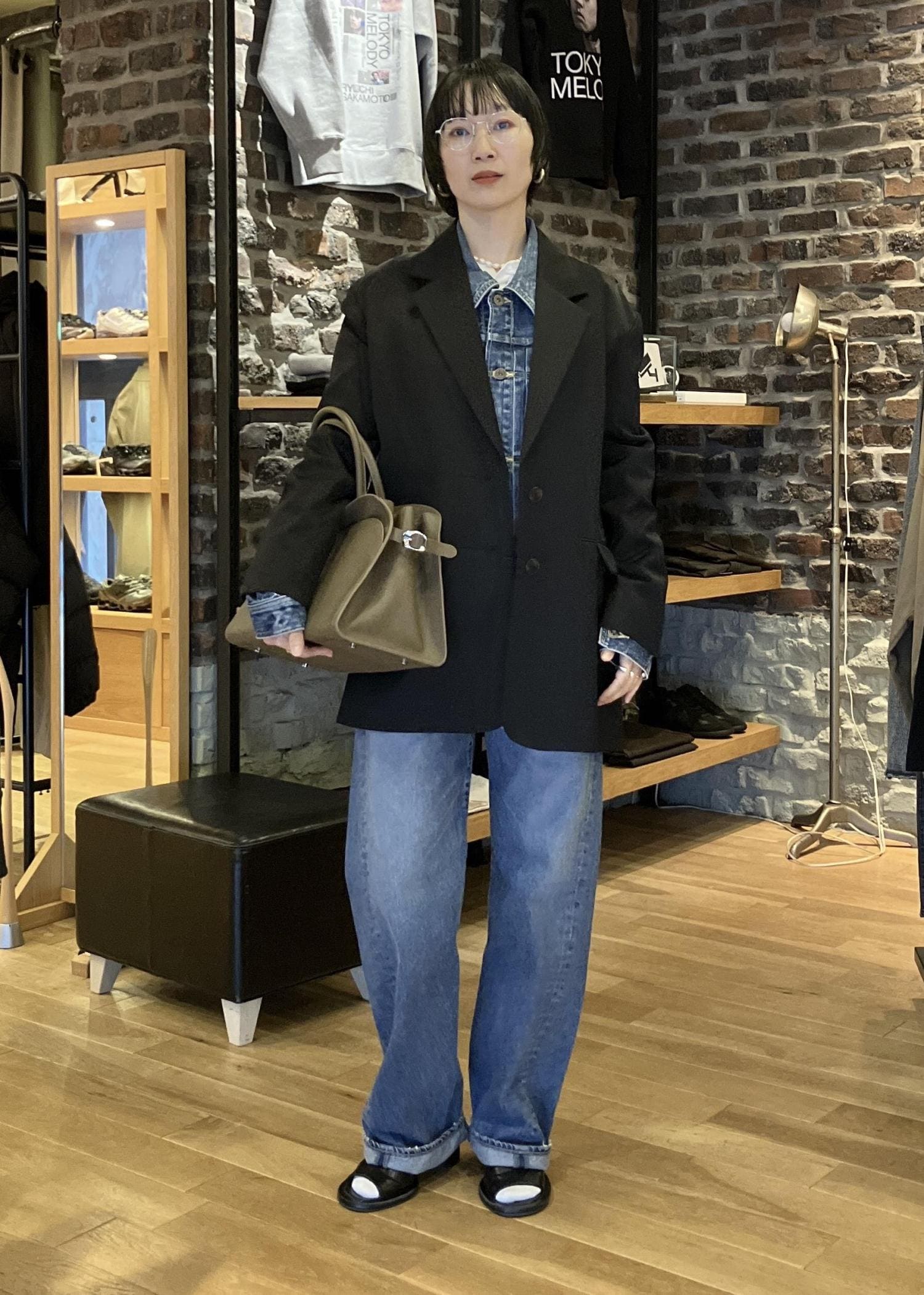 少し光沢感がある素材感なので、綺麗めなブラウスや、シャツと合わせたりでも、大丈夫です!