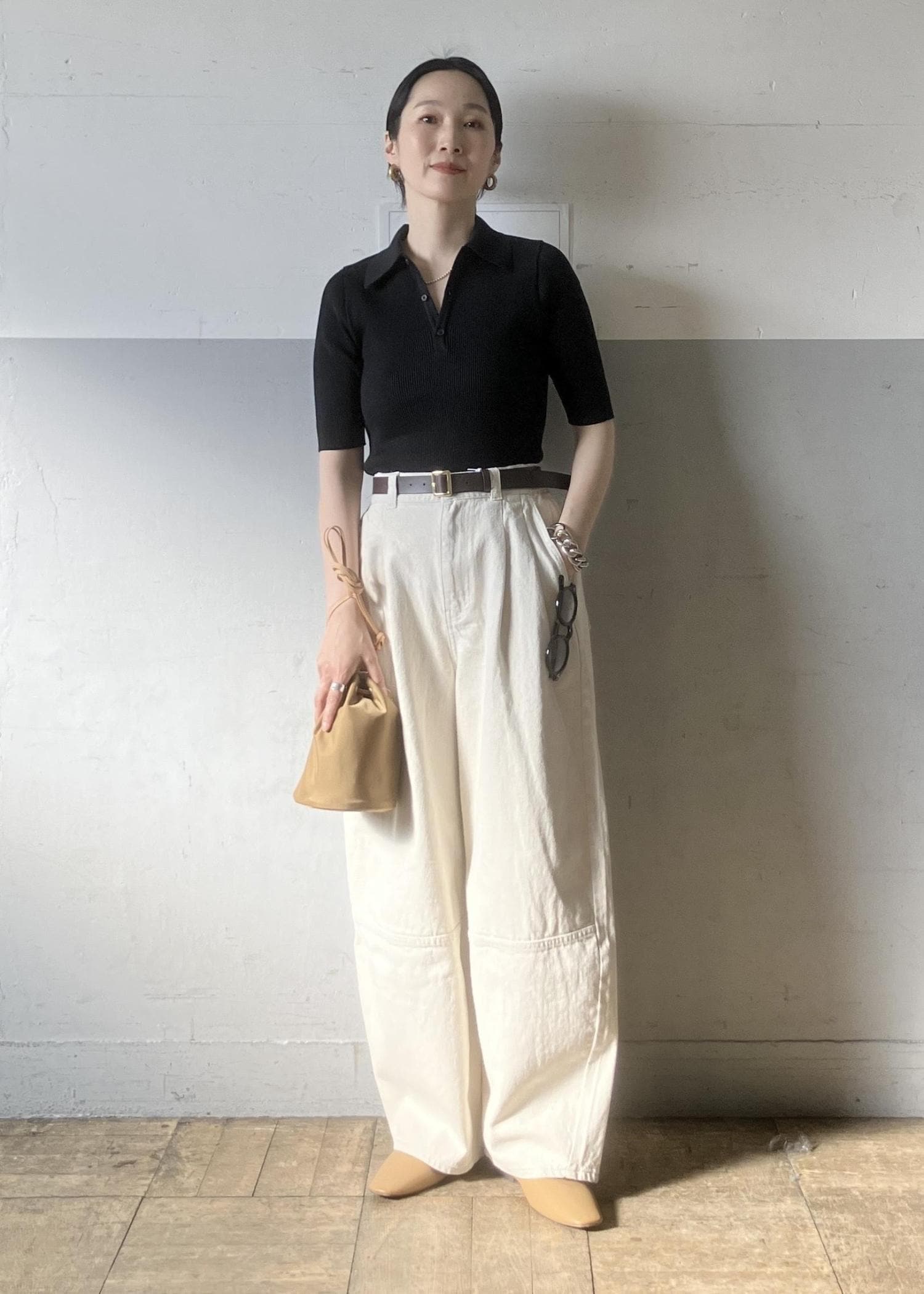 私は春に向けてハーフスリーブのニットと合わせてカジュアルなコーディネートにしてみました。