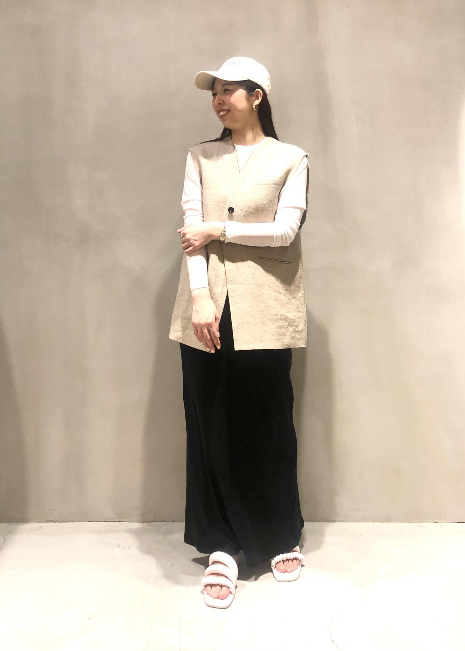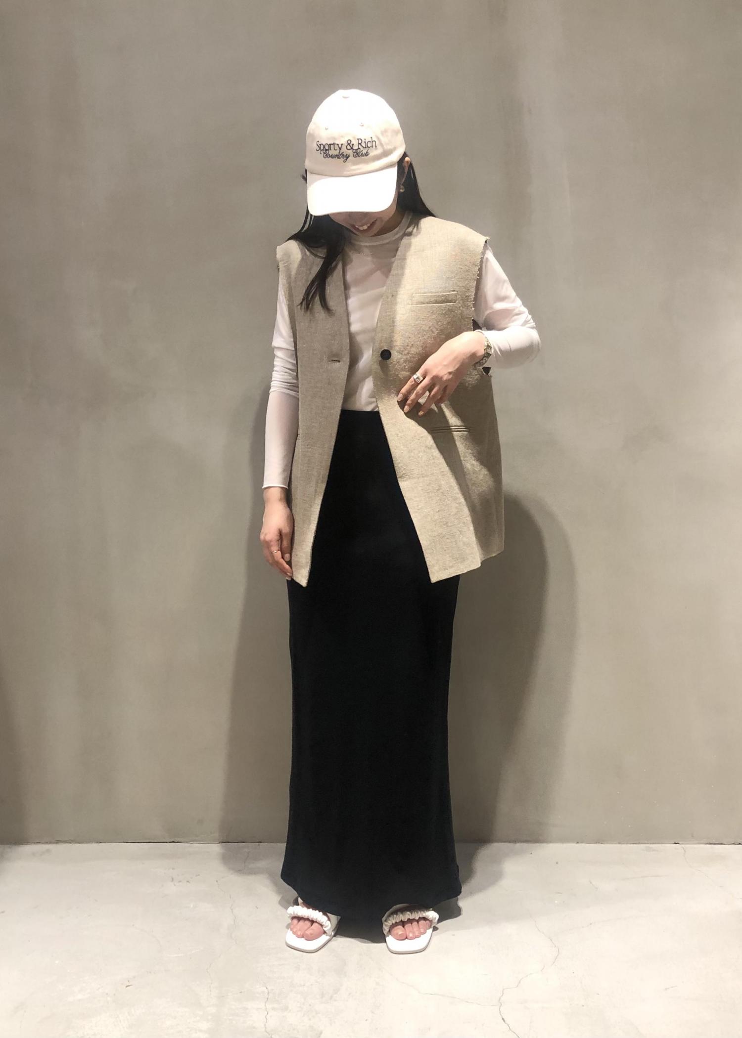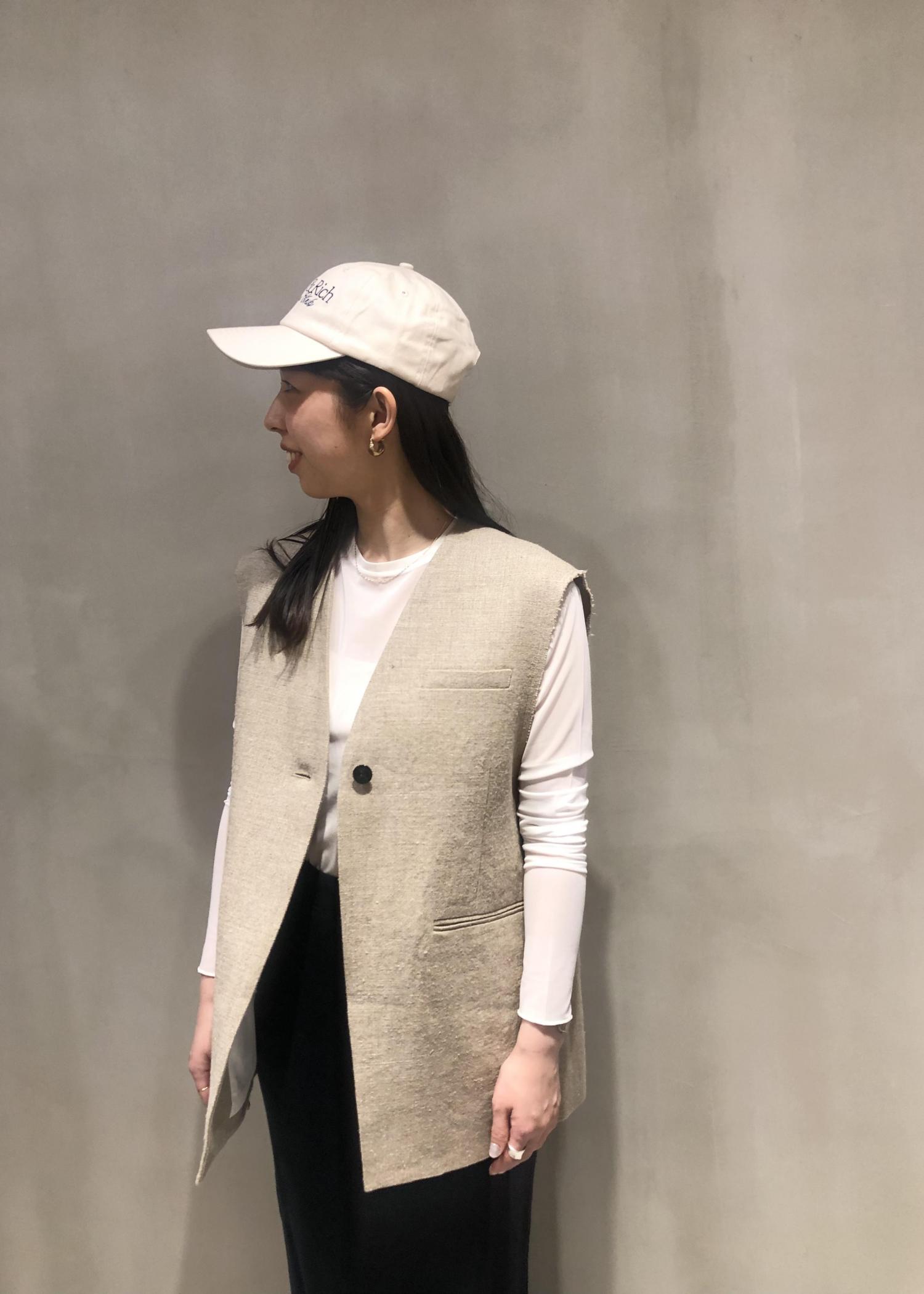 キャップを合わせてよりカジュアルにしましたが、トップスのインナーをシアー素材にすることで女性らしいスタイリングに○
