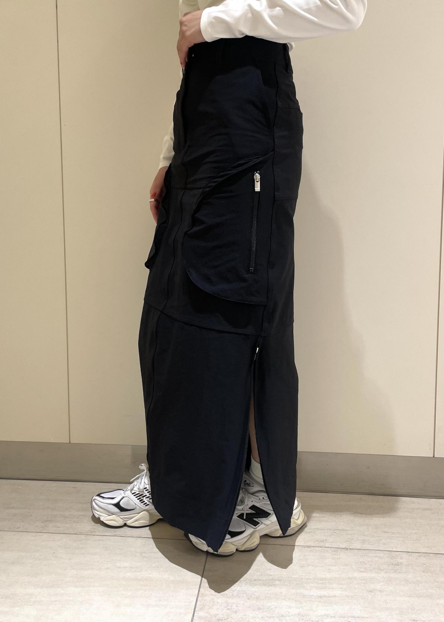 スカートはミリタリーチックなタイトスカートとなっており、大人カジュアルに着て頂けます。丈感の長めなトップスとも相性◎