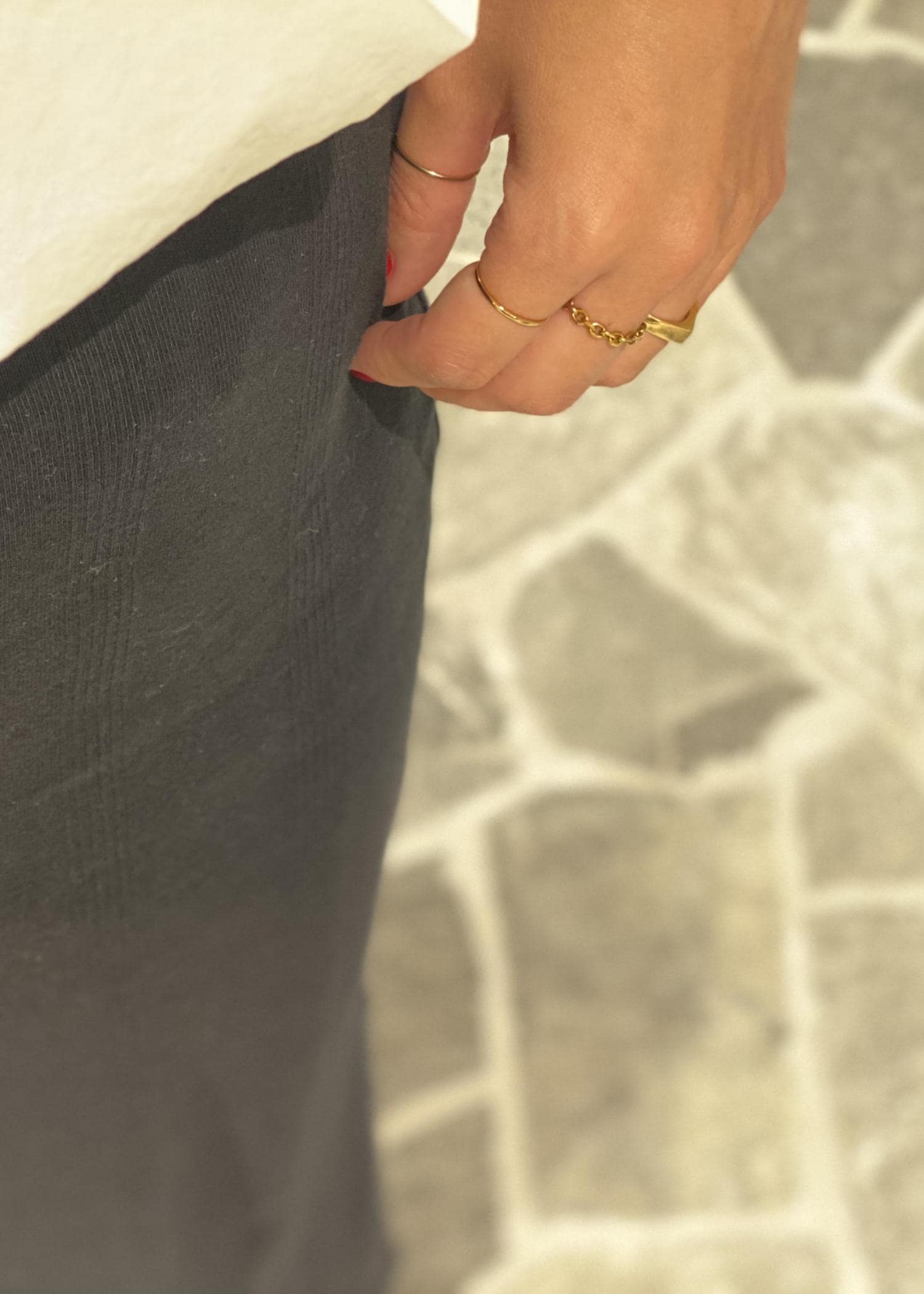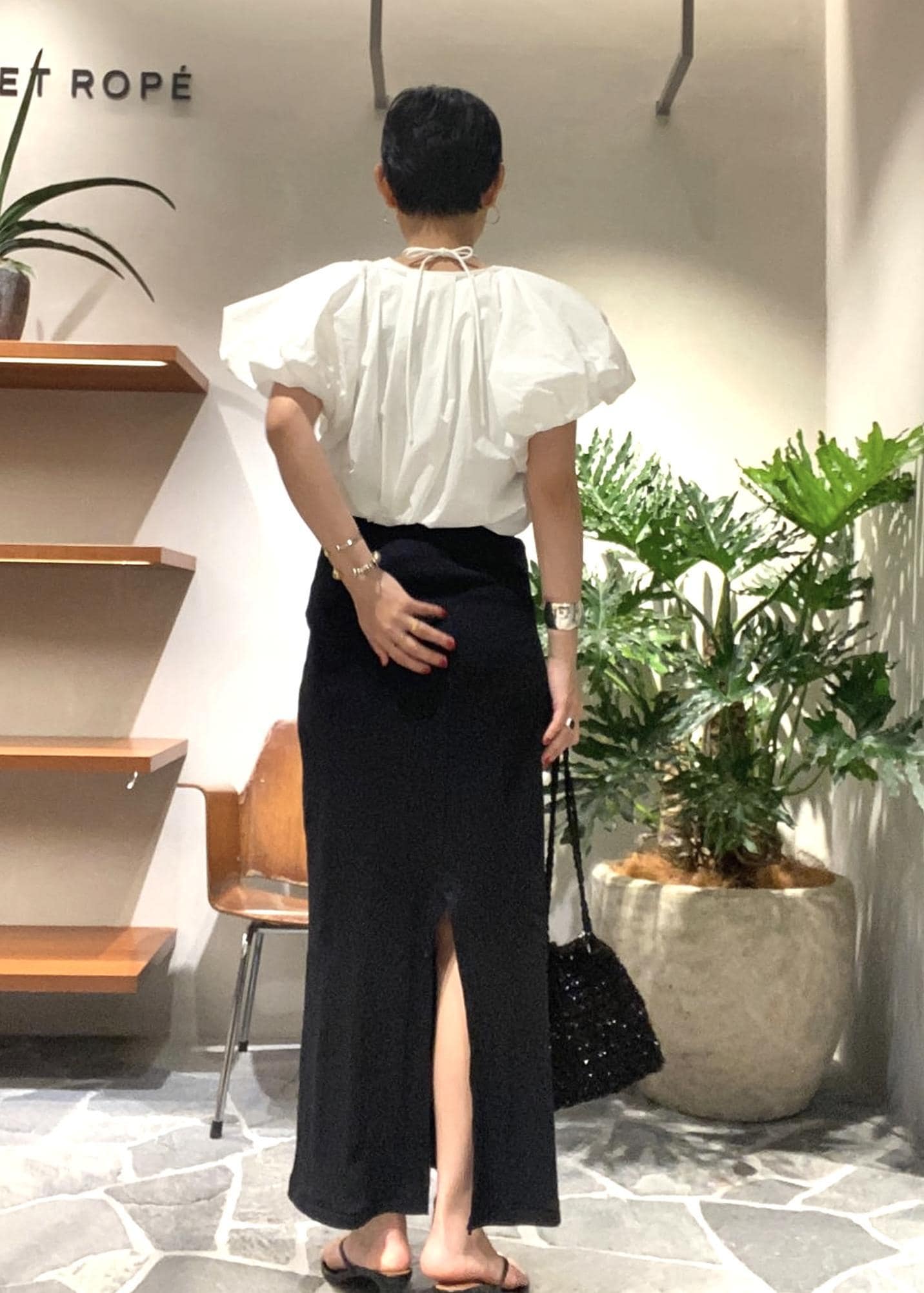 今回はリラックス感のあるタイトスカートとトングサンダルで抜け感をプラスした合わせにしましたが、もちろんデニムやスラックスなどクールなパンツとの合わせもすごく可愛くておすすめです。