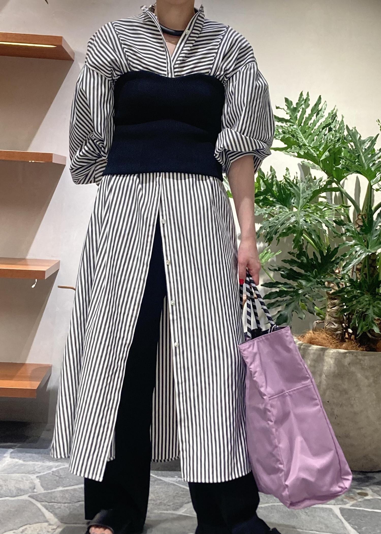 今回はシャツワンピースのみ活用し、肩紐の無いVENITのビスチェでスタイリングしてみました。