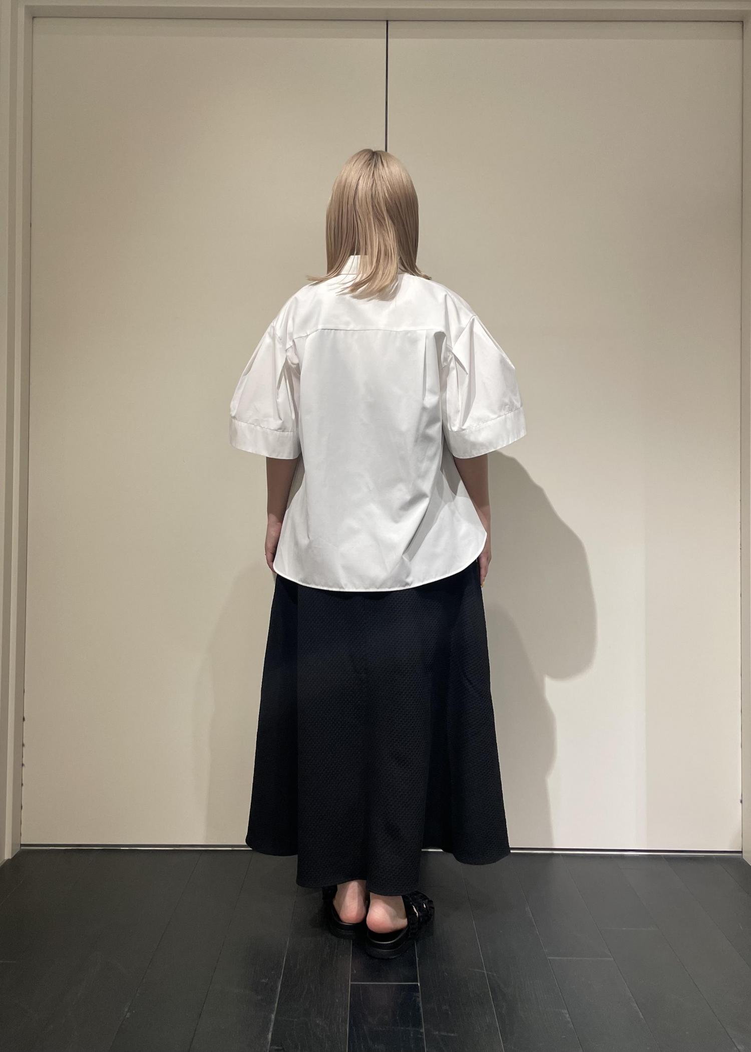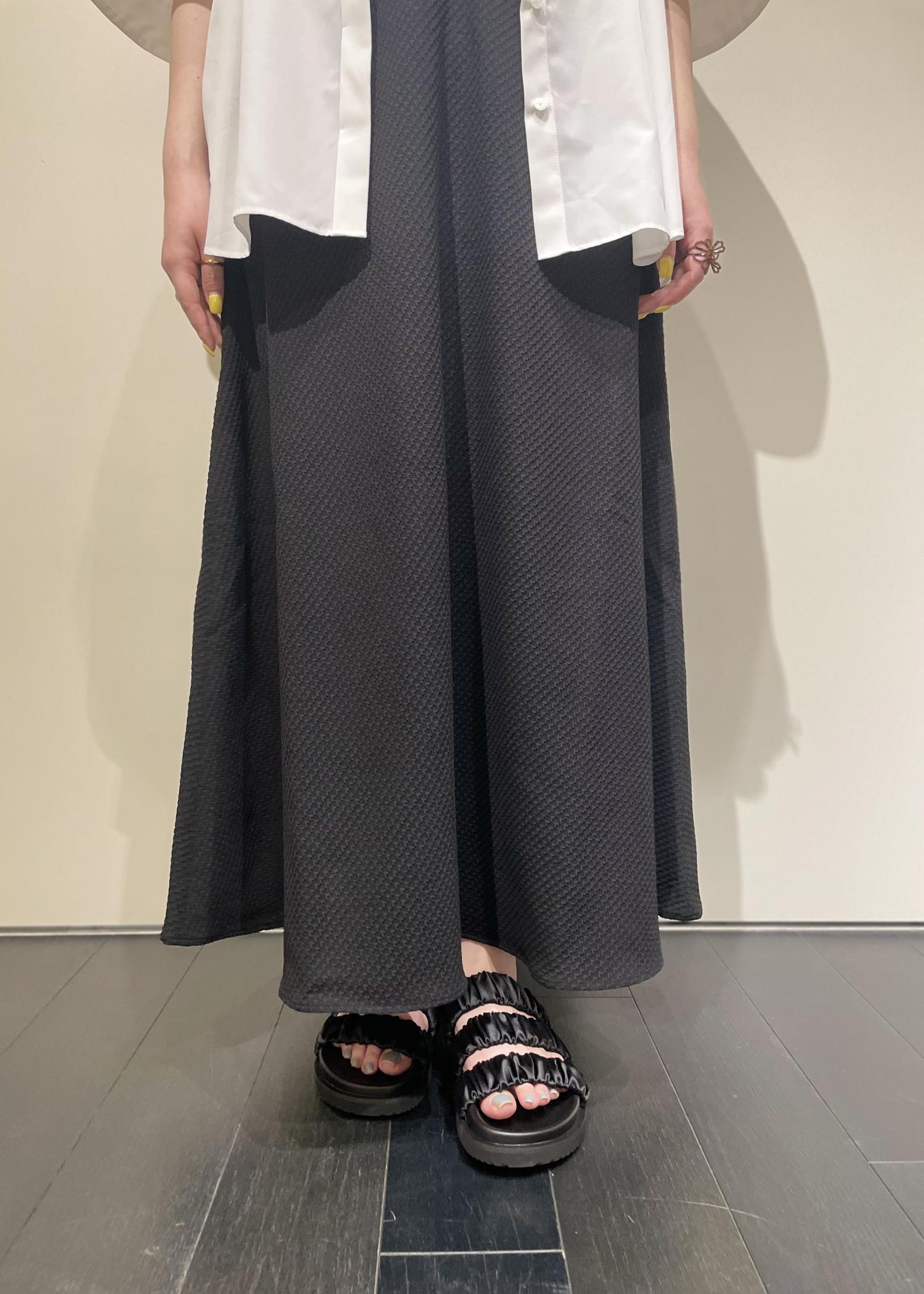 表面がポコポコとしたジャガード素材でウエスト位置のパイピングがポイントになり、スタイルアップして見えます◎