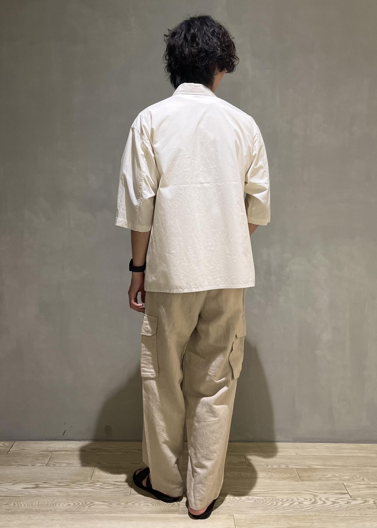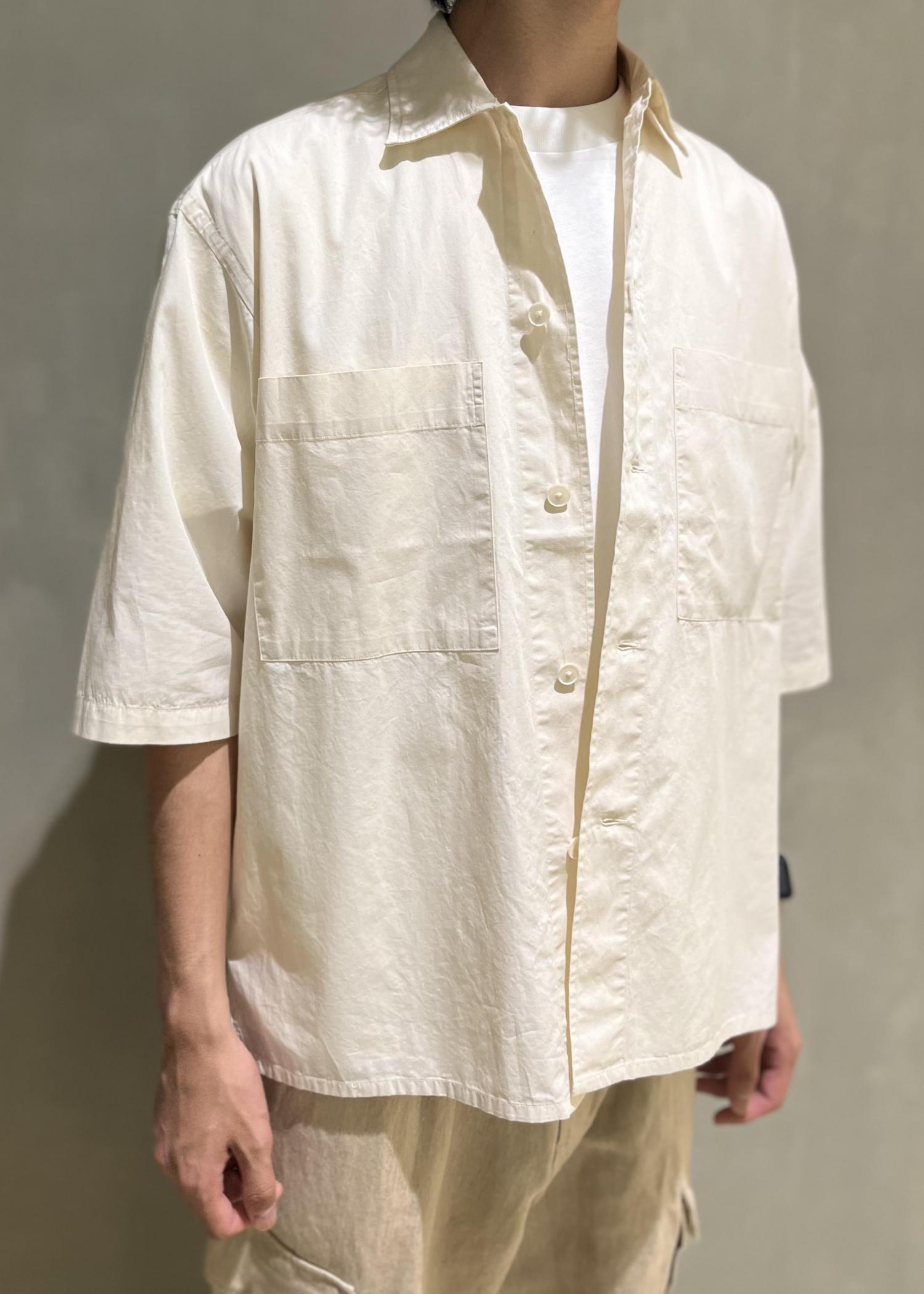 シャツはボックスシルエットで、リラックスしたサイズ感です。オーバーサイズ過ぎないので、子どもっぽくならない大人の余裕を感じるサイズ感です。
