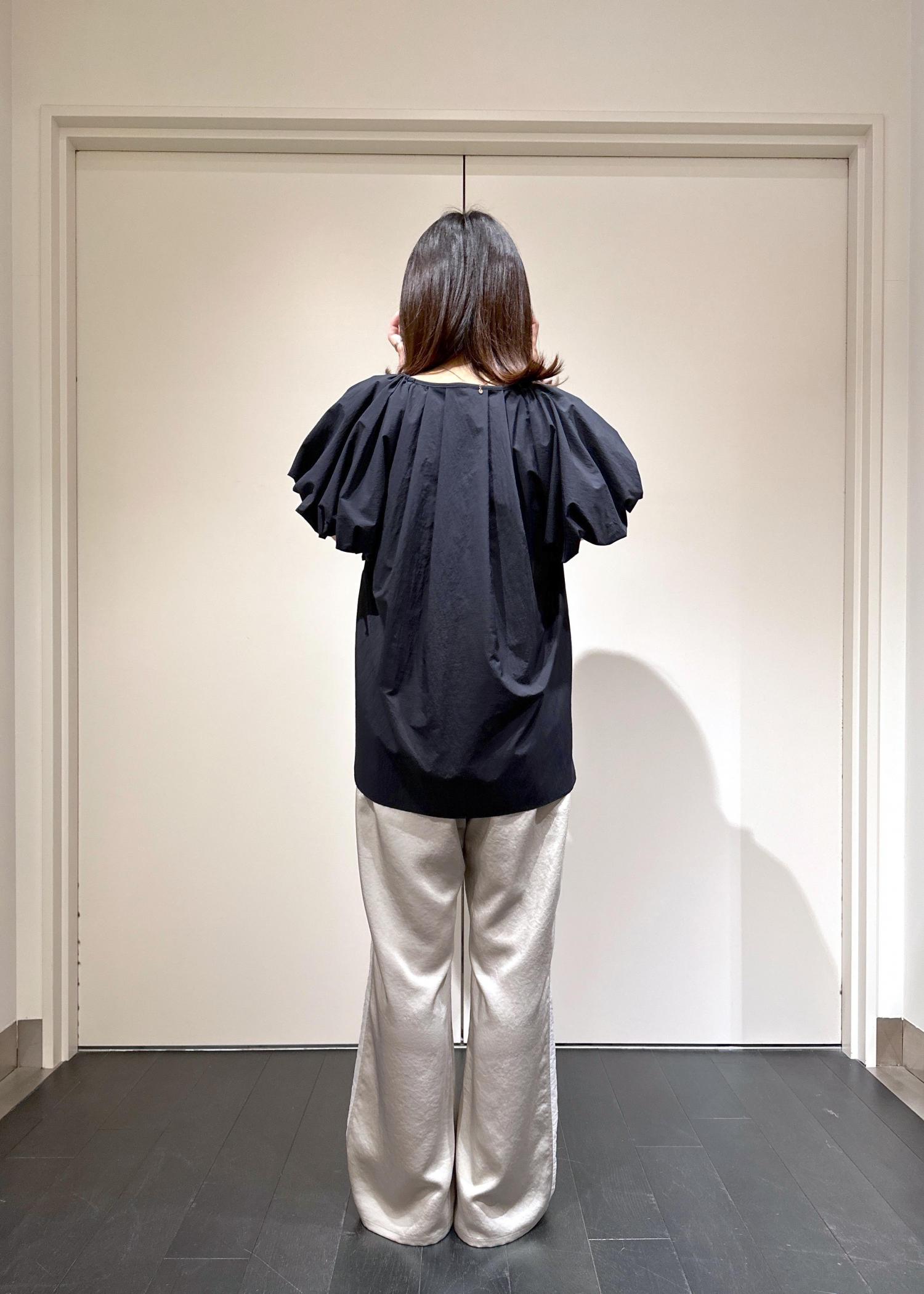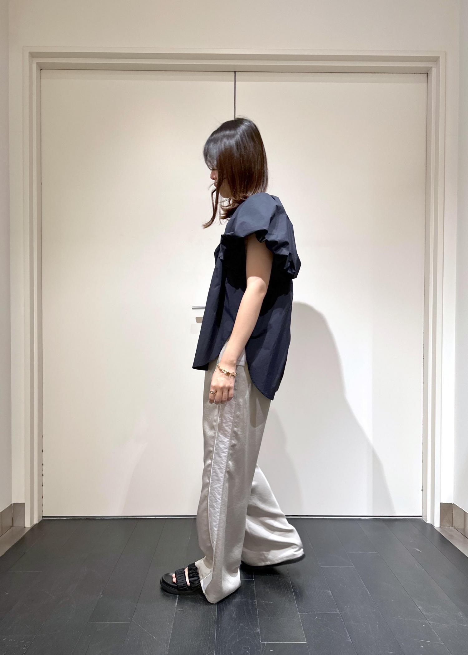 フェミニンなブラウスにイージーパンツを合わせることで可愛くなりすぎずに、少しラフな印象でも着ていただけます○