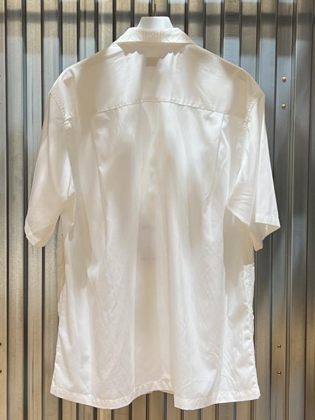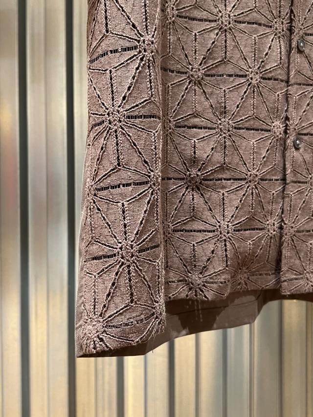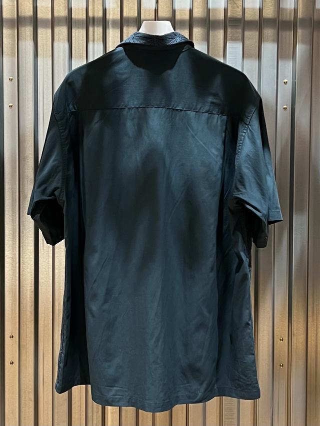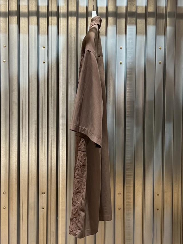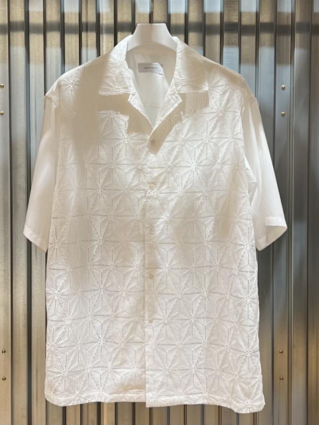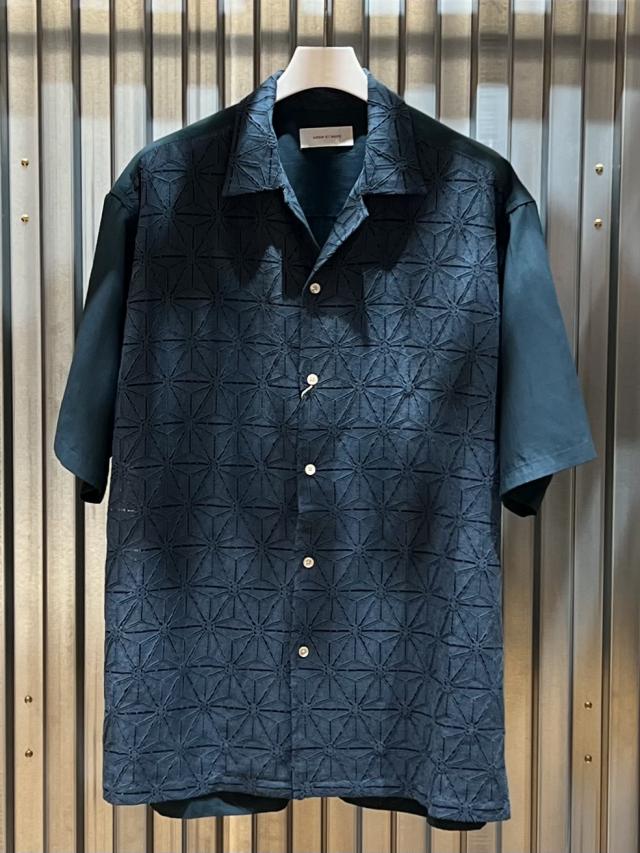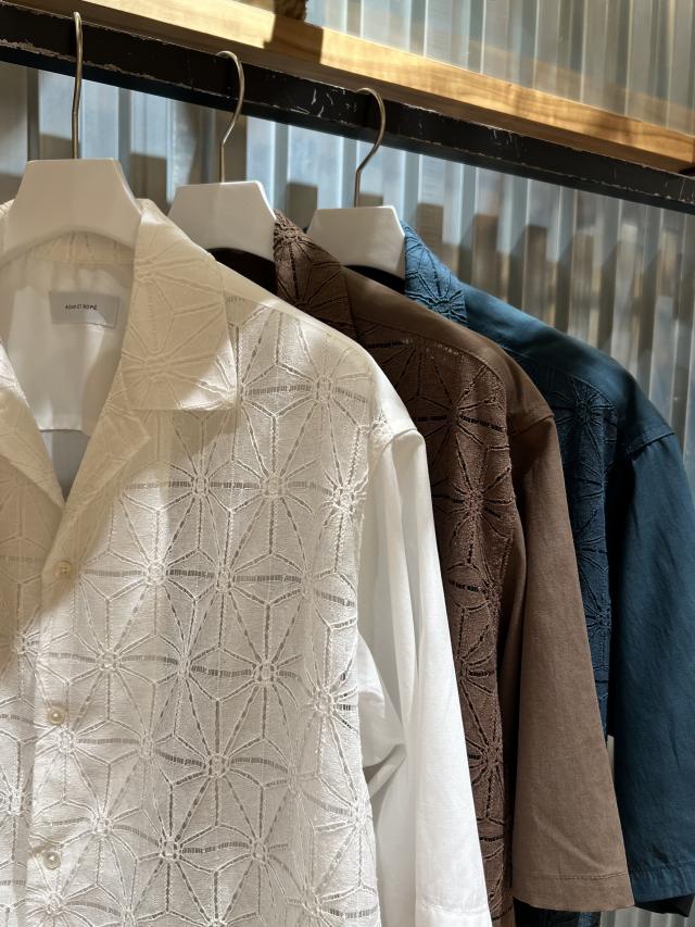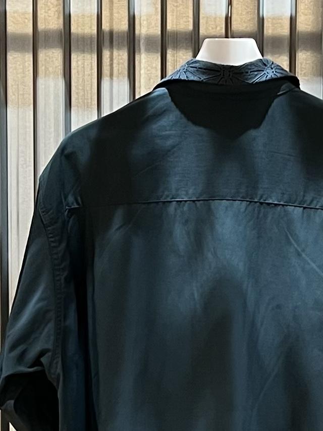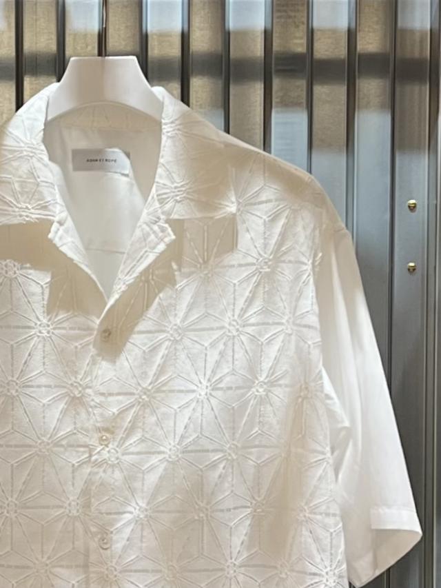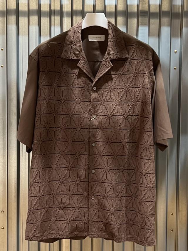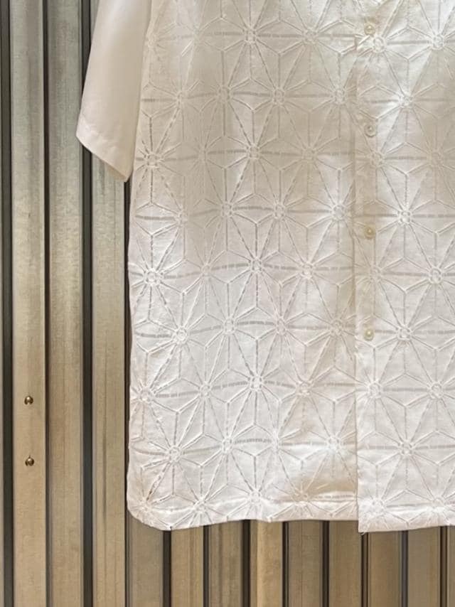 同カラーのコットン/ナイロンのラッセルレースと、テンセル/コットンブロードの2素材のコンビネーション、適度なオーバーサイズのオープンカラーシャツです。
