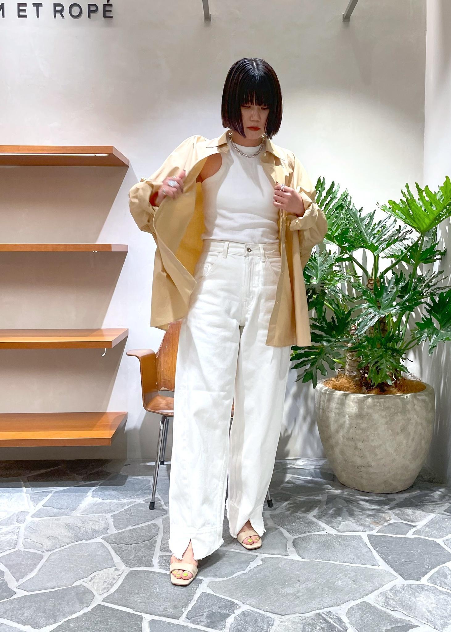 上下ホワイトにオレンジベージュのカラーを合わせたことで、きれいめすぎないスタイリングにしてみました。