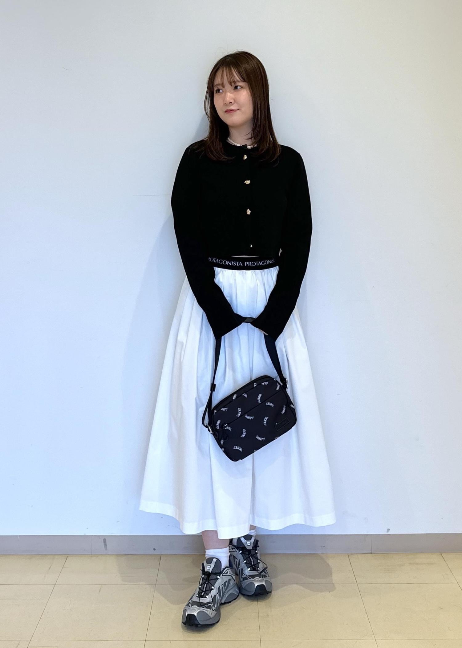 春らしいカラーのアイテムを使ったスタイリングです。