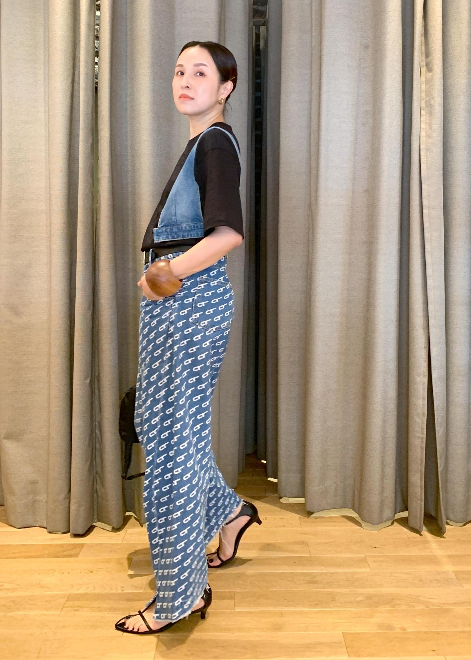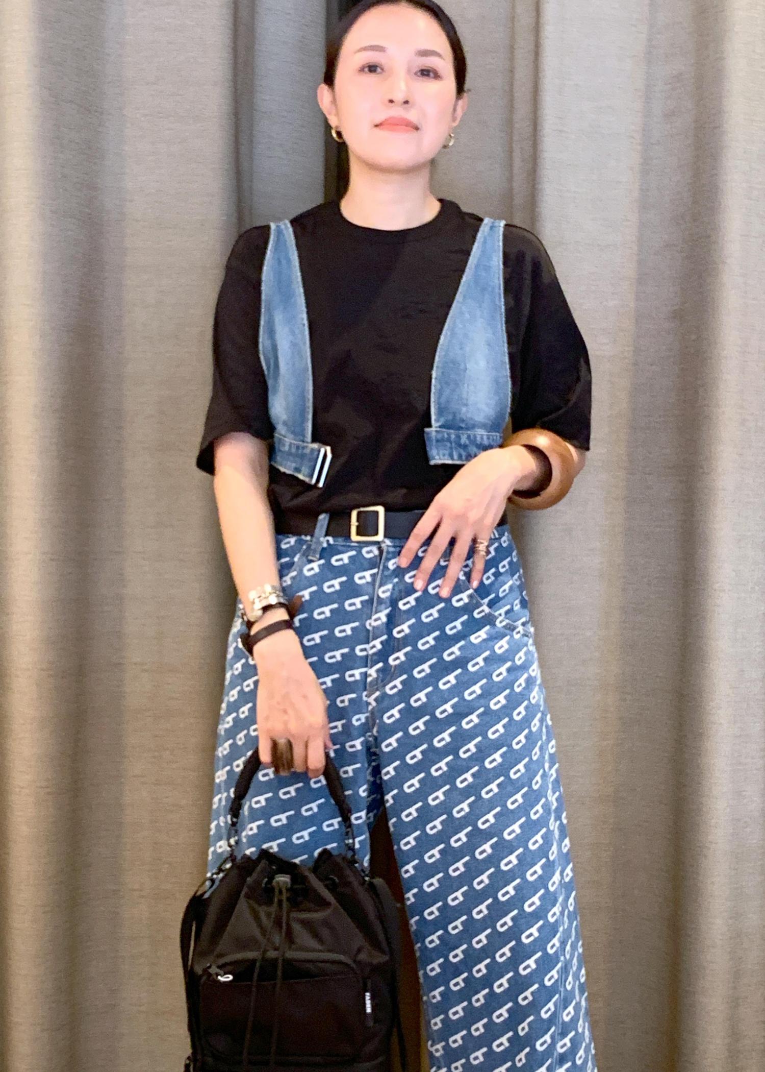 デニムのセットアップ風な組み合わせ。Tシャツに重ねたデニムはビスチェなんですけど、前も開くので羽織ってみました^ ^