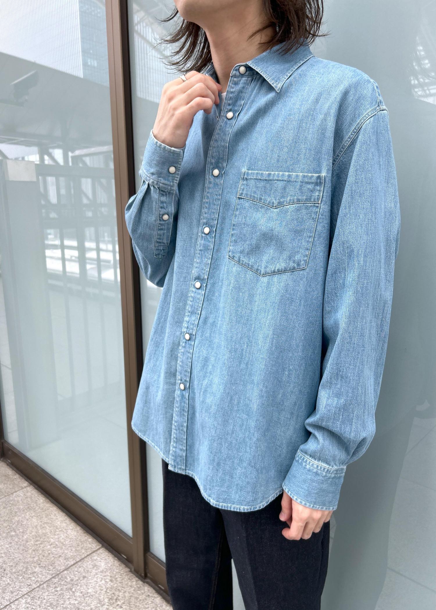 オーラリーのデニムシャツはウエスタンシャツのようなスナップボタンのタイプになっていて控えめながらもアクセントになっております。