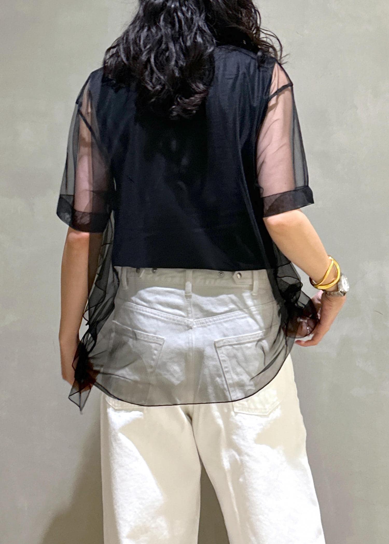 もともと、ゆったりとしたサイジングですが後ろにスナップボタンが付いておりウエストのサイズ感の変更が出来ます!165cmくらいの方で長さがほしい!って方は38もオススメです◎