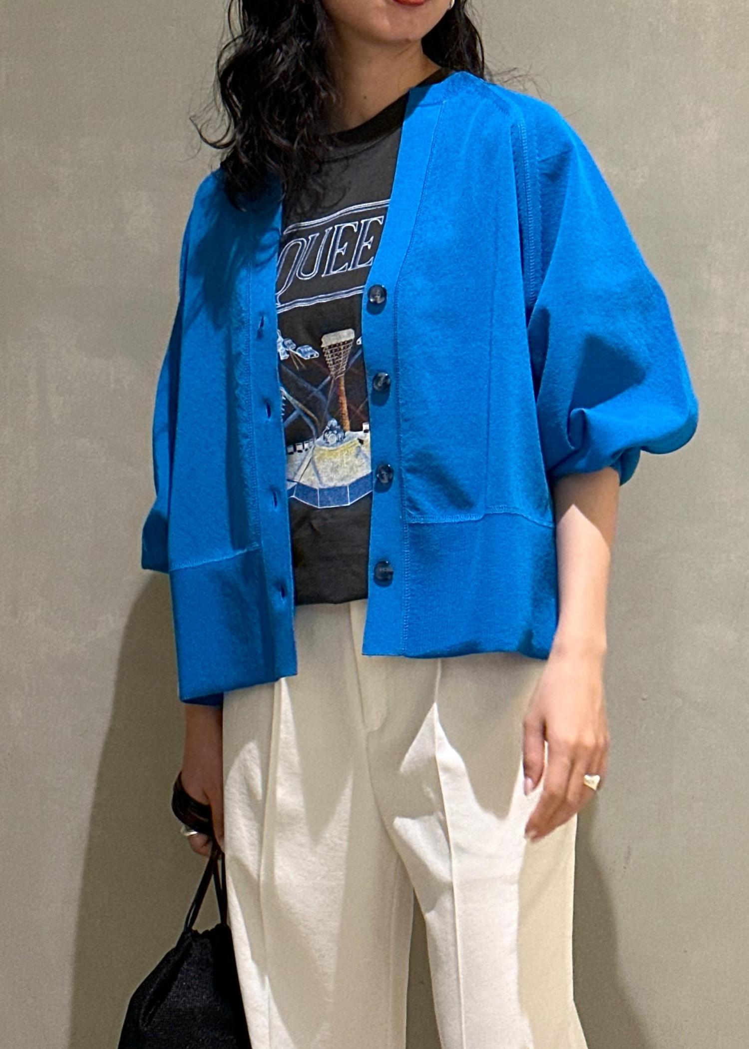 暑くなっても、室内は冷房で寒かったりで何かと羽織がいる季節。こちらのカーディガンは、ドライタッチでとても着心地が良いです!夏らしいブルーは個人的にとてもオススメです!♡