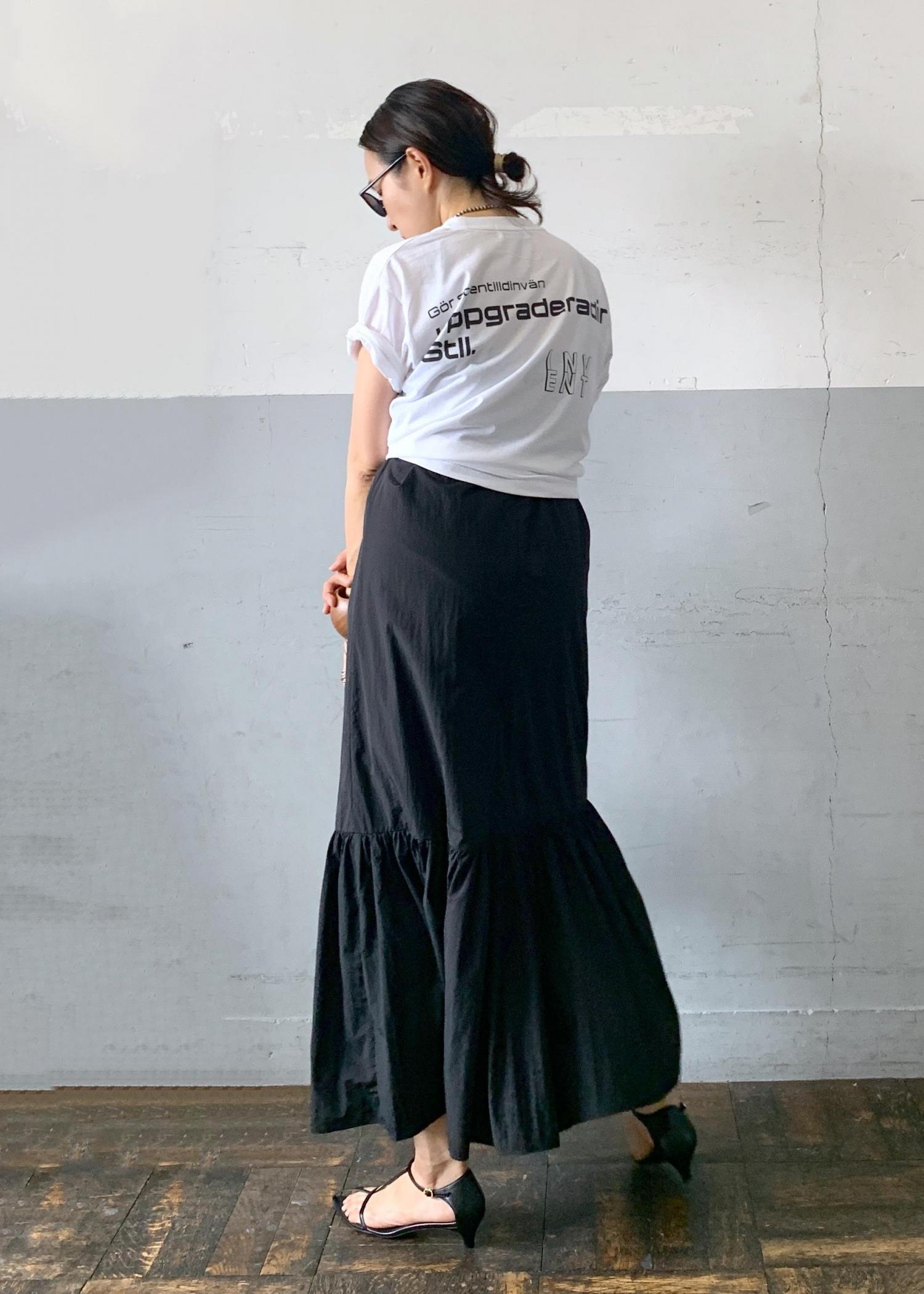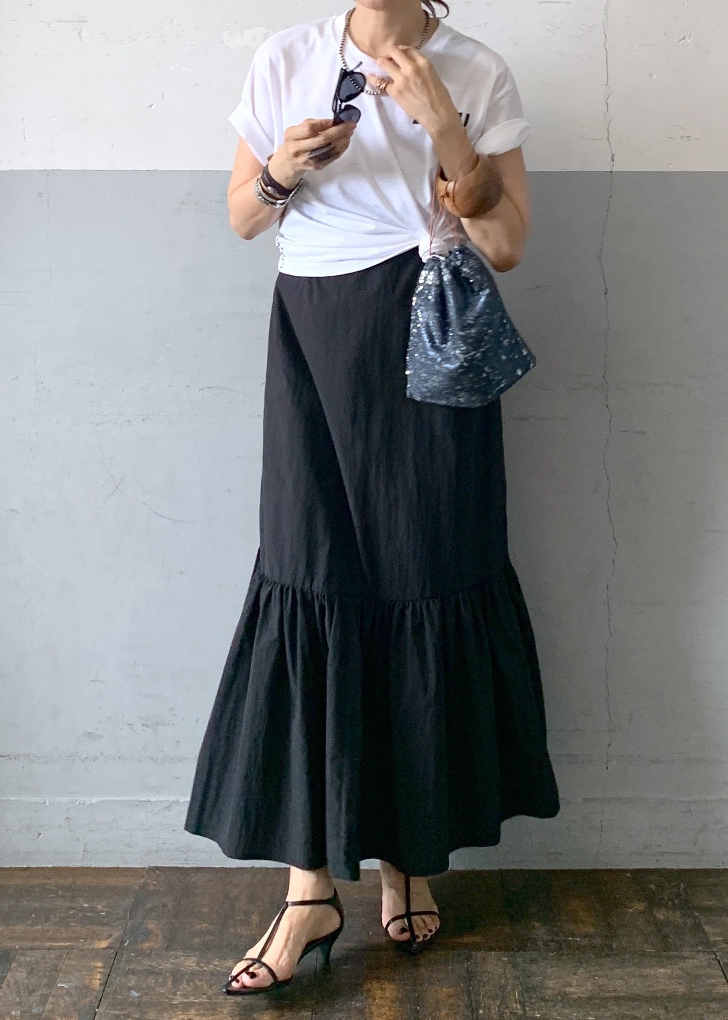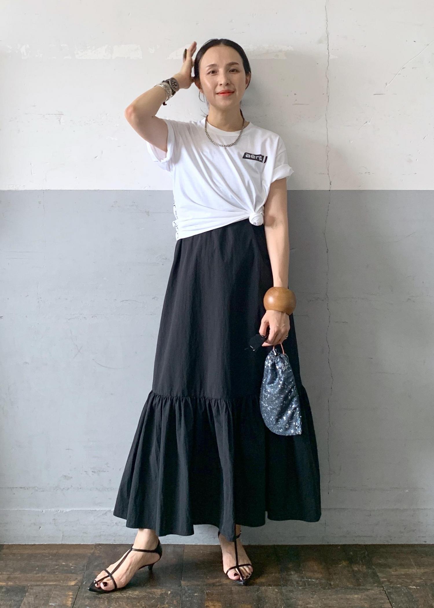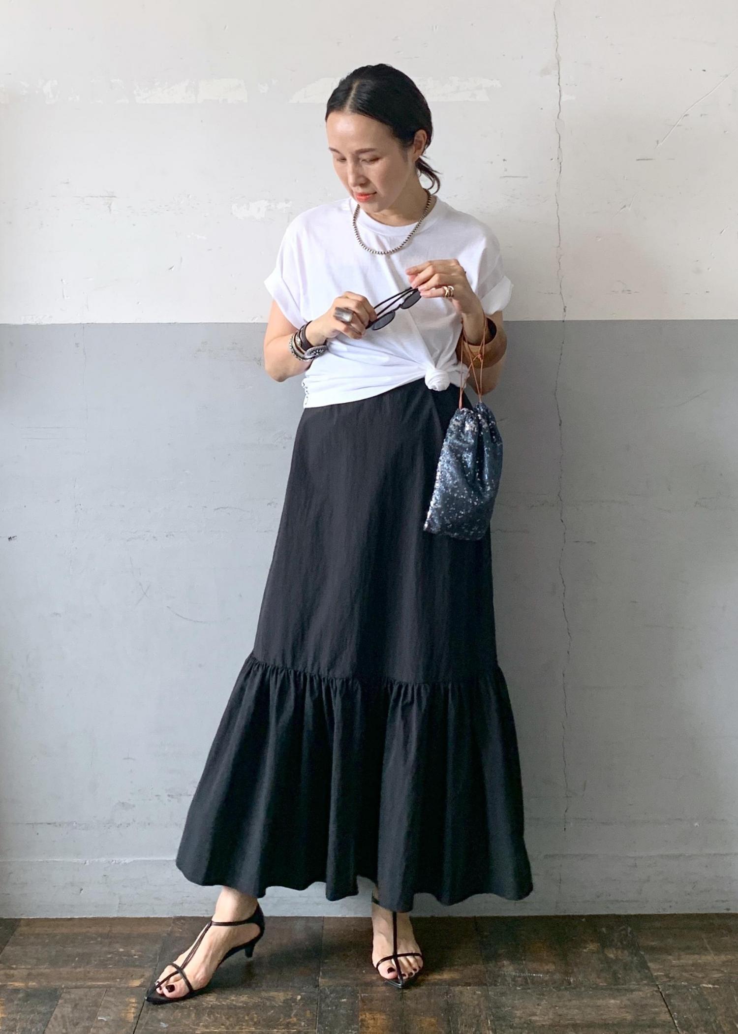 キャミワンピなので上からTシャツを重ねてもごわつかずに着やすいんですよ!ティアードスカートの部分だけでも十分可愛いのでこう言う使い方も◎