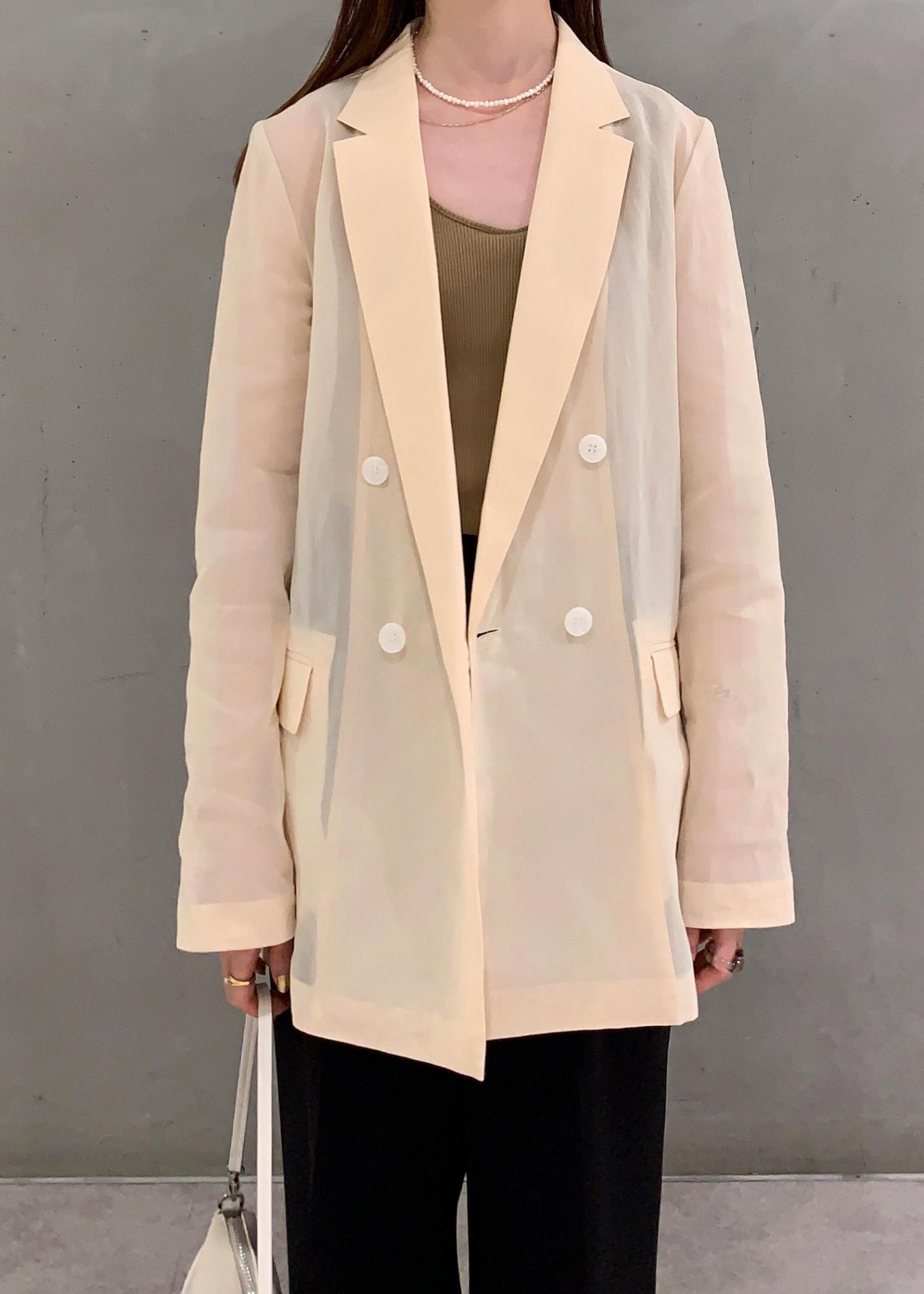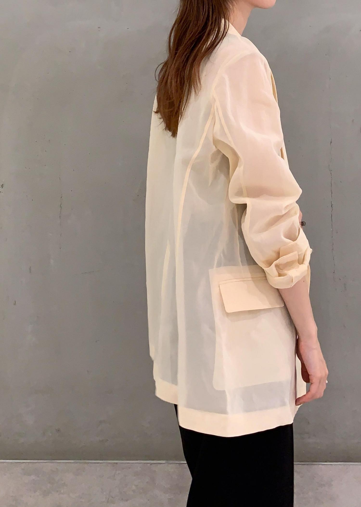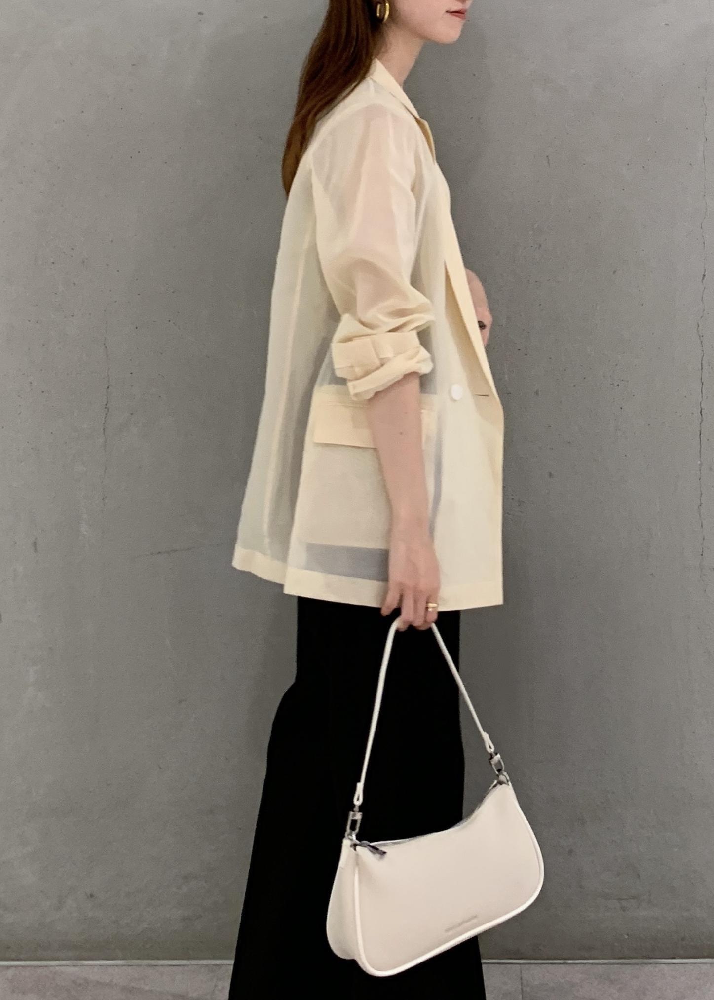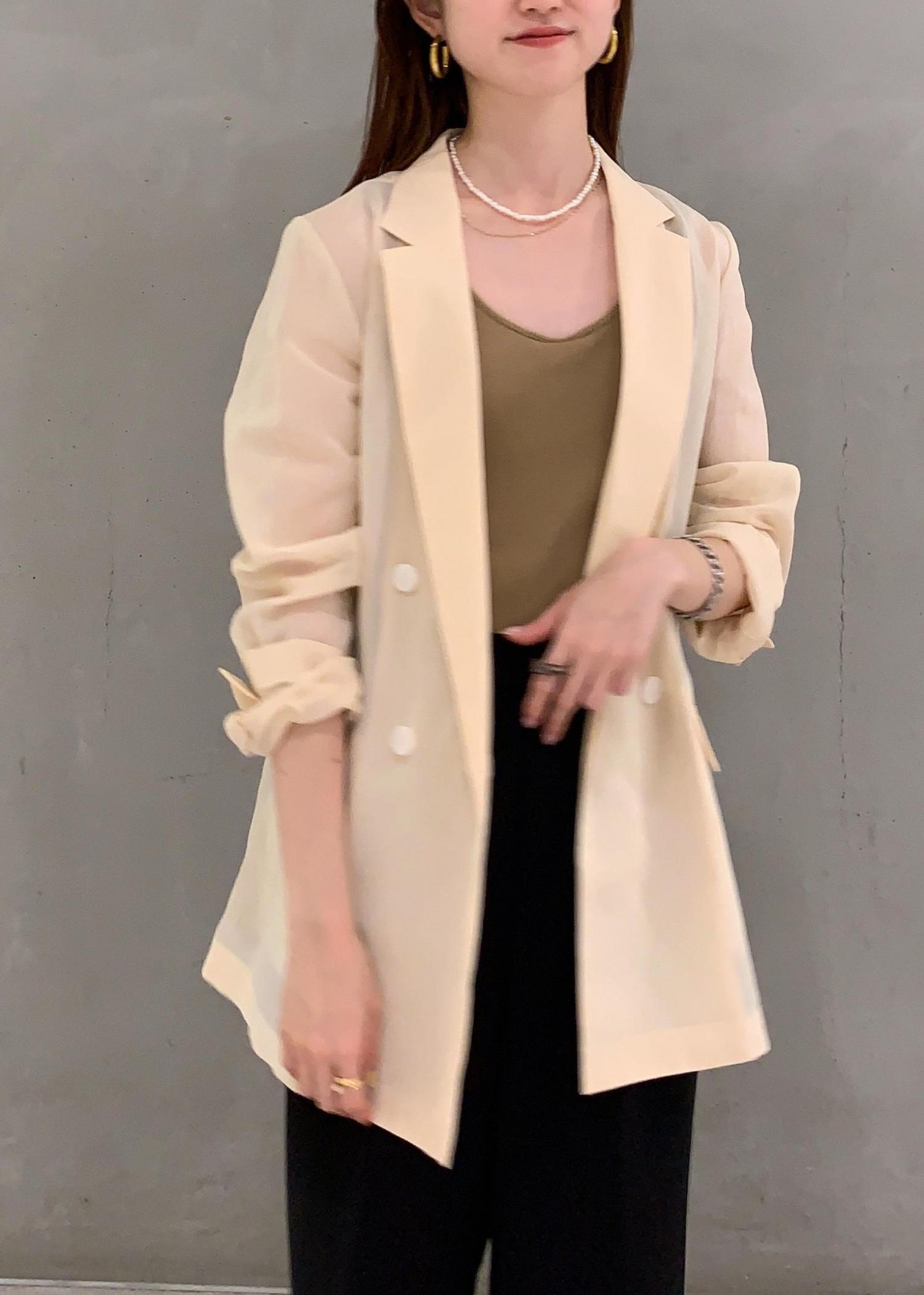形自体はクラシカルなシルエットのジャケットなので、シアーでも甘くならないのがお気に入りです。綺麗め〜カジュアルまでしっかりと着回していただけます。