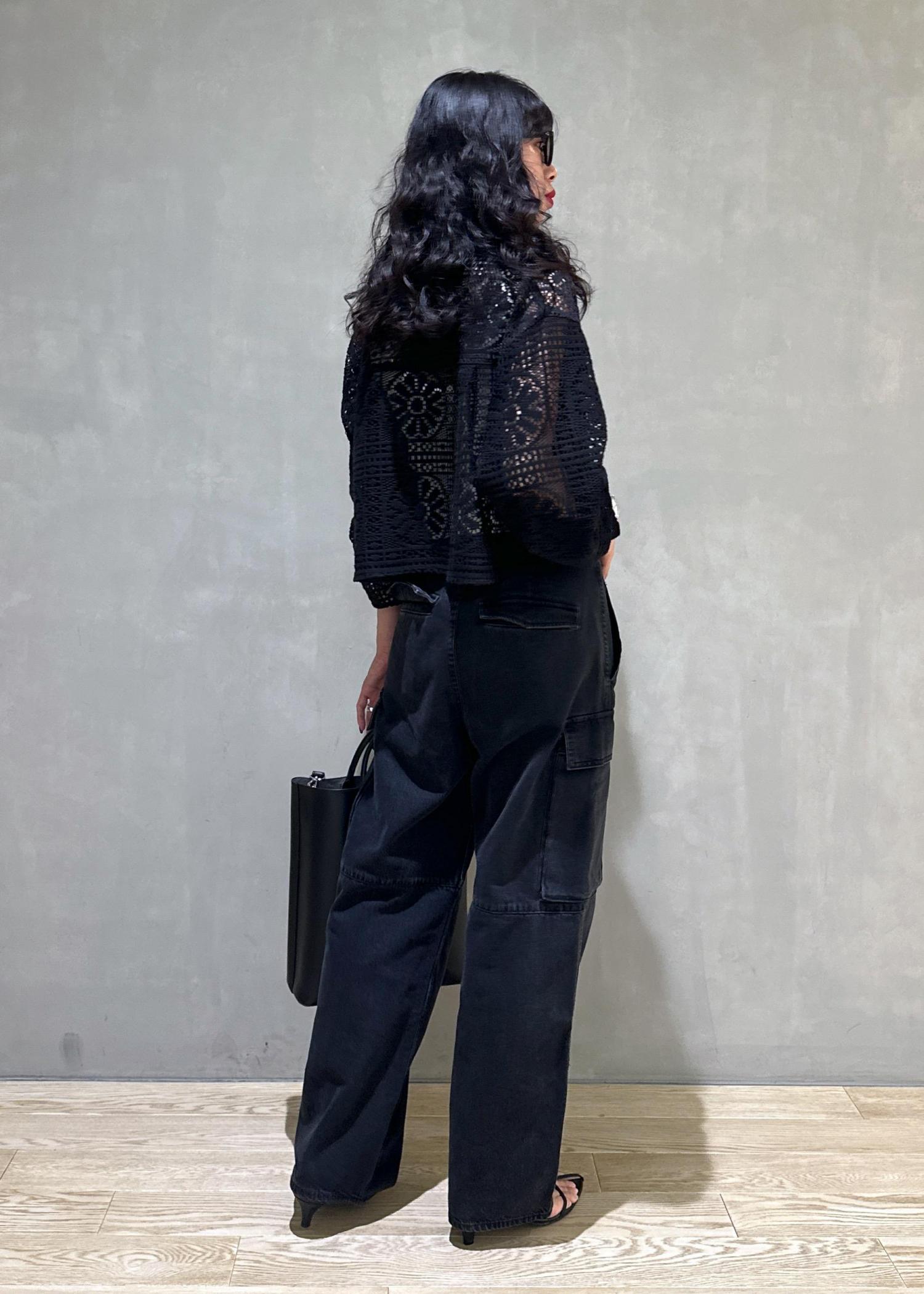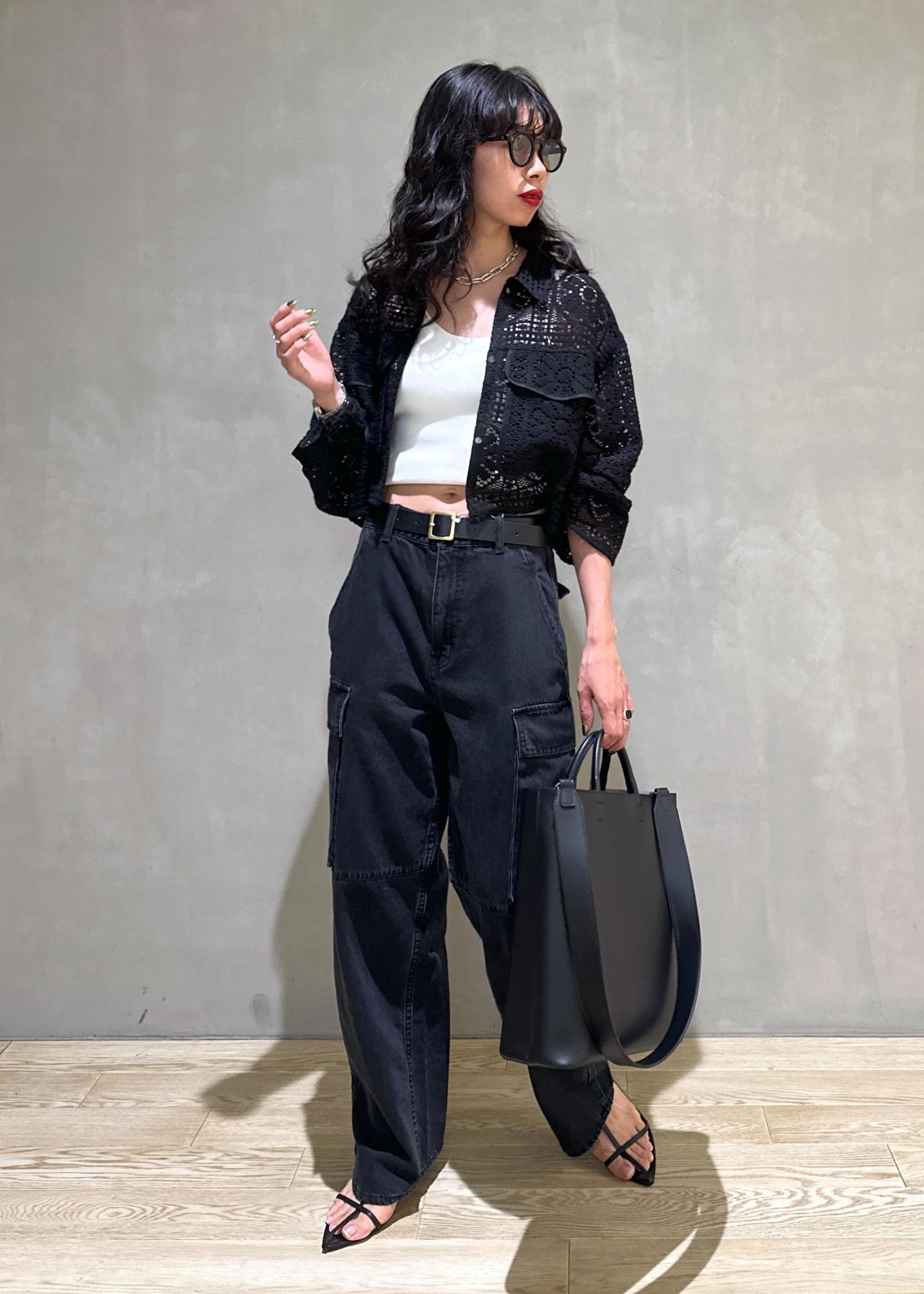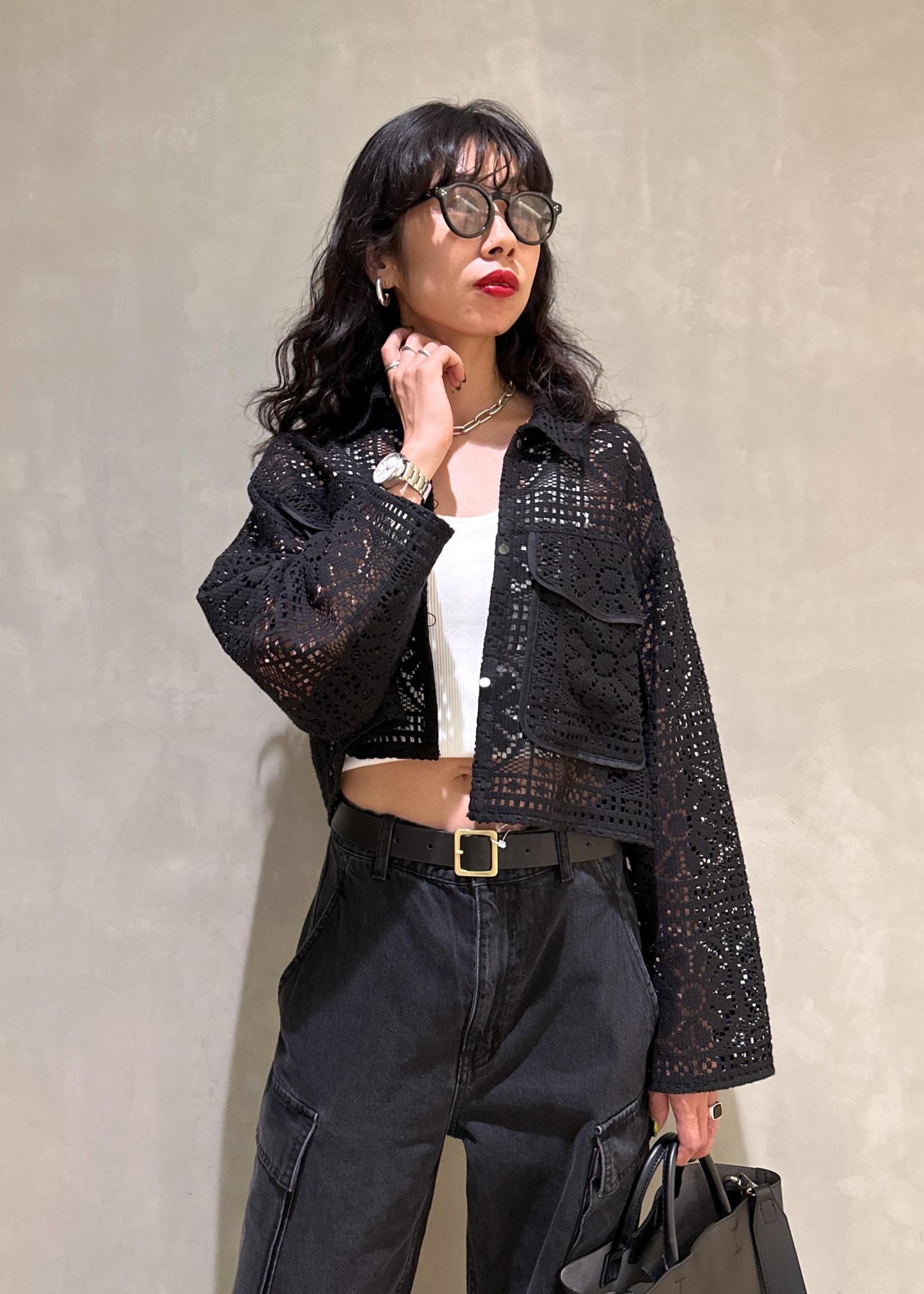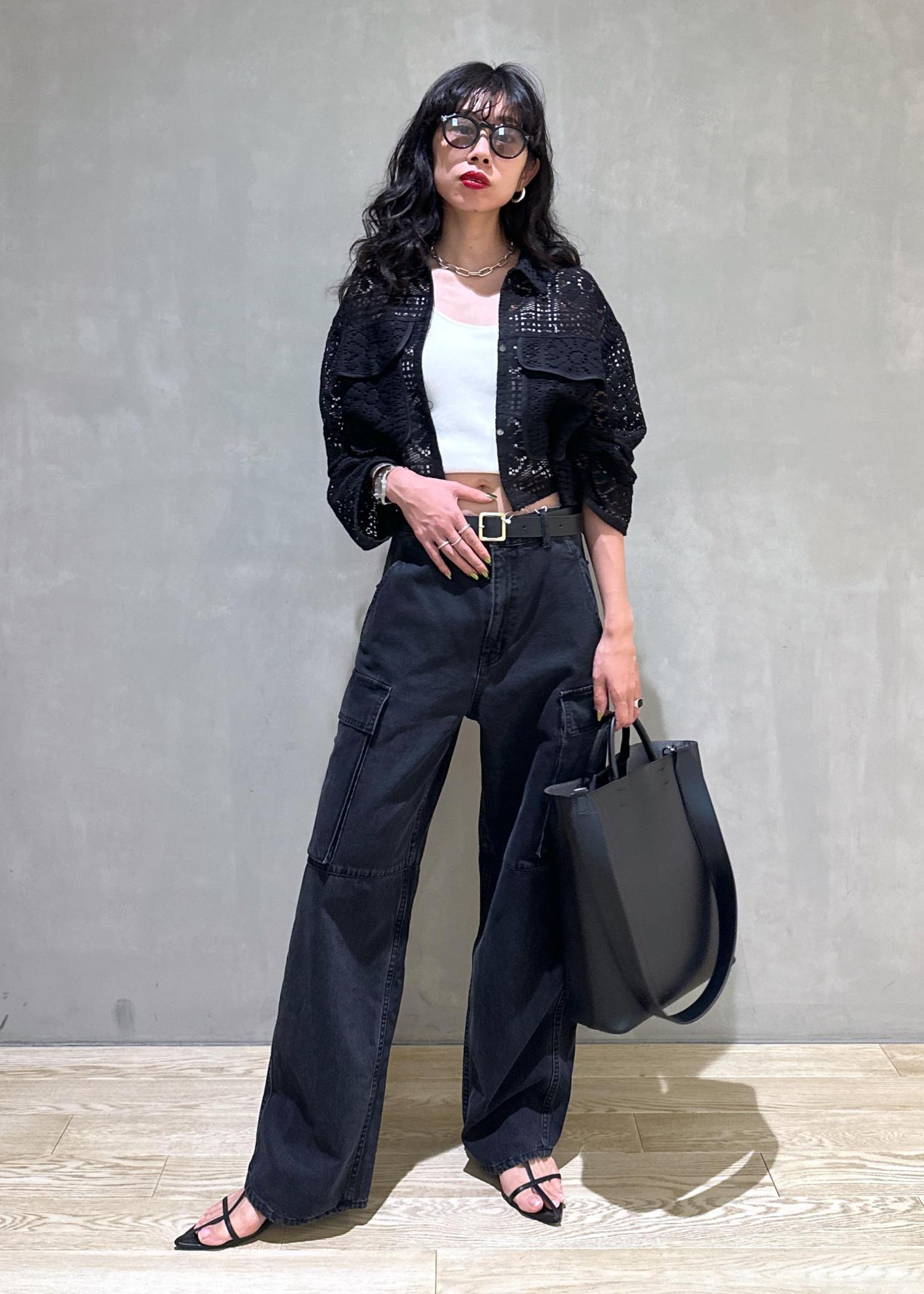 レースの透け感と、インナーを黒にすることで重たく見えず大人なスタイルに。デニムは、ややオーバーサイズで腰履きで36を着用しています!!