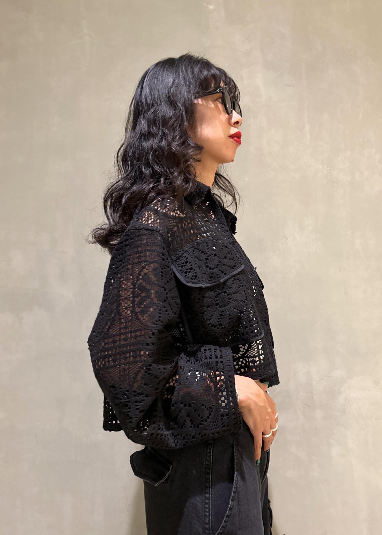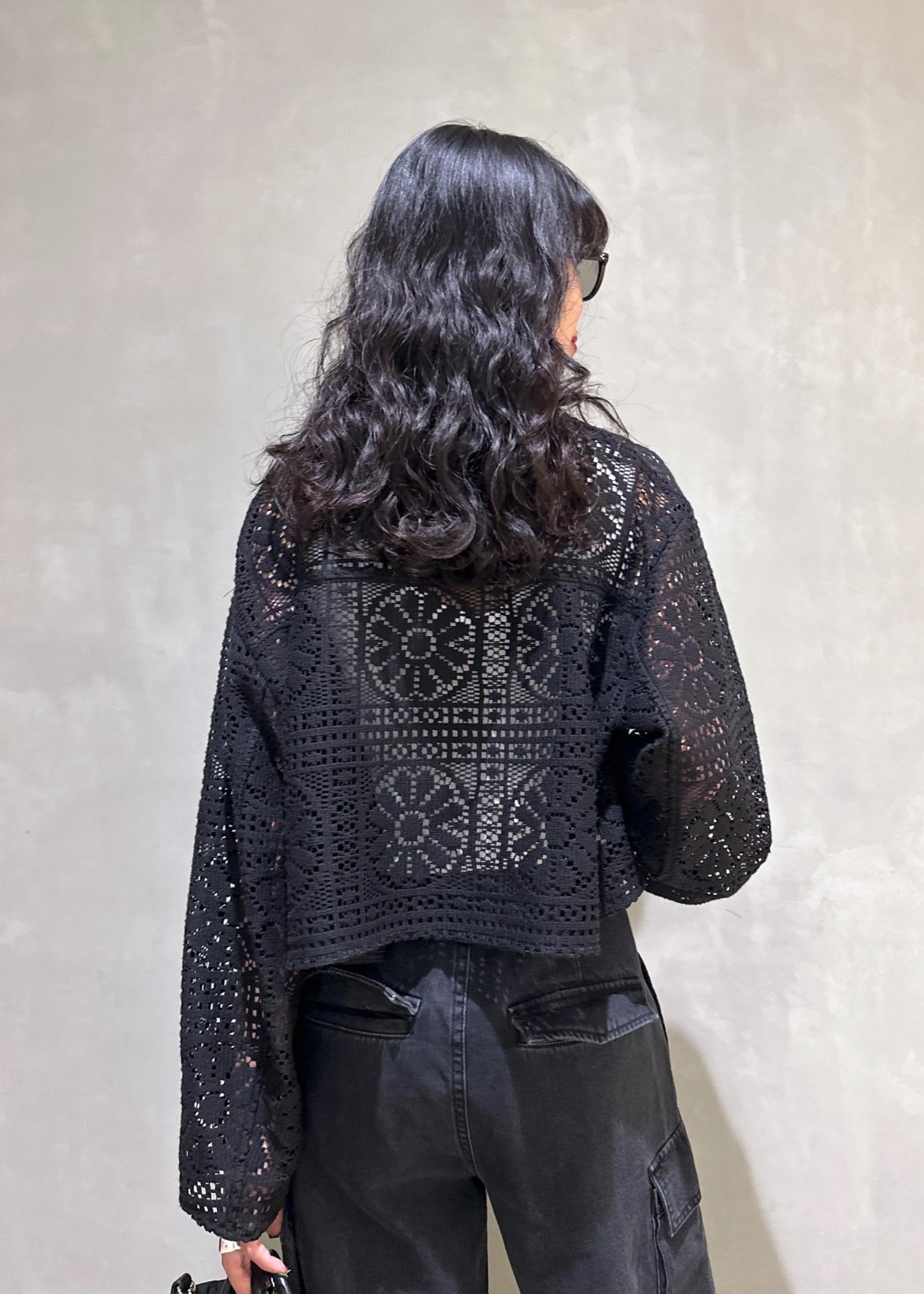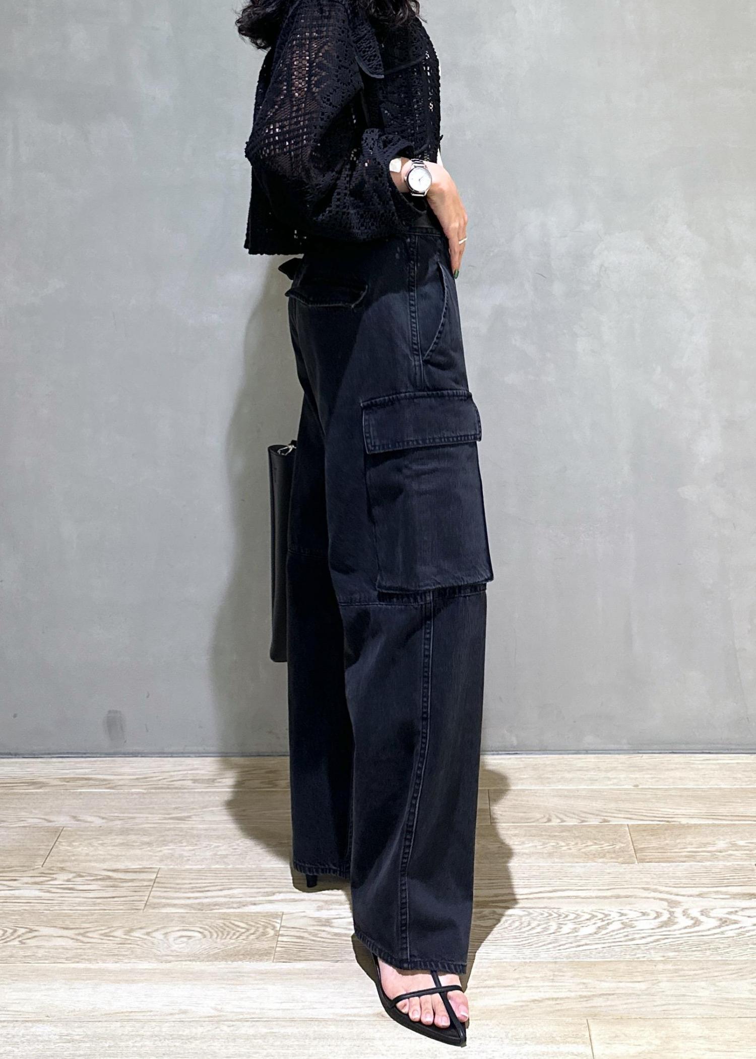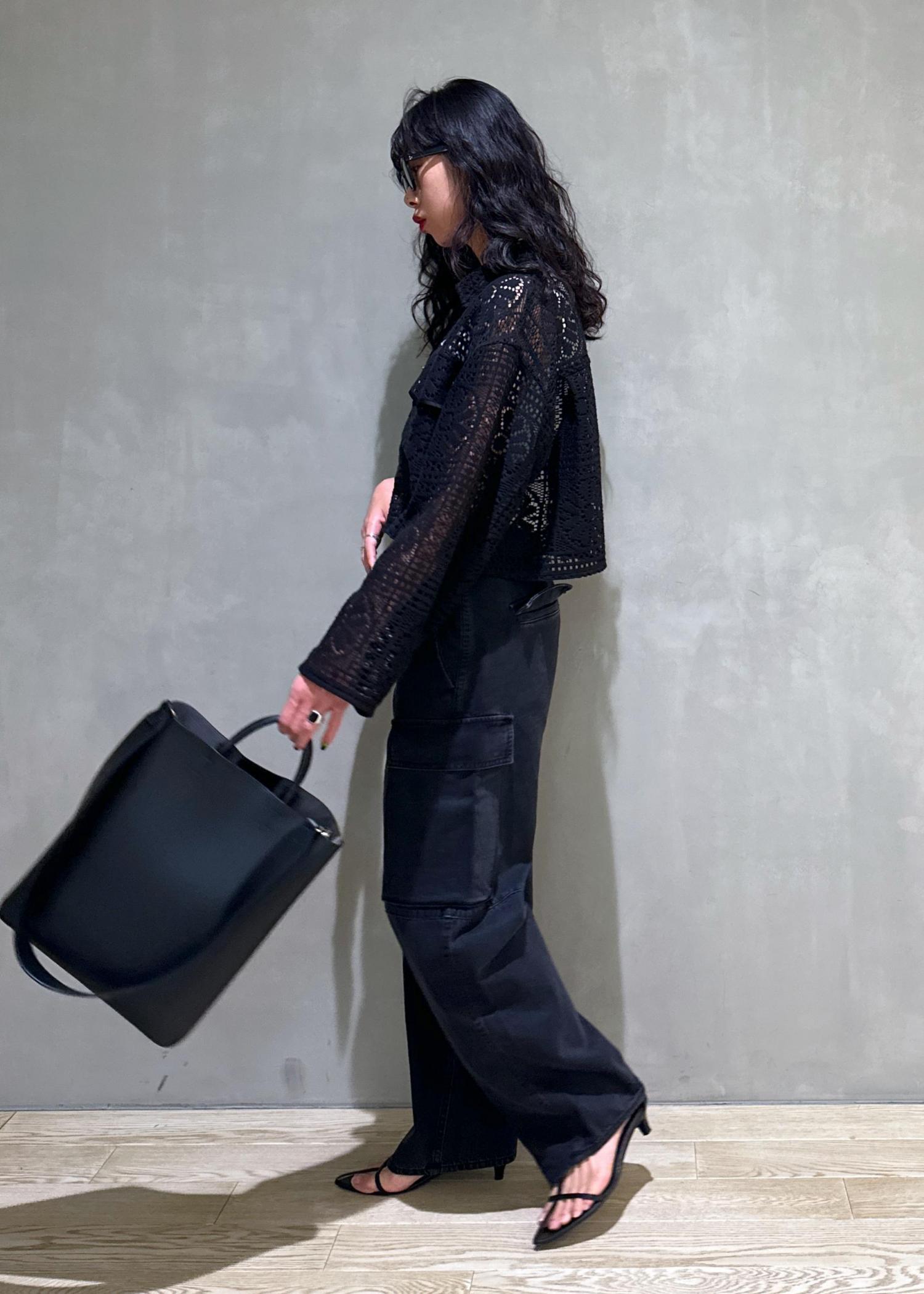 レースの透け感と、インナーを黒にすることで重たく見えず大人なスタイルに。デニムは、ややオーバーサイズで腰履きで36を着用しています!!