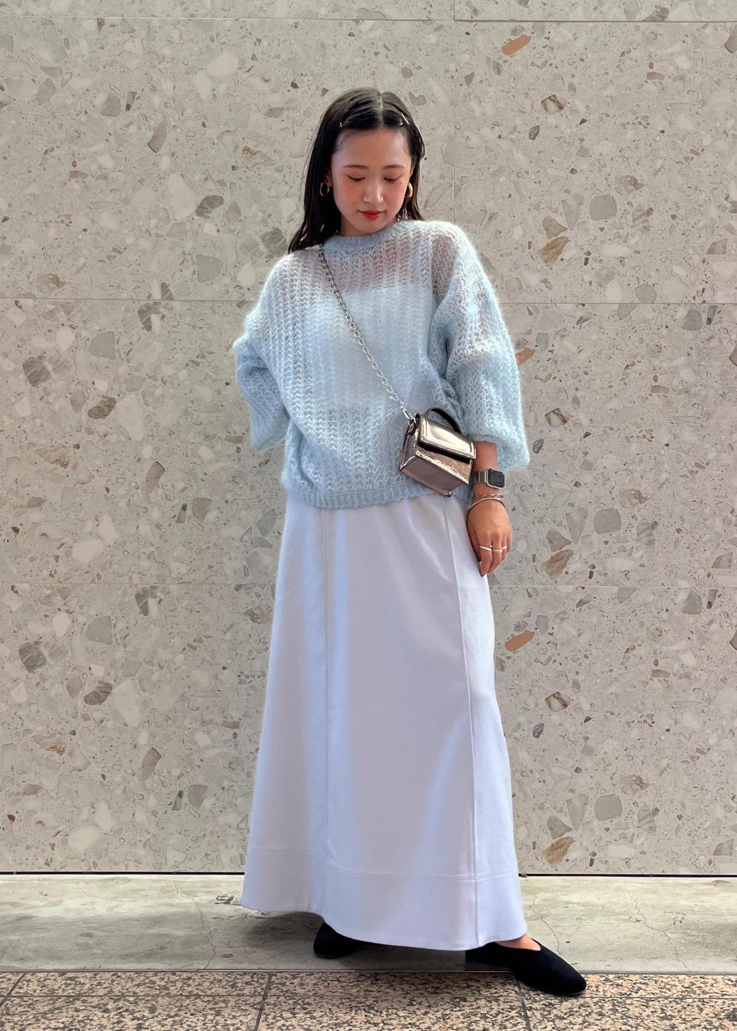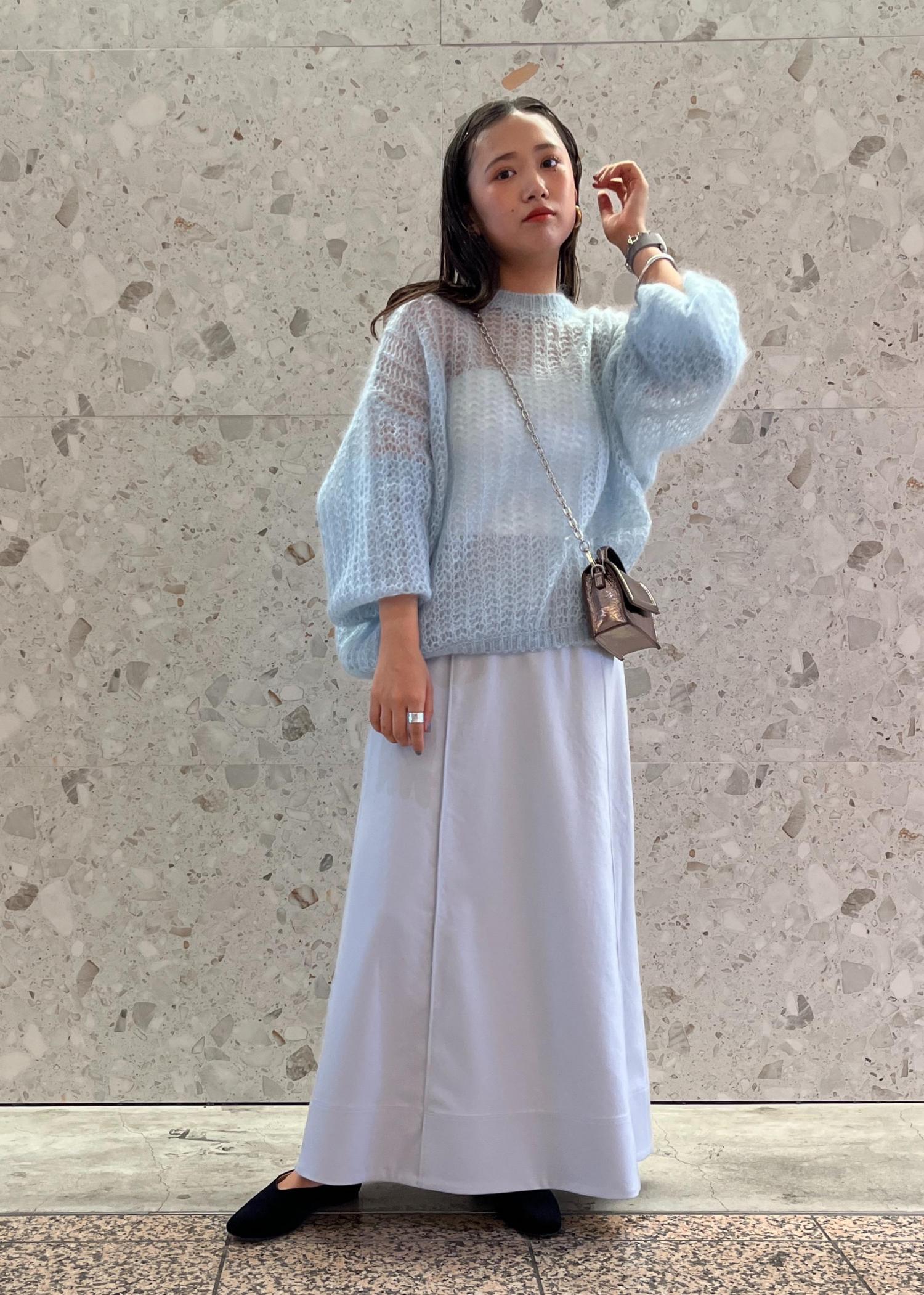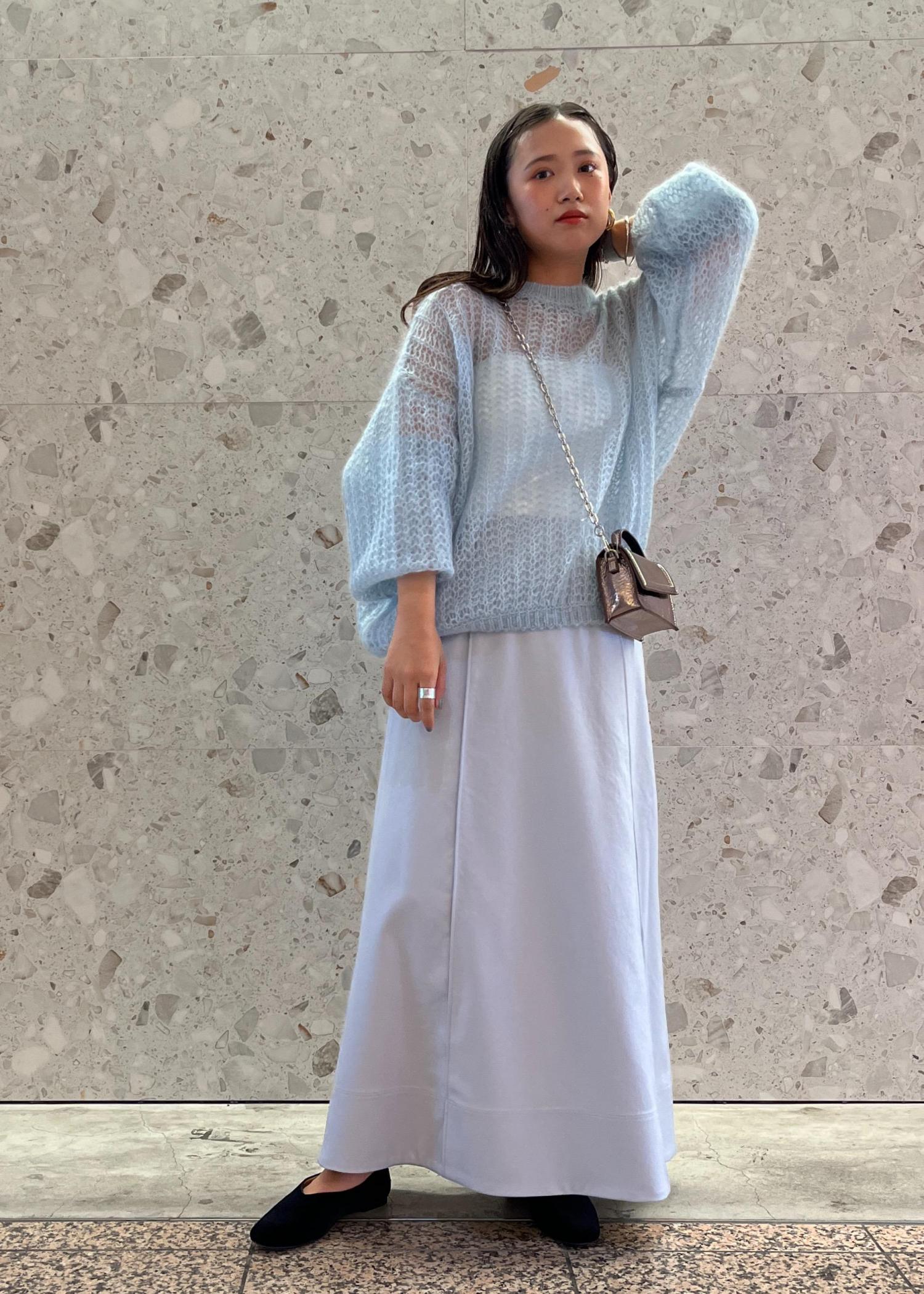 ボトムスも寒色系を合わせて統一感のあるコーデに!