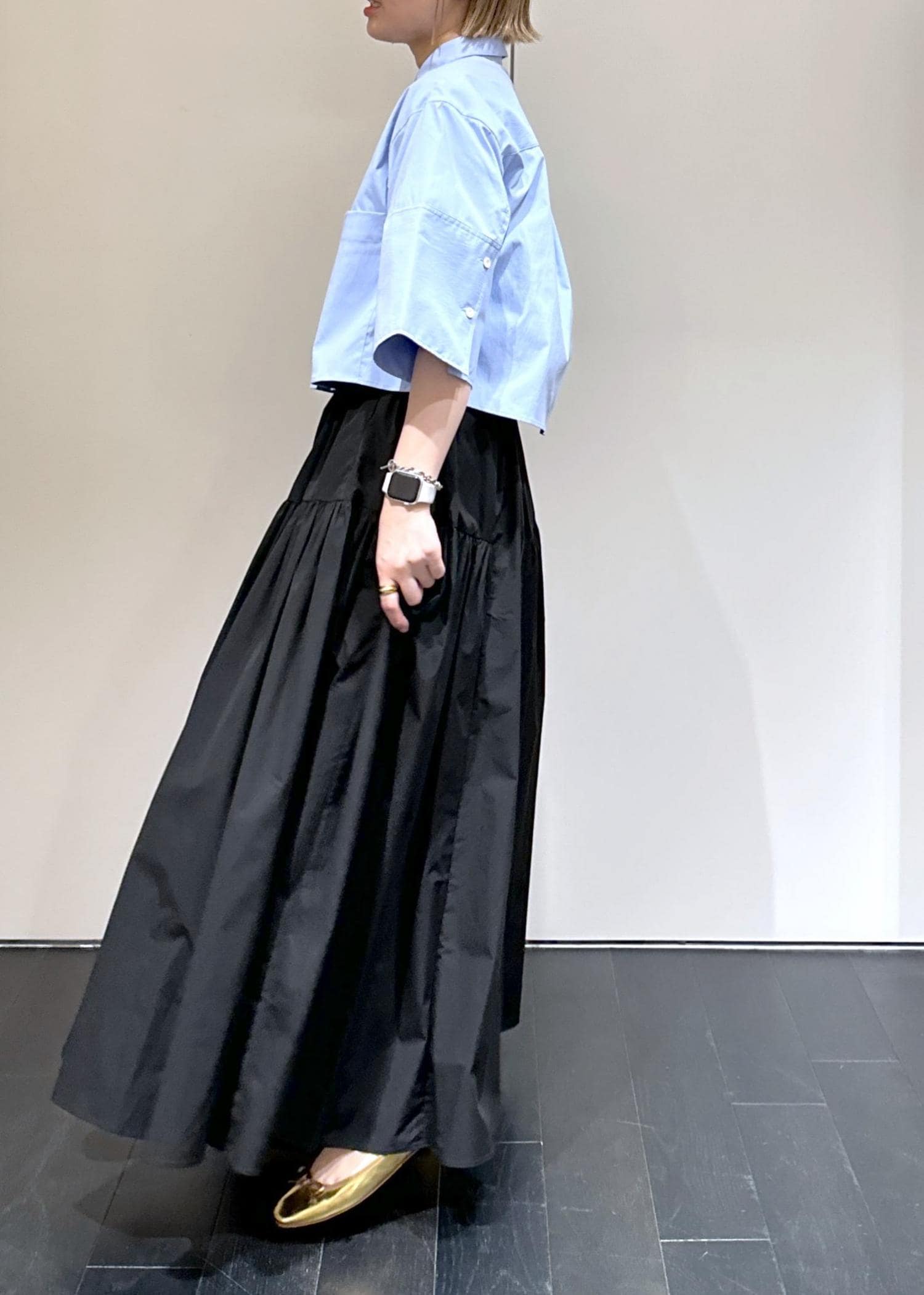 クロップド丈の為、今回のような広がるスカートとの相性も◎
