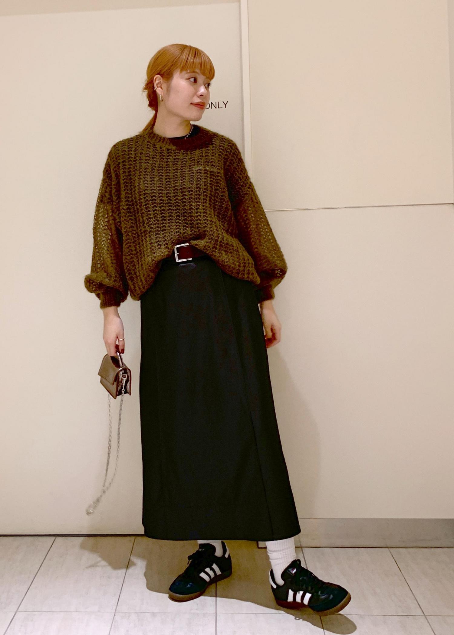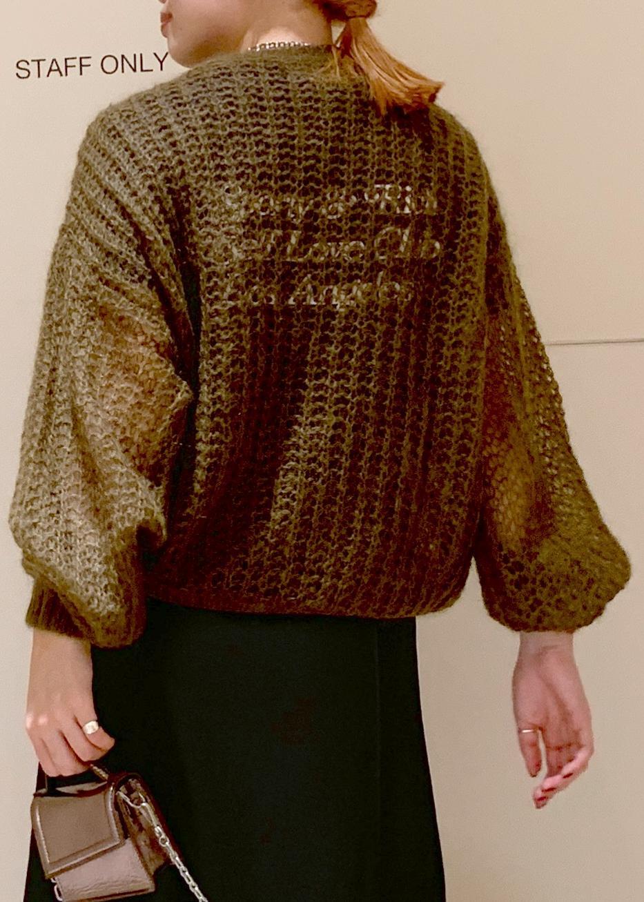 モヘヤニットの下からロゴTを合わせると、ちらっと見えるロゴが可愛いです♡
