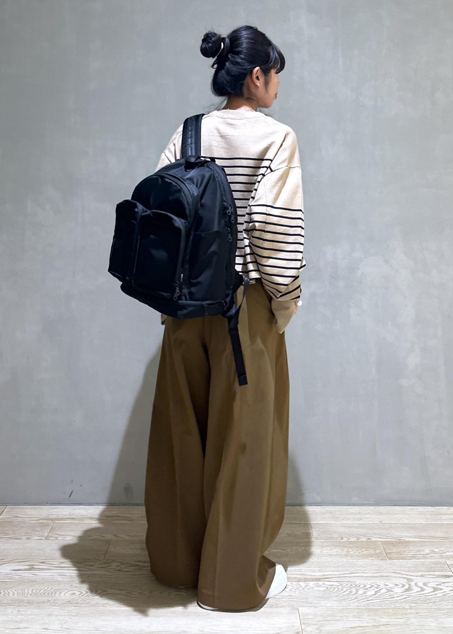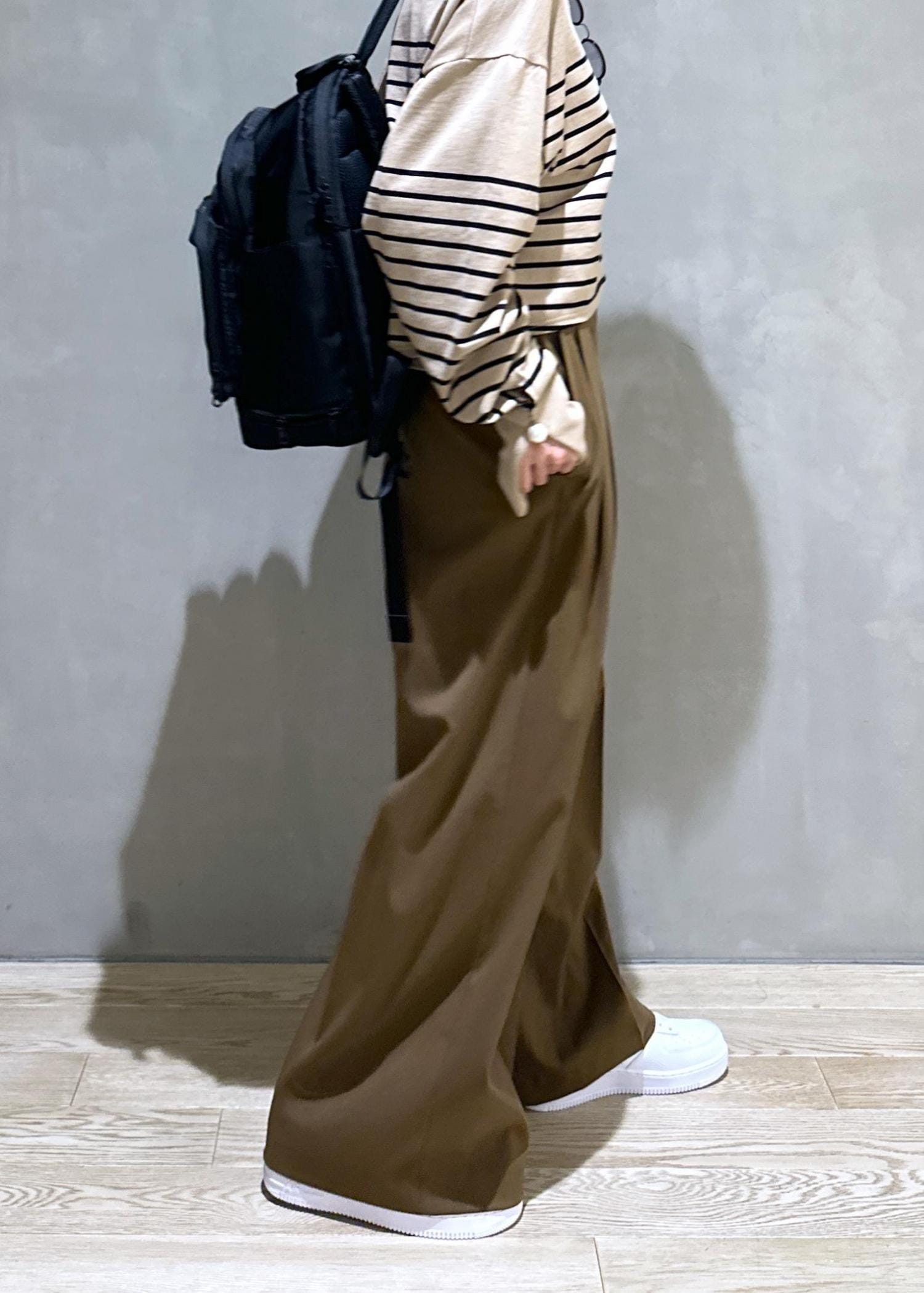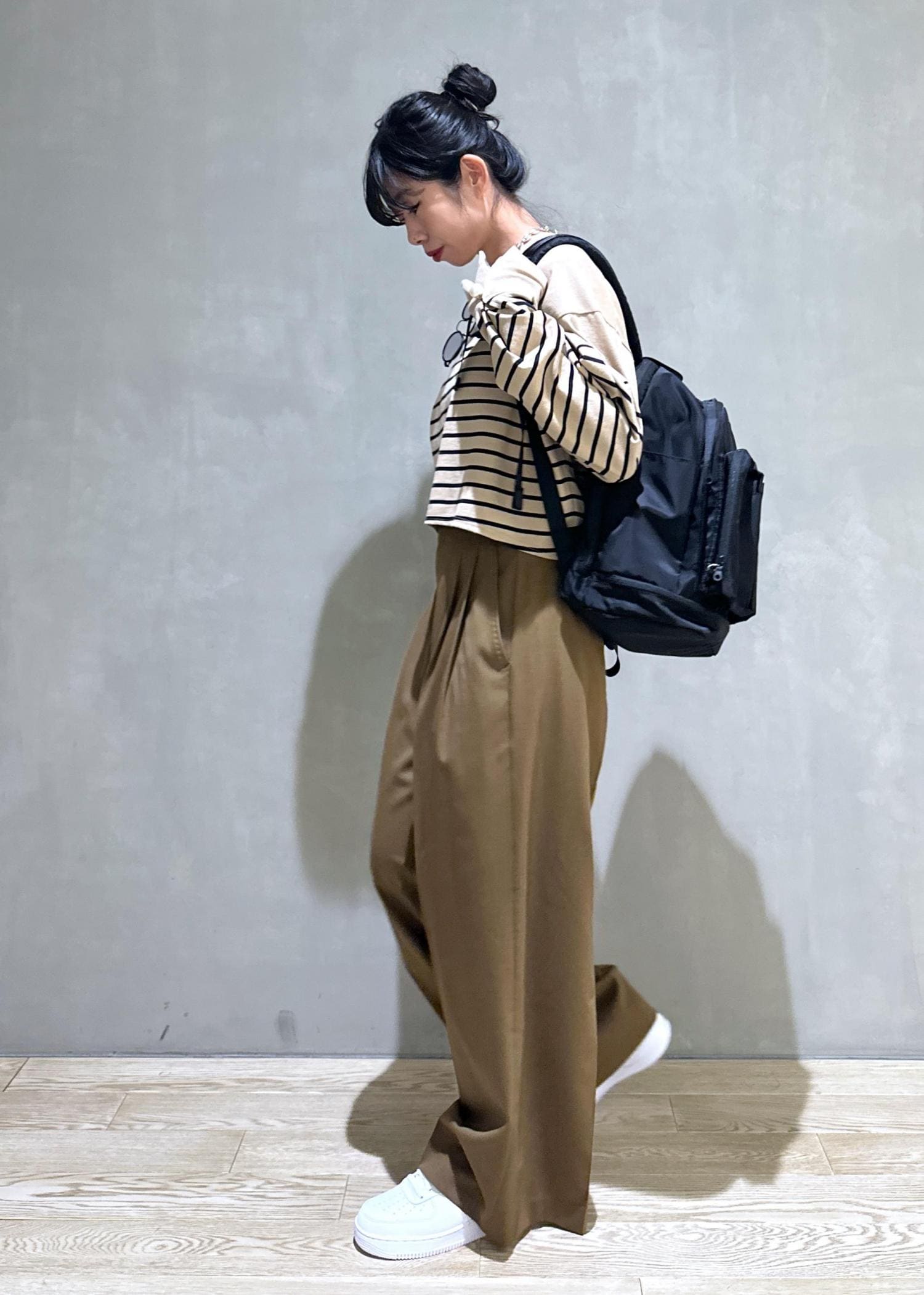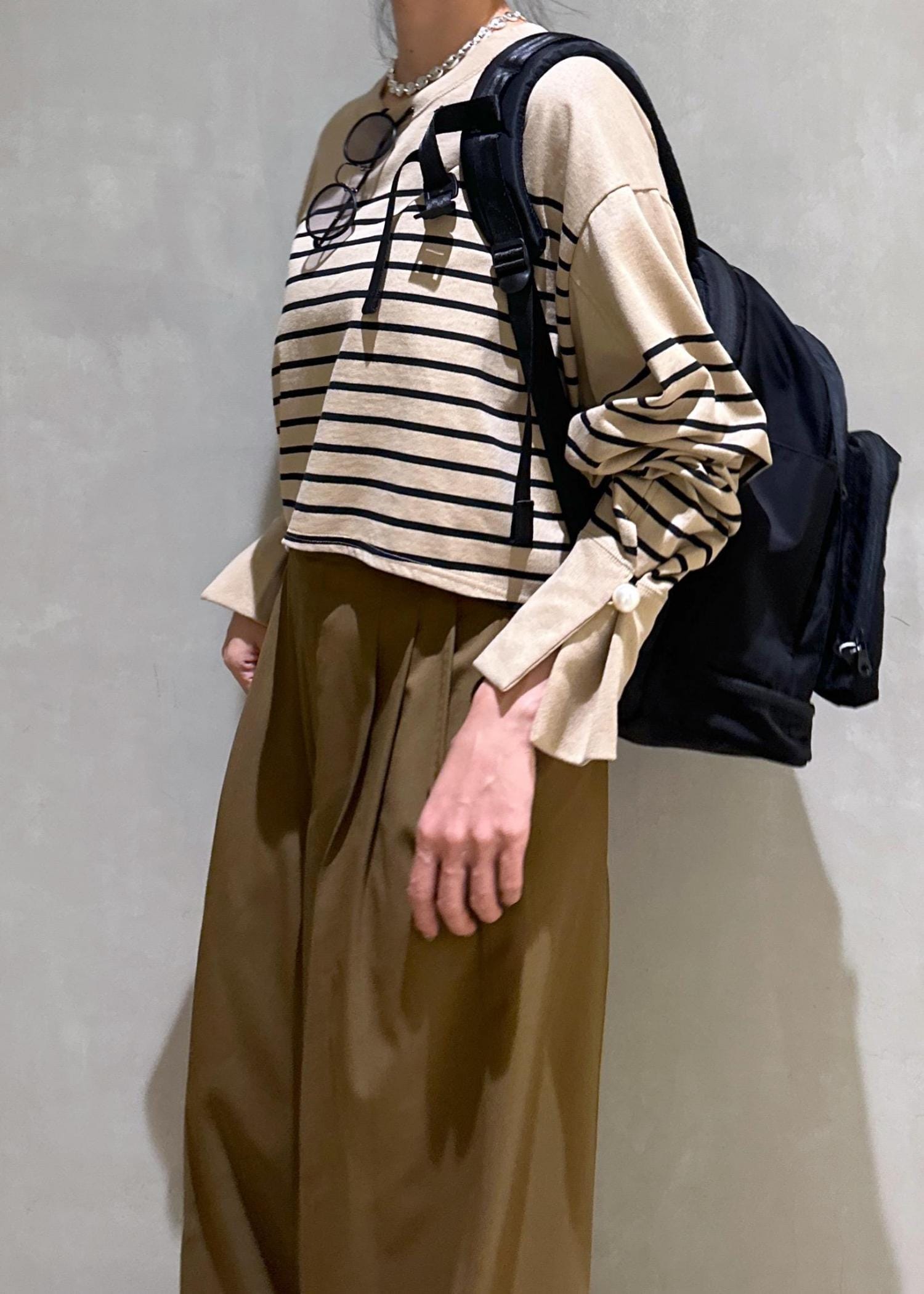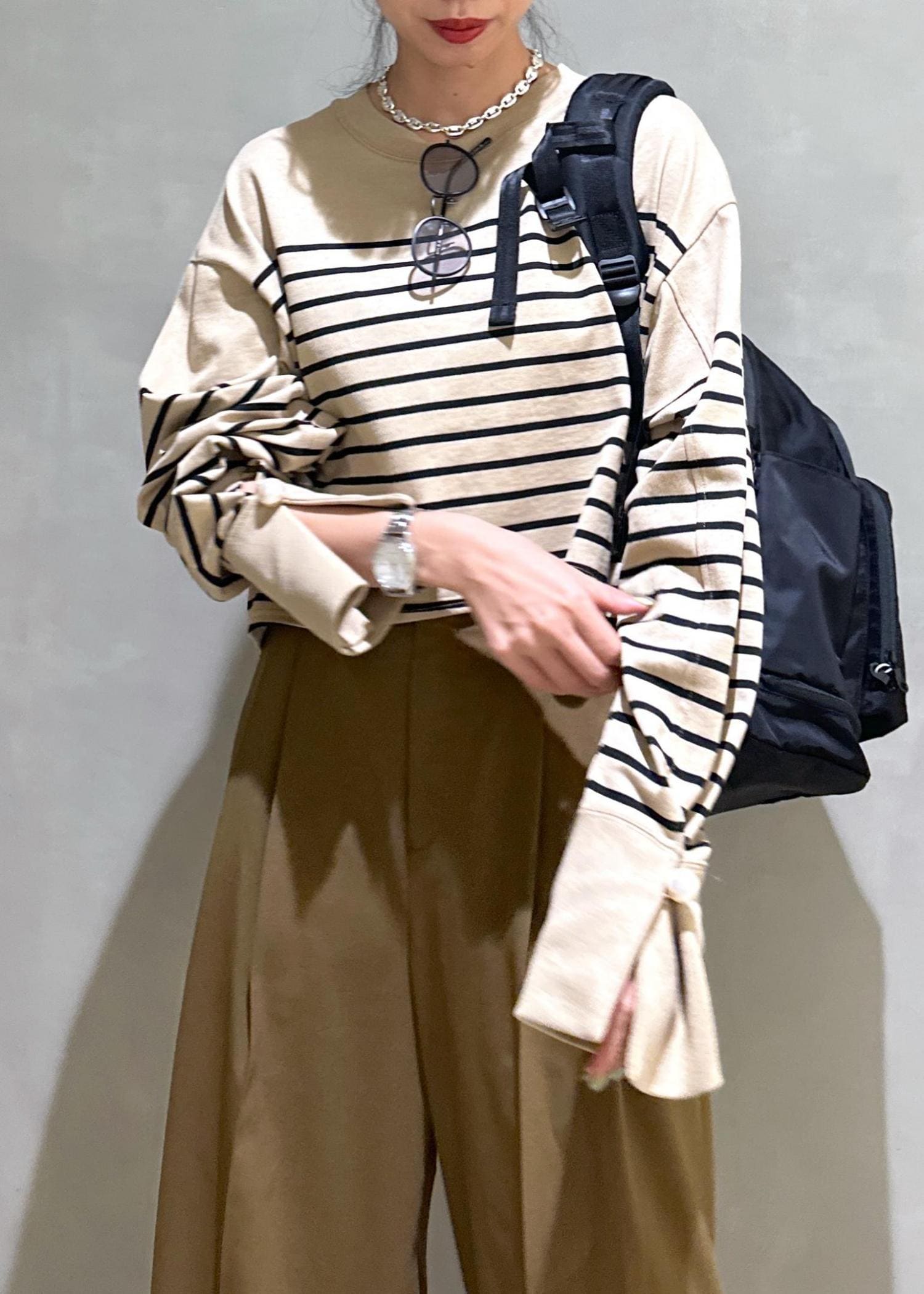 合わせたのはWEB限定アイテムのボーダートップス。スエットとカットソーの間くらいの軽めの生地感で使いやすい素材感。袖先のパールがポイントになっていてとても可愛いですよ!