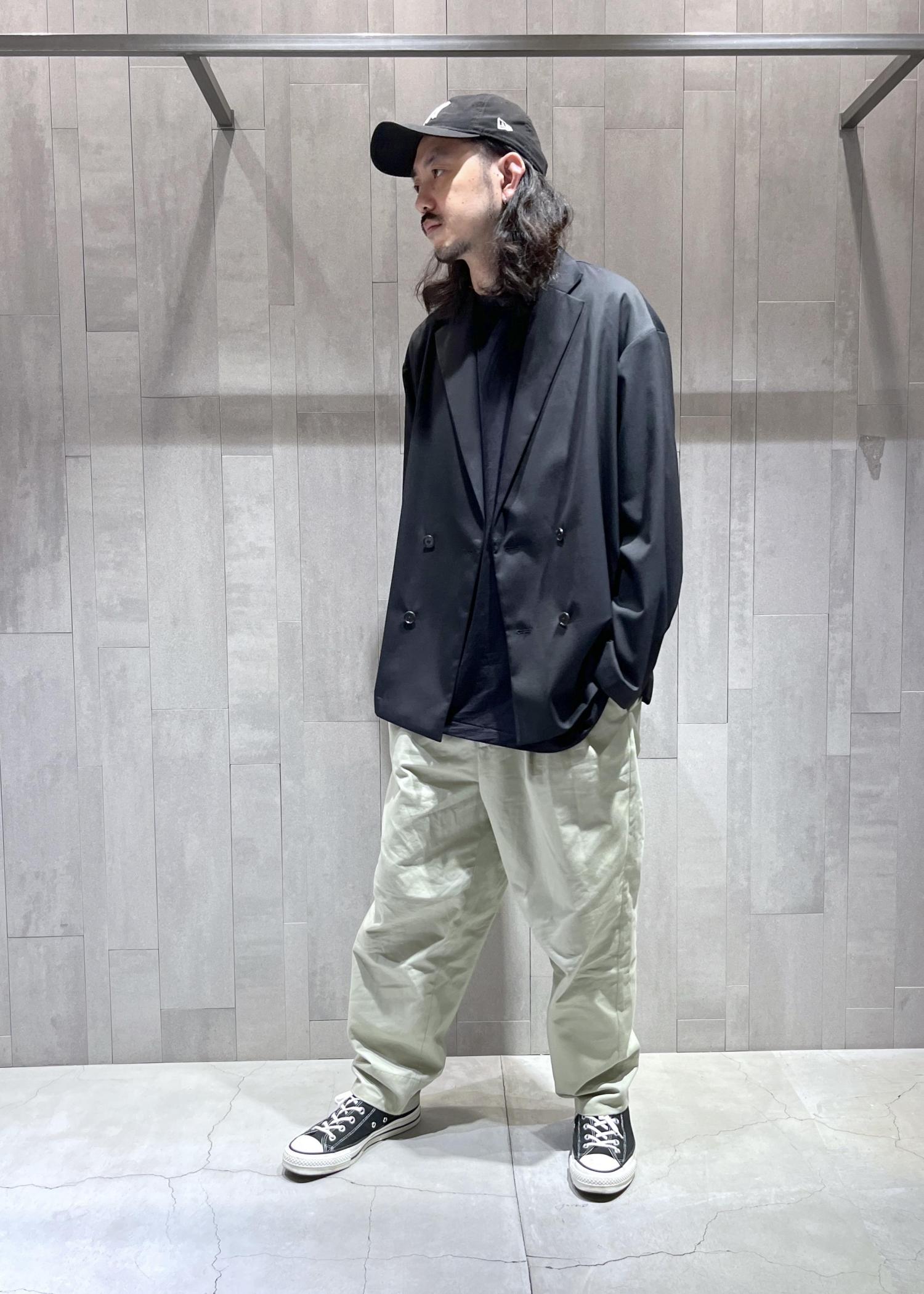 組下のパンツを合わせてセットアップでのスタイリングもいいですが、敢えてカジュアルなコットン生地のパンツとキャップ、スニーカーでカジュアルにハズしたスタイリングに。