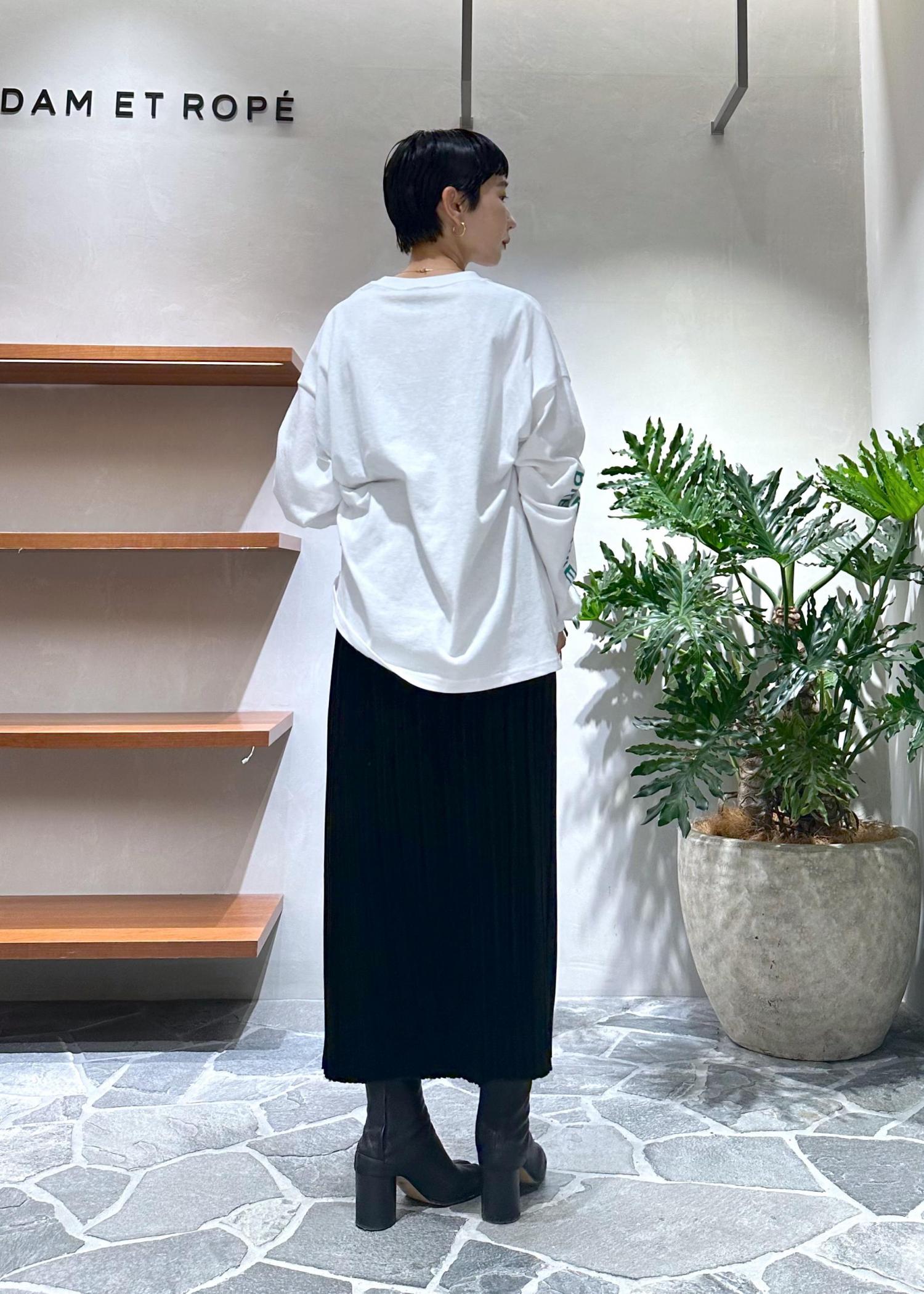 オーバーでストリート感のでるロンTなのでスカートで少し柔らかい印象に。