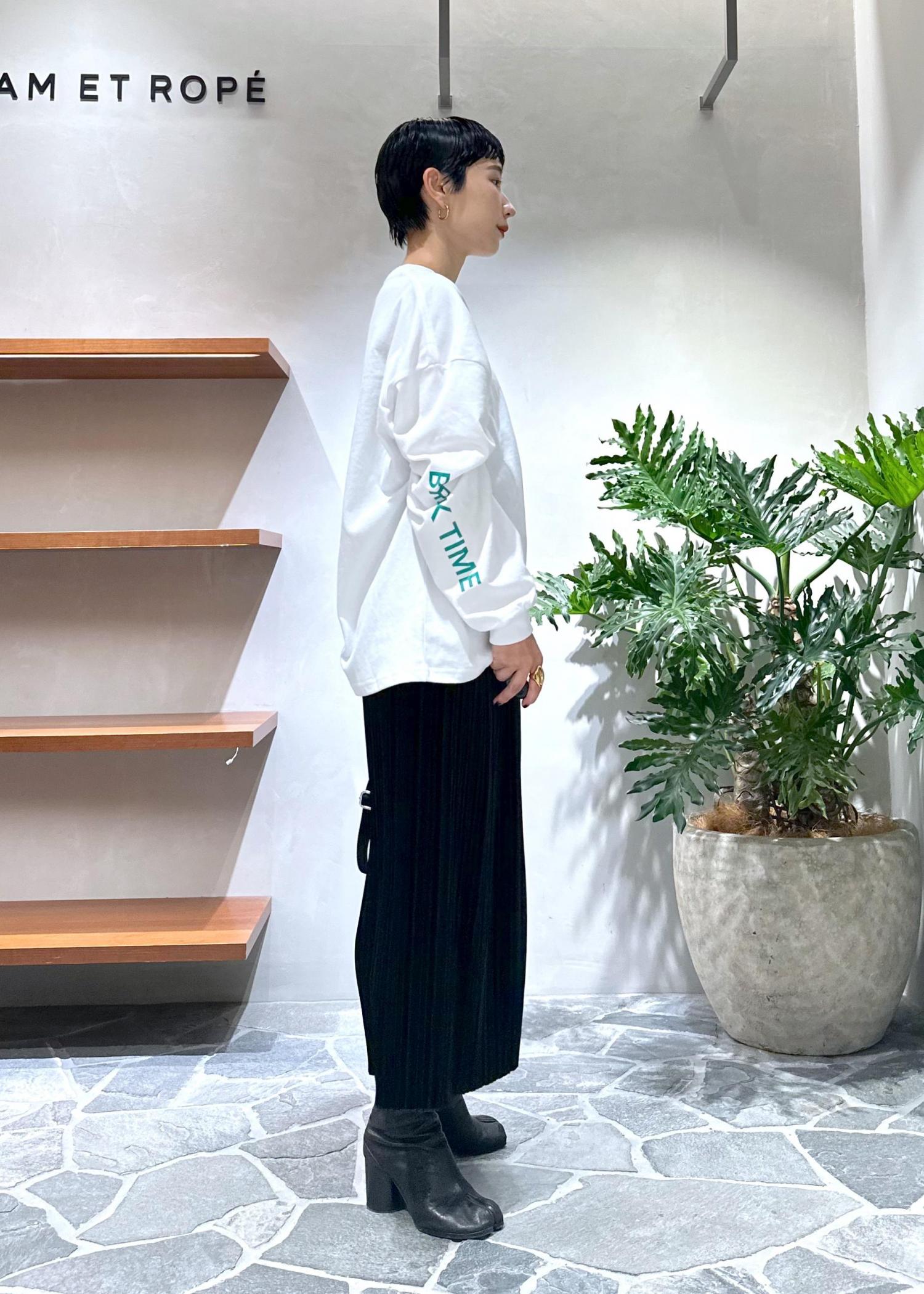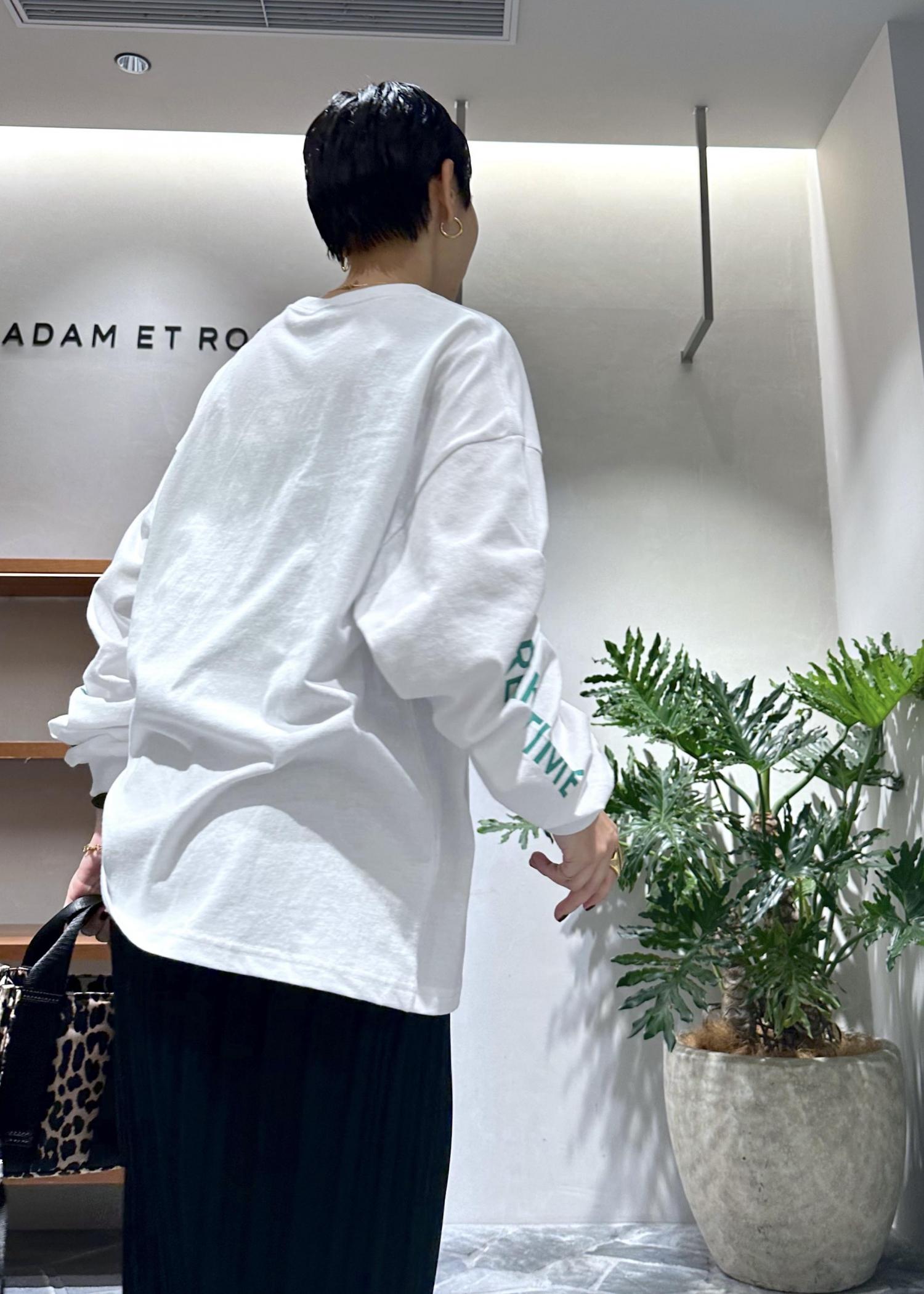 PARROTT CANVASのスリーブロゴがかわいいロングTをメインに少しキレイめなスタイリングにしてみました。