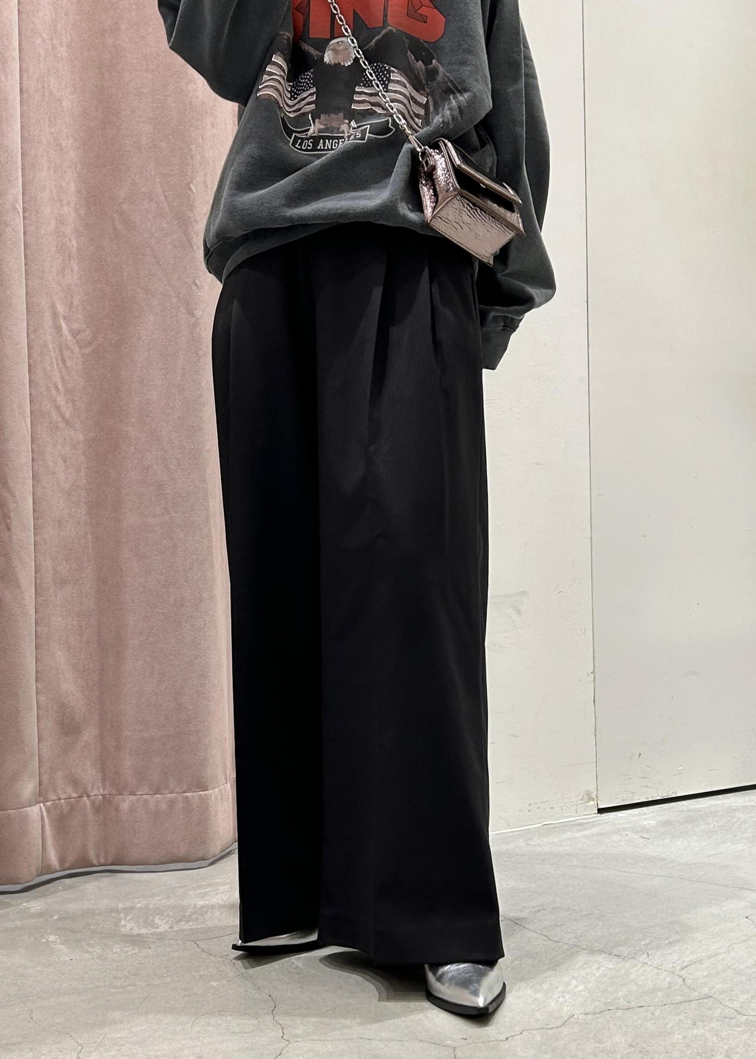 ADAM ET ROPÉ FEMME【サステナブル】2タックワイドスラックスブラック / 36¥18,700レビュー156cmで36サイズを着用しています。ウエストはサイドのベルトで調整可能です。丈は少し引きずるため、厚底の靴を合わせています。気になる方は丈つめがおすすめです。2タックでボリュームがあり、迫力のあるシルエットです。