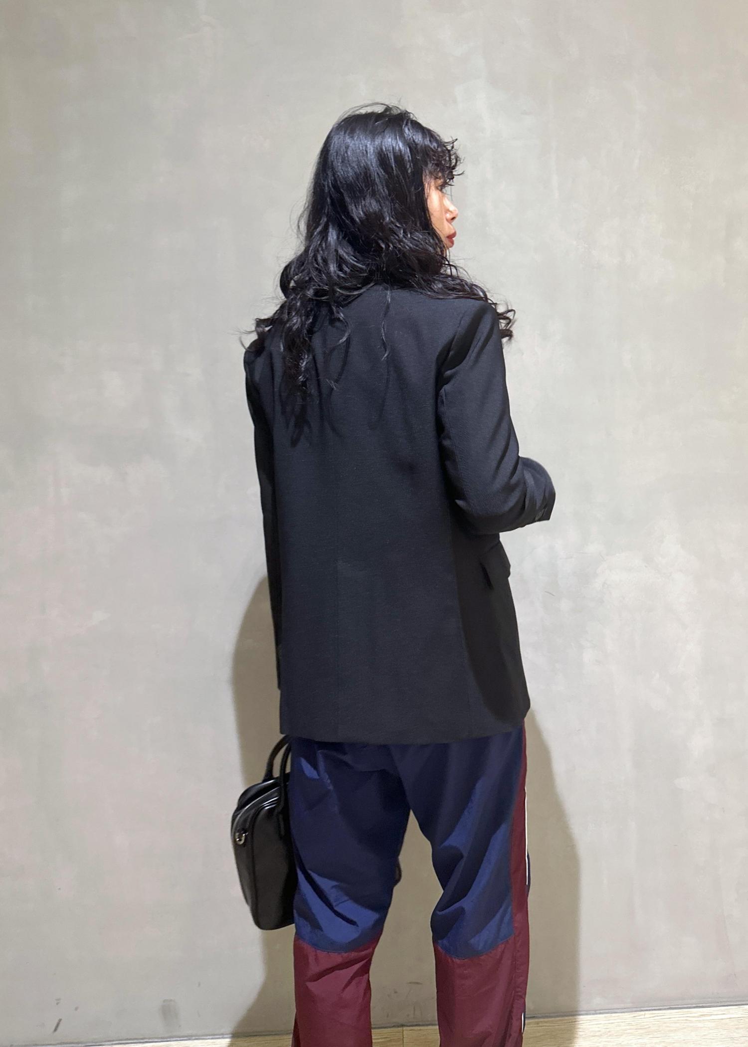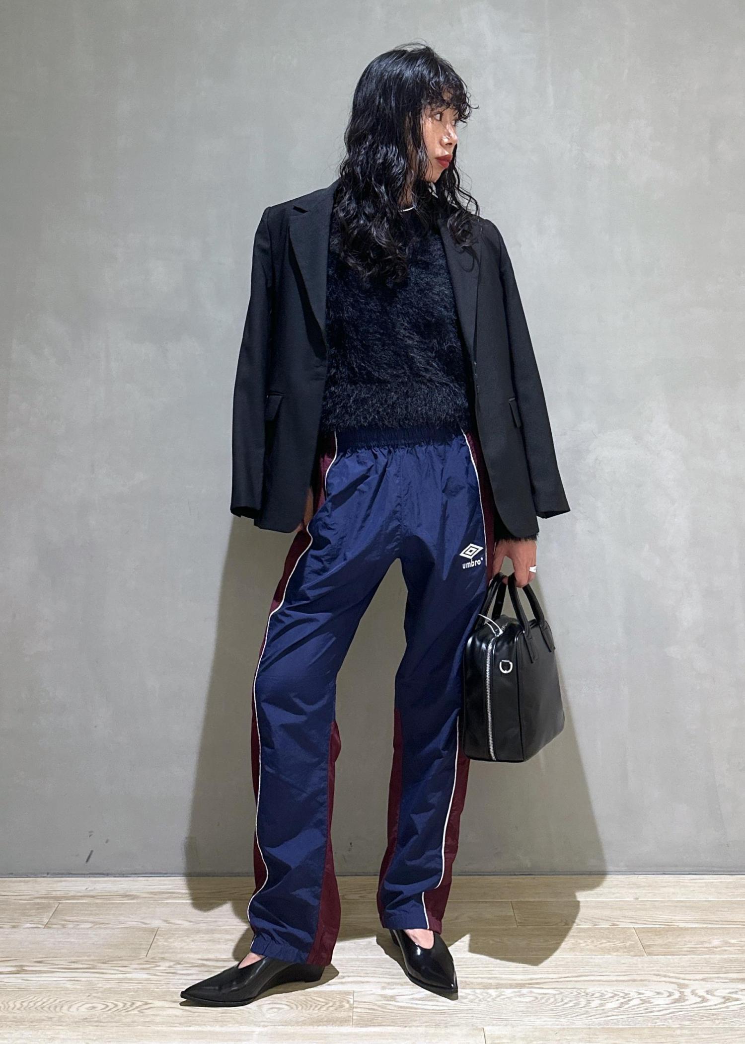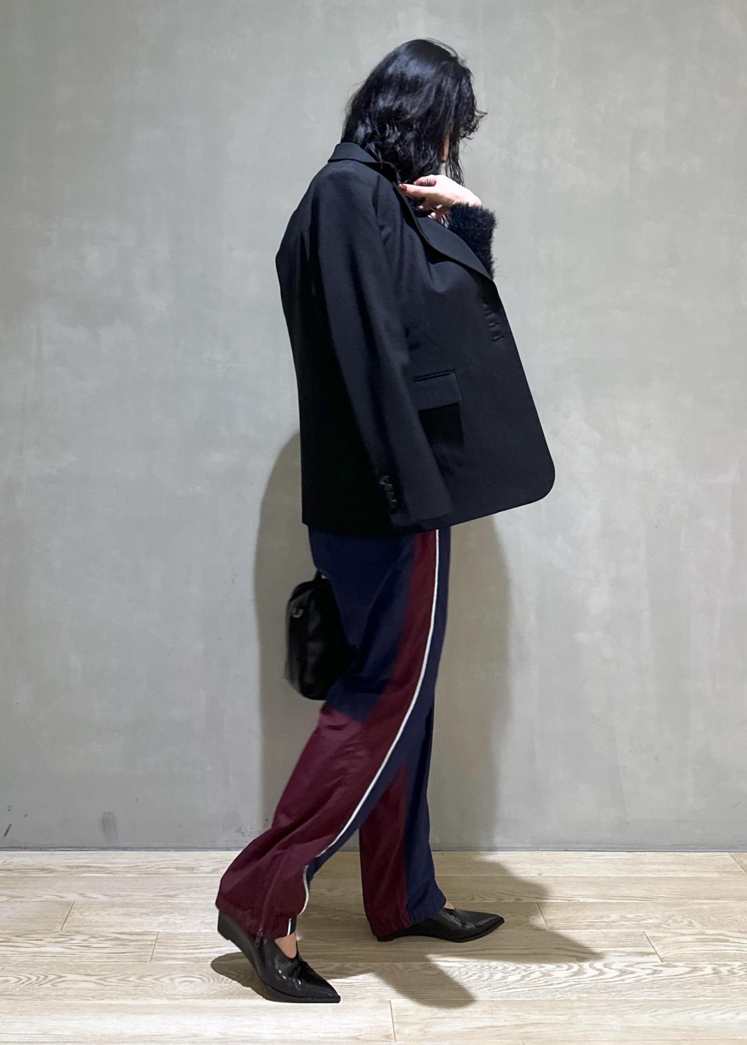 スポーティーなパンツにあえてジャケットを合わせてモードなスタイリングに◎