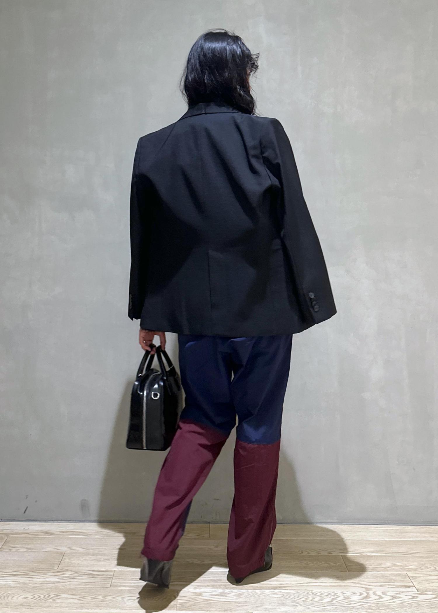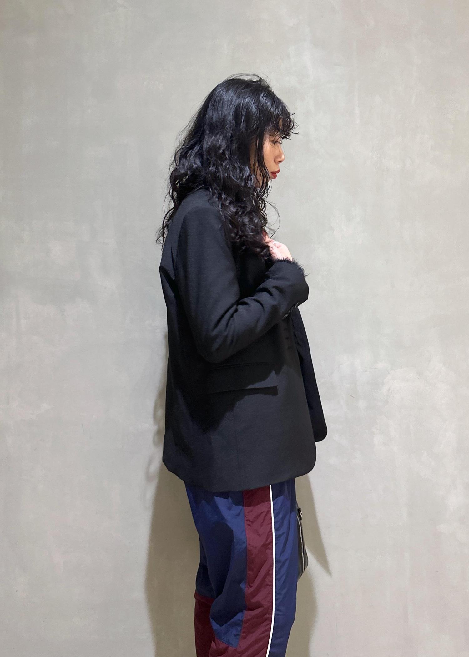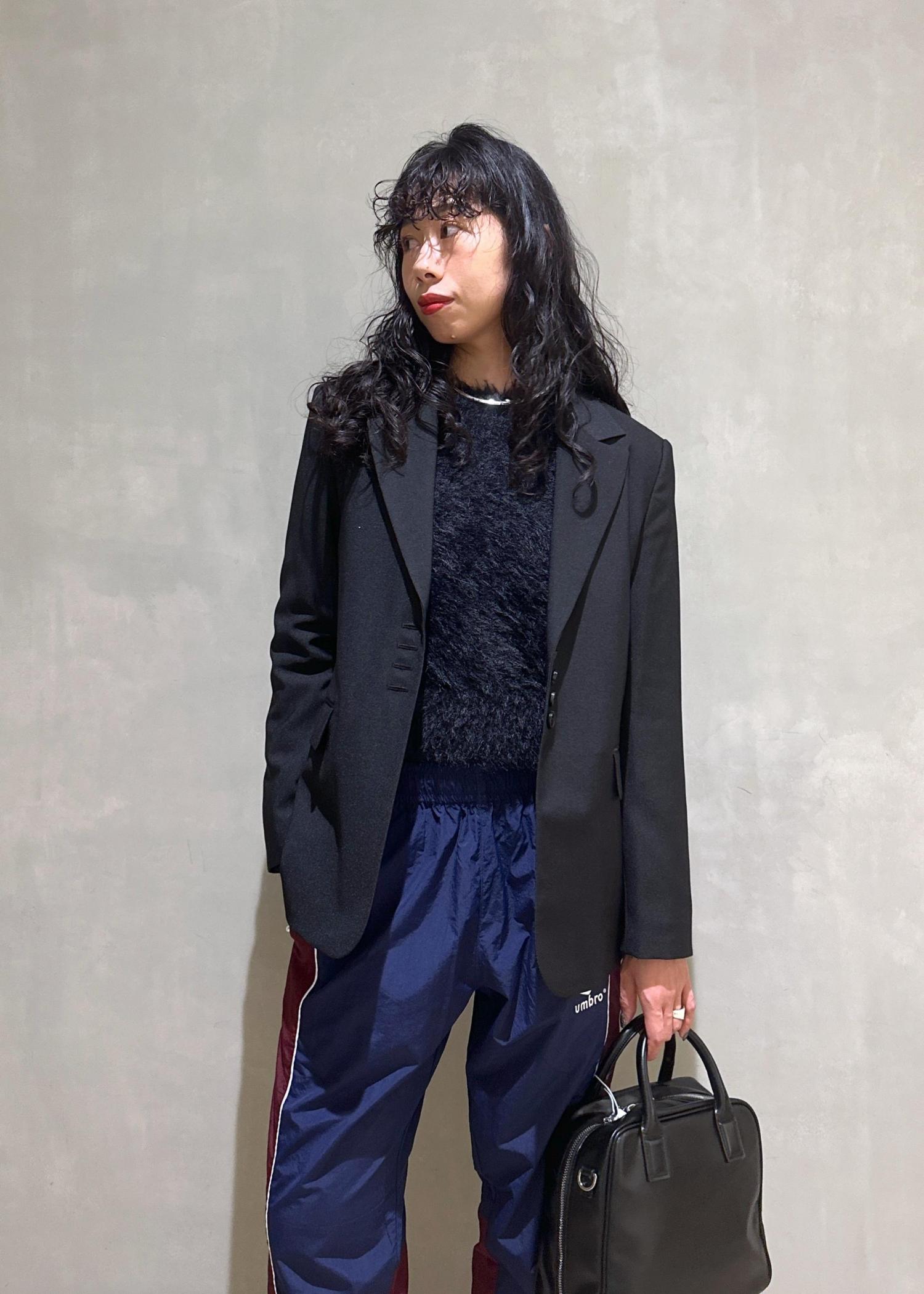スポーティーなパンツにあえてジャケットを合わせてモードなスタイリングに◎