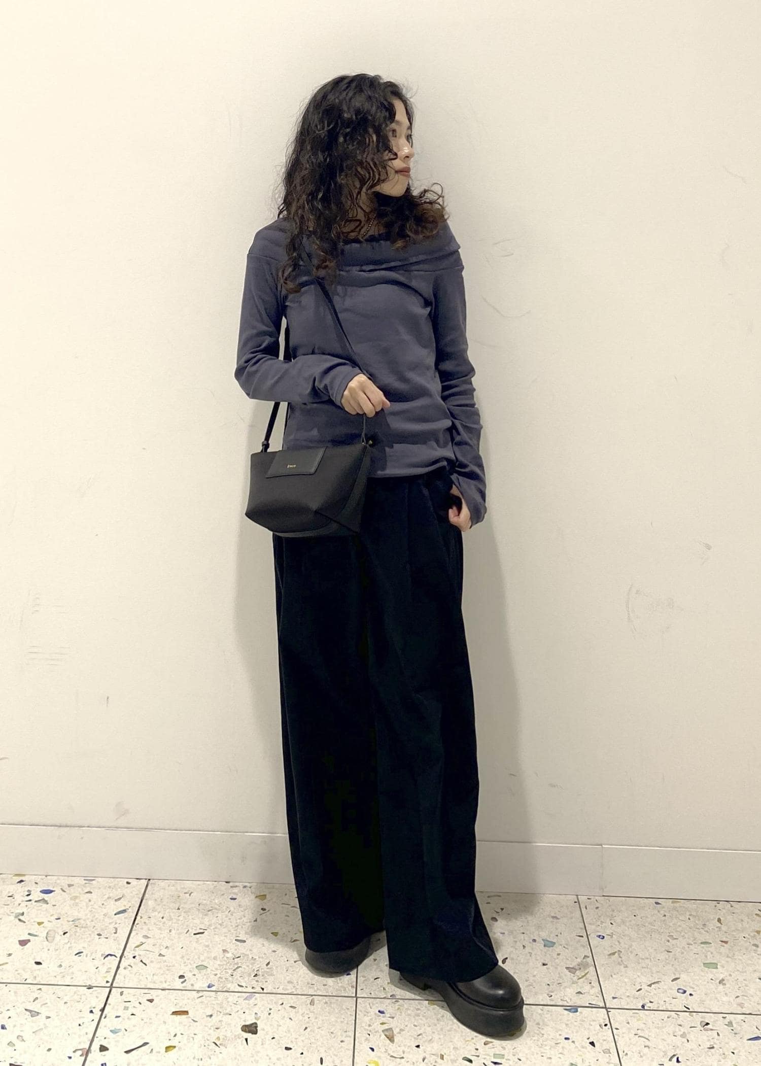 デニムでカジュアルなスタイリングですが、足元はデニムに合わせて黒のバレエシューズで大人っぽく。差し色でラベンダーのスウェット巻きました◯