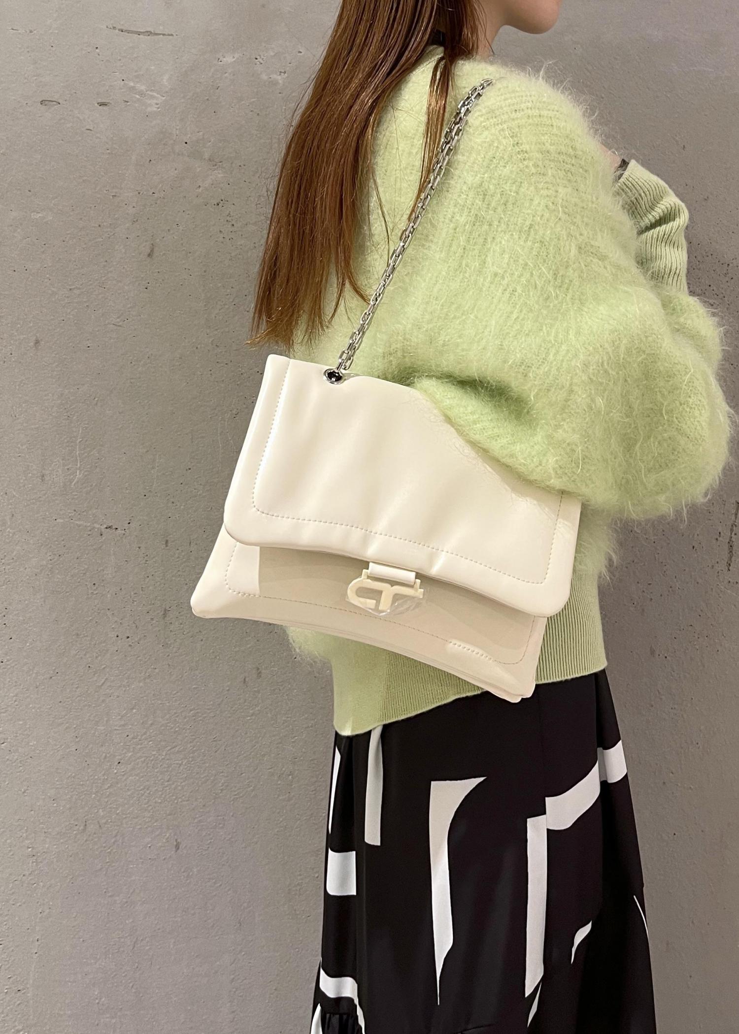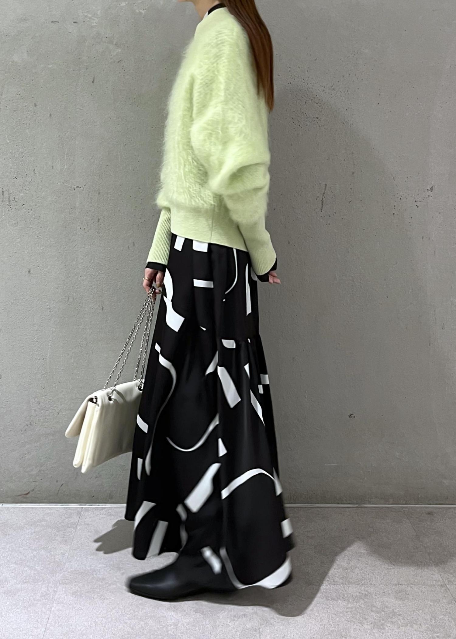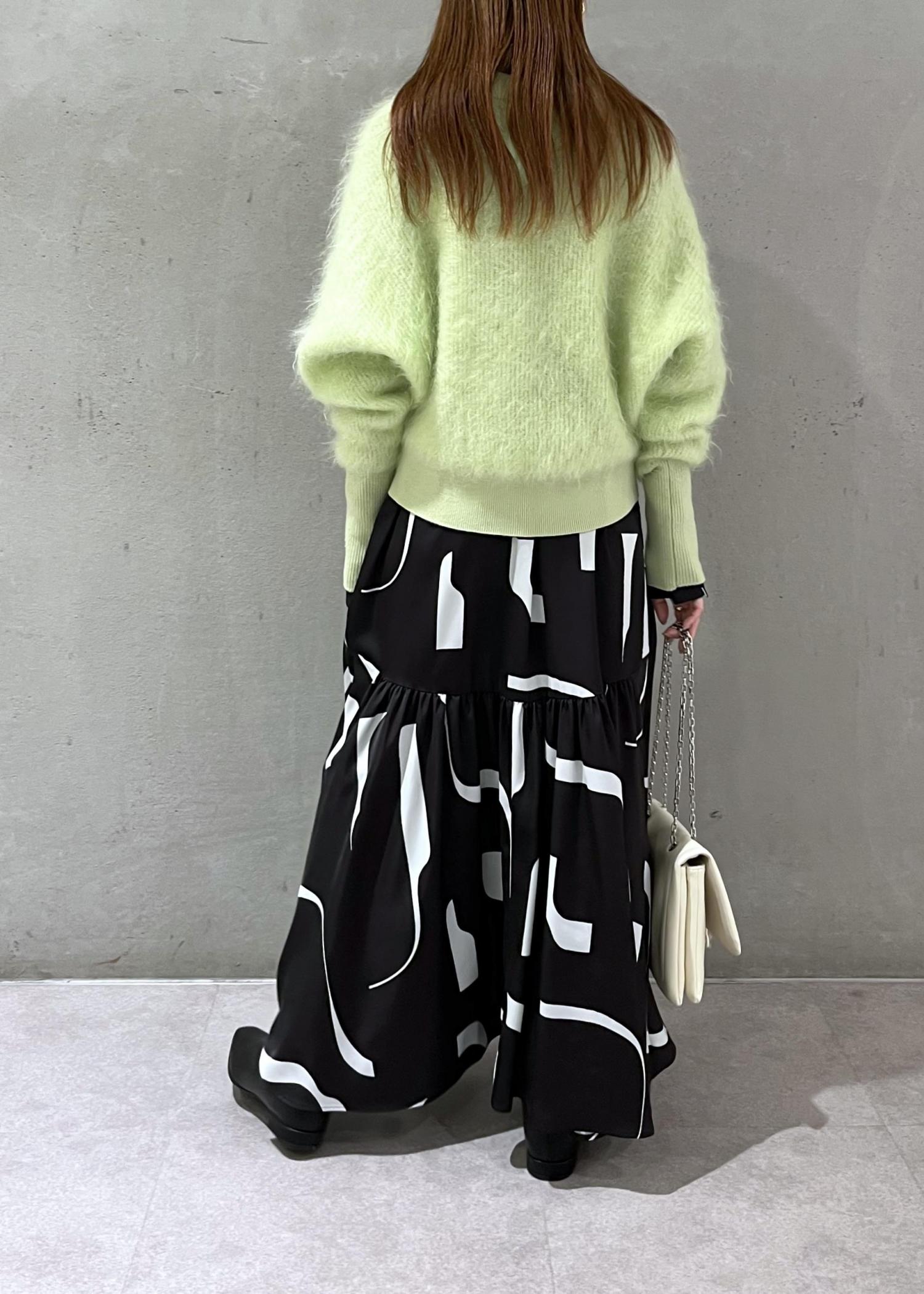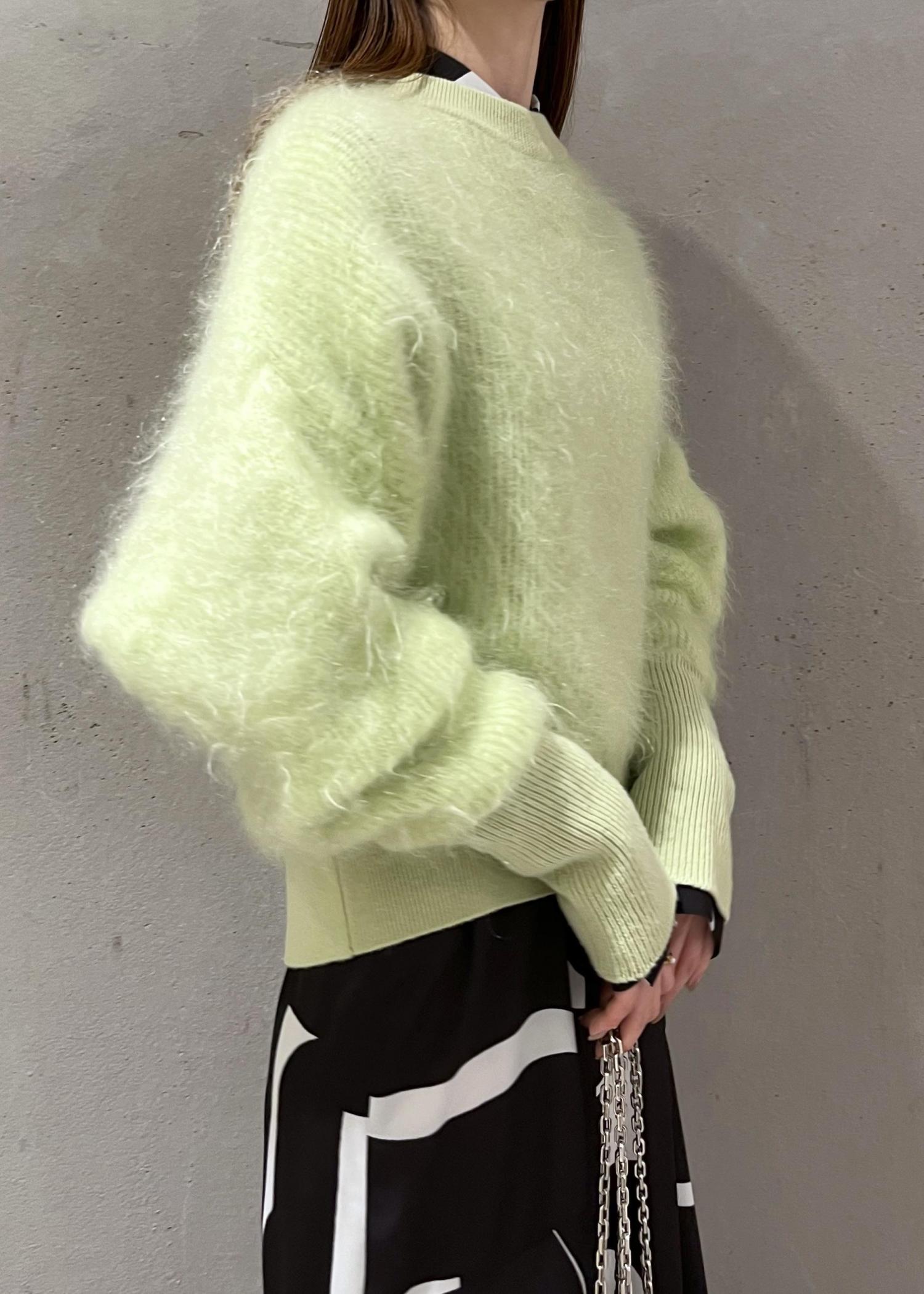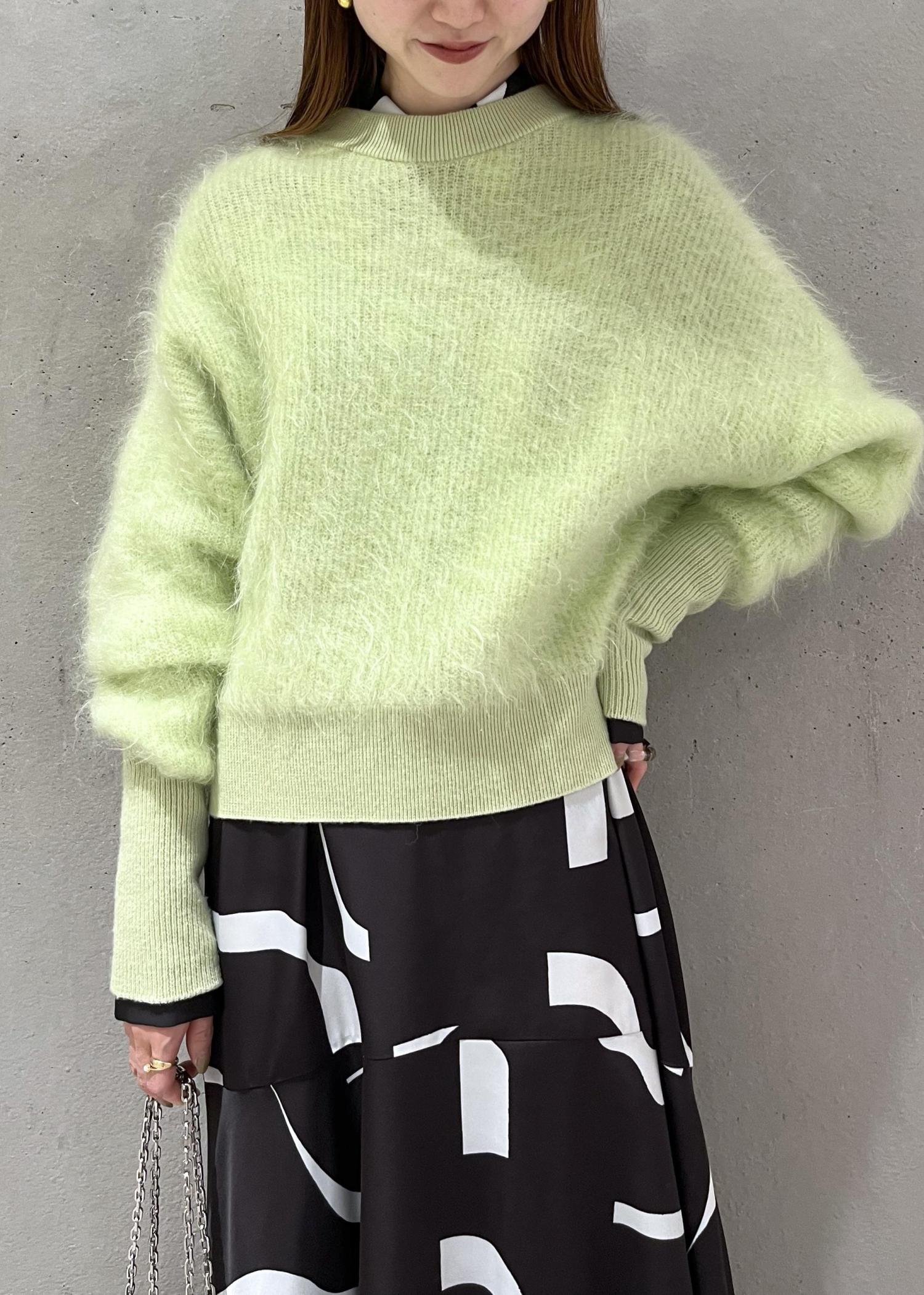 重ねたモヘヤニットは柔らかなグリーンカラーが綺麗な一着。