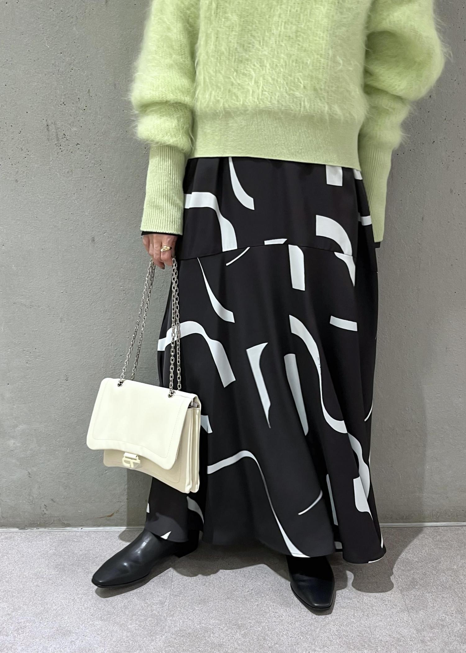 女性らしいシルエットですがアートプリントでモードな雰囲気に仕上げたデザイン。