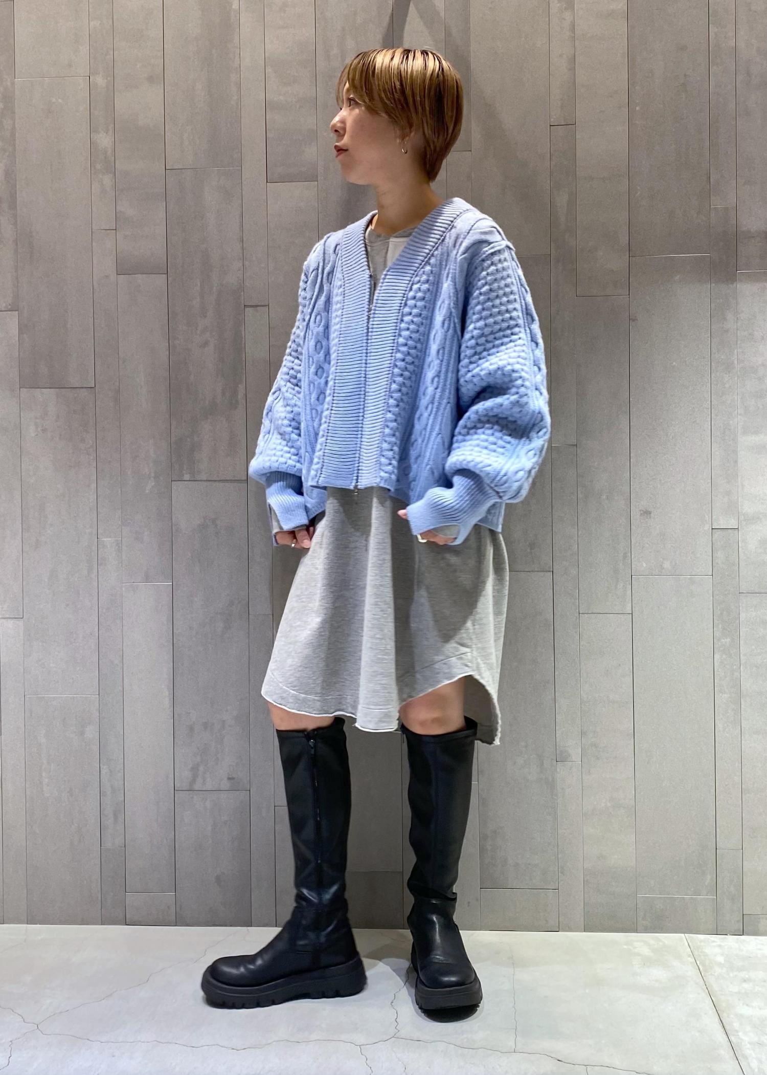 カジュアルになりやすいケーブル編みも首元をシャープな