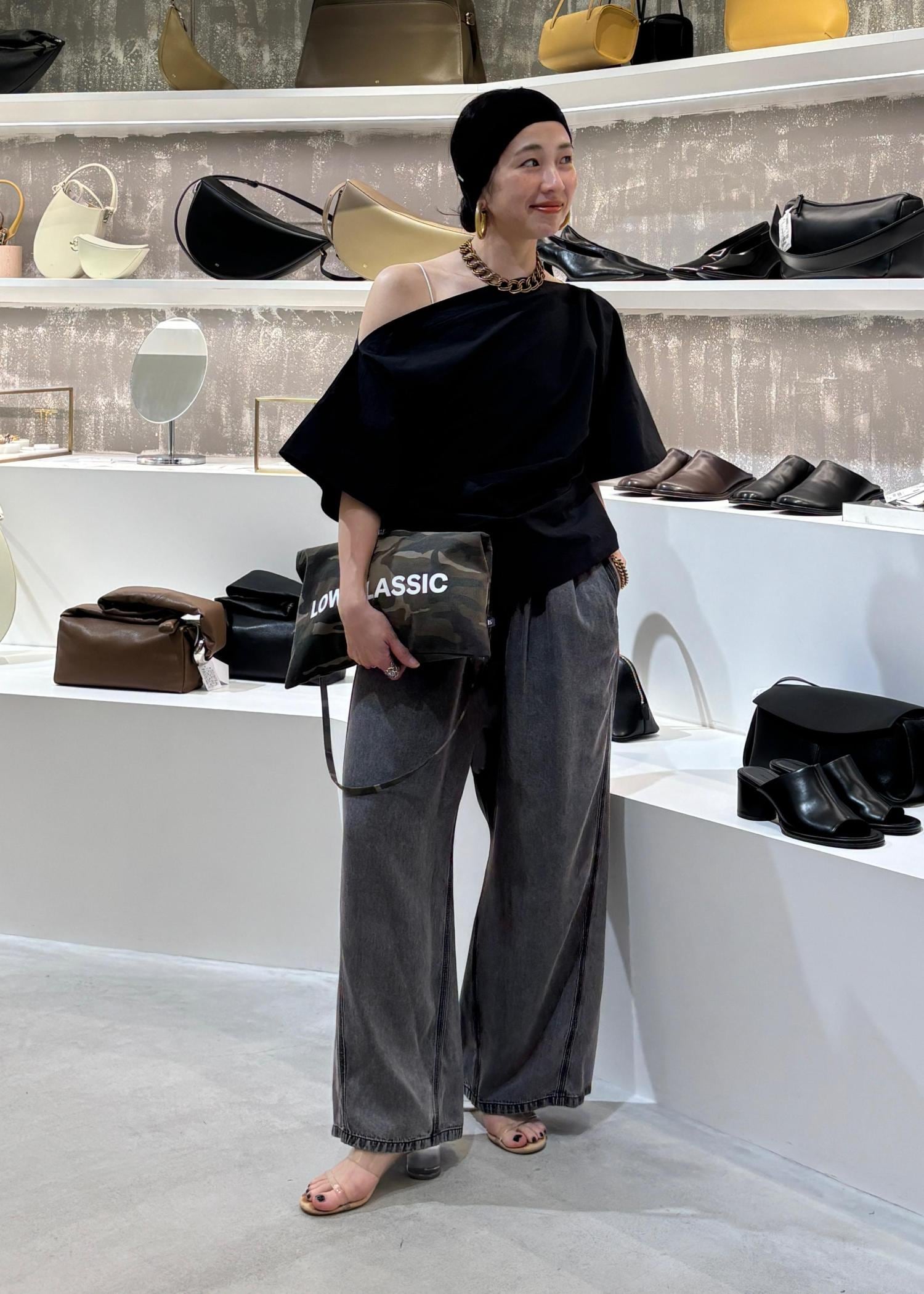 ポイントでレオパード柄のバッグを肩がけ