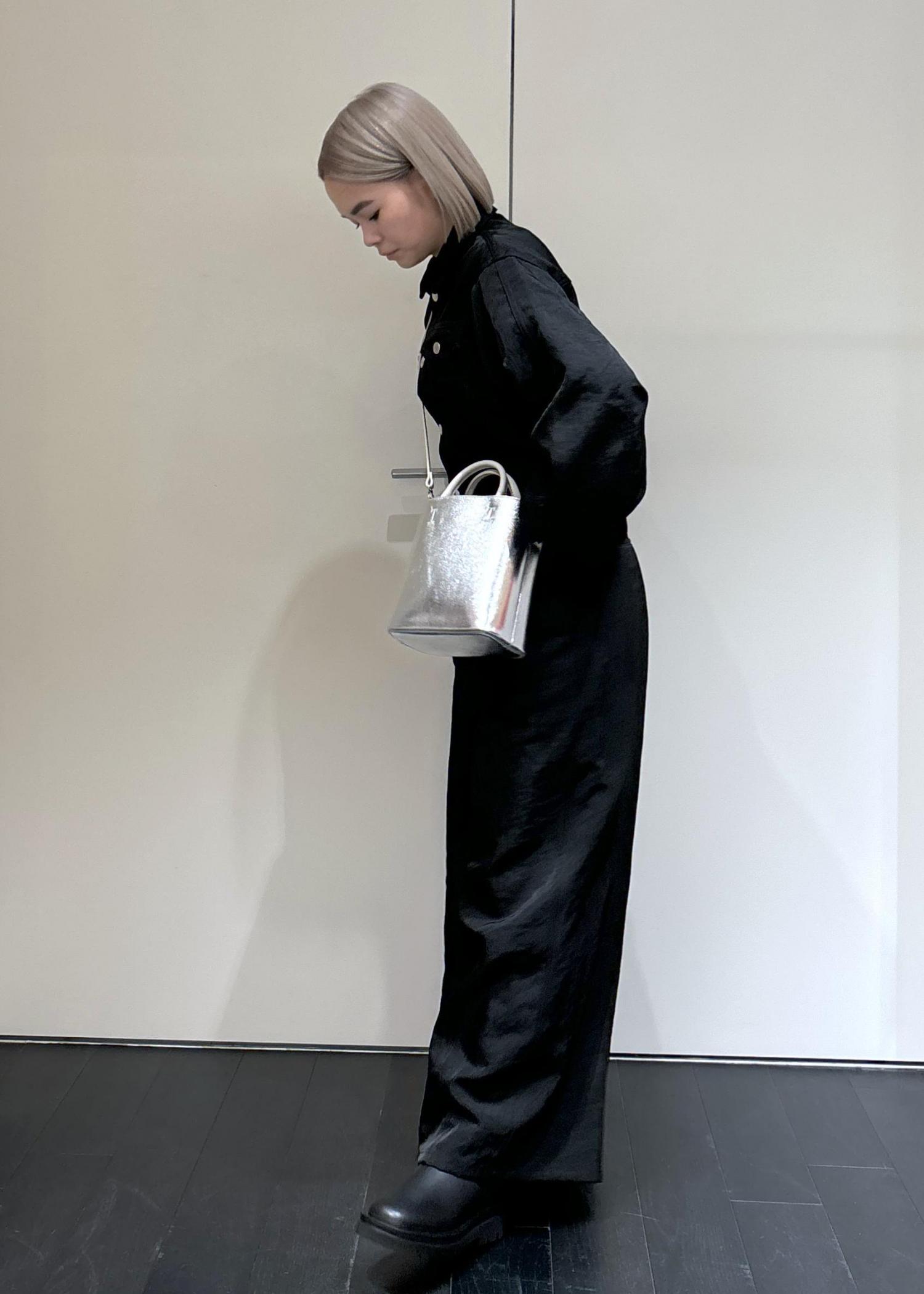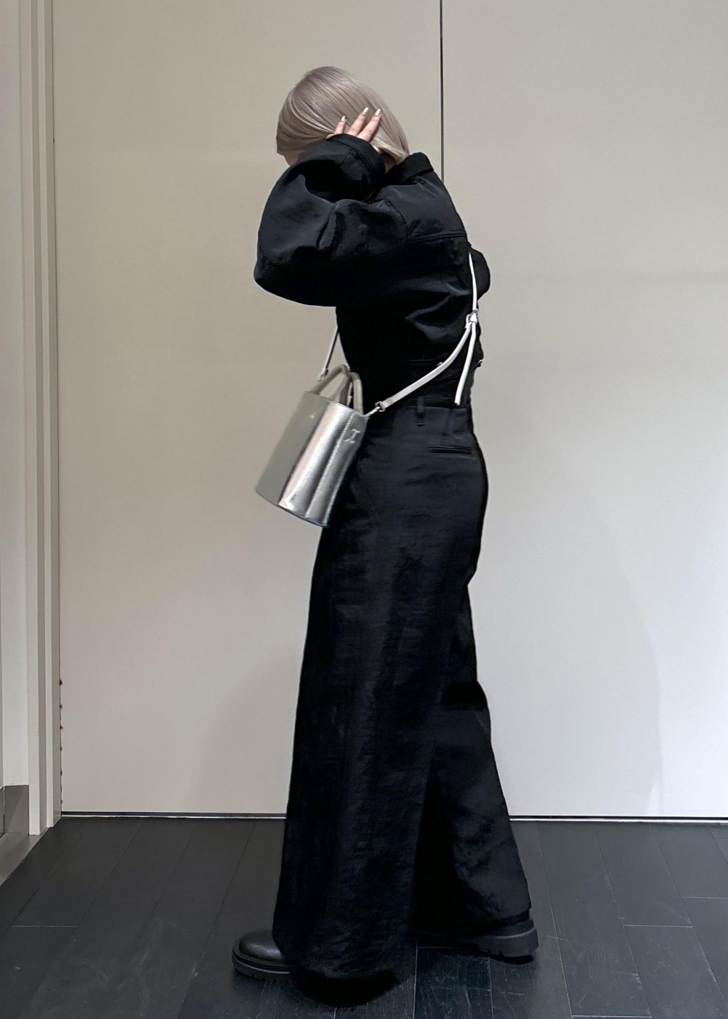 黒のセットアップでカッコよくまとめ、ハリ感のあるツヤっとしたお素材がカジュアルになりすぎず、女性らしい雰囲気に!