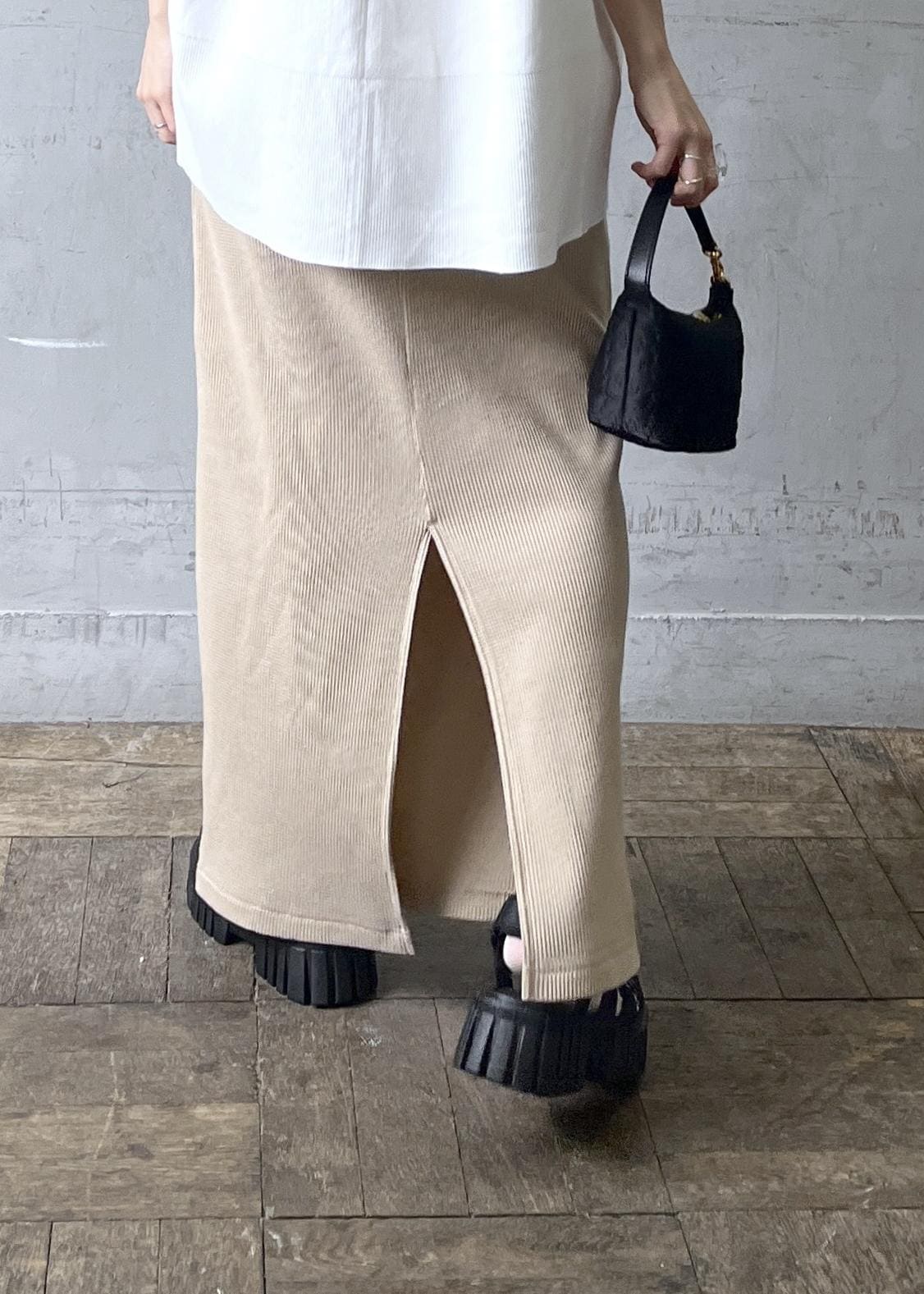 Tシャツ+ワッフル生地のスカートで楽チンさをとことん追求したスタイリング(笑)