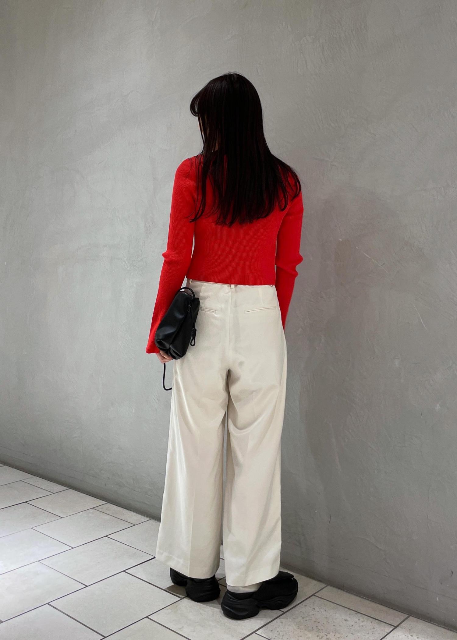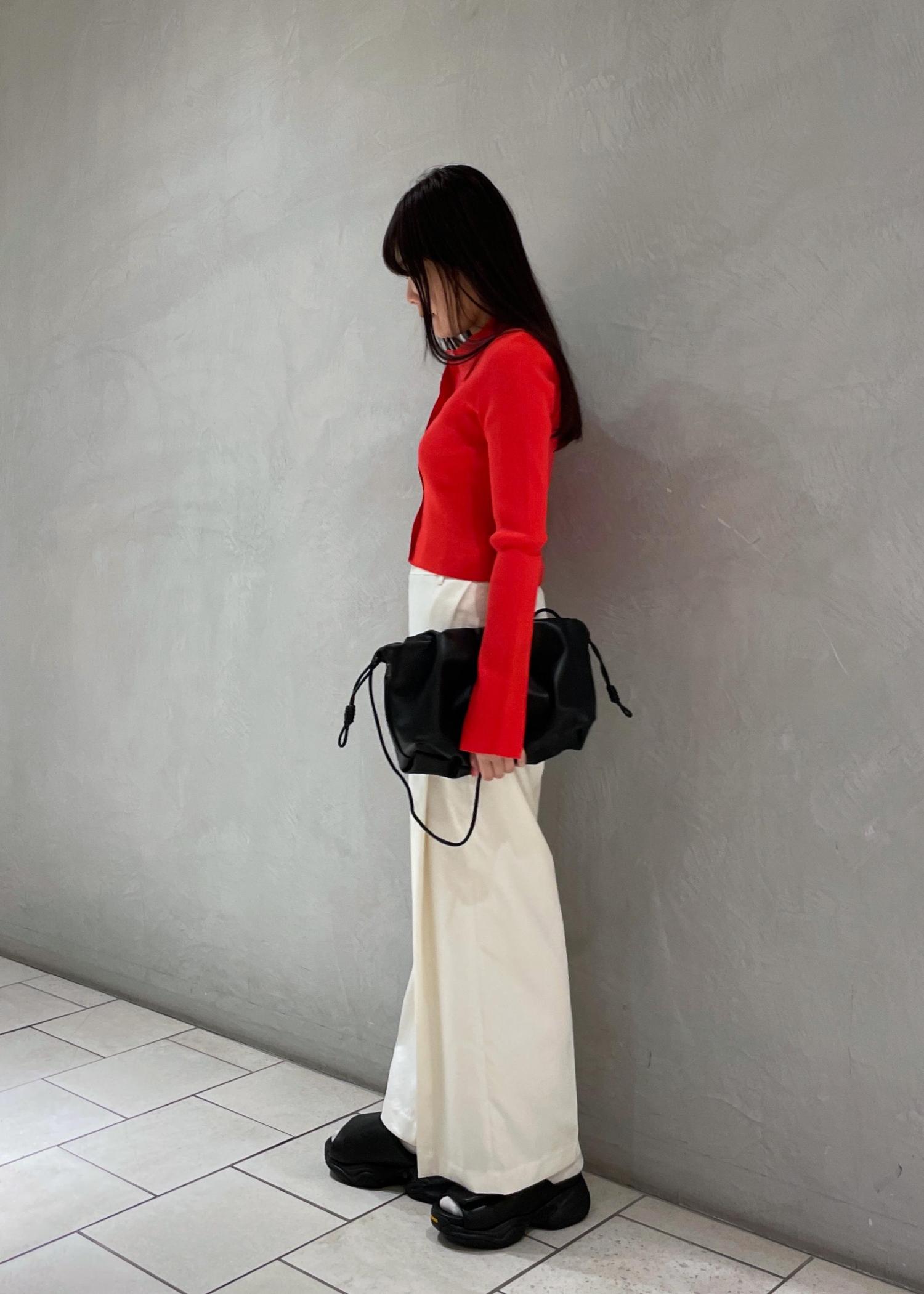 パキッとした色が可愛い赤のカーディガンに白のパンツを合わせて着てみました。