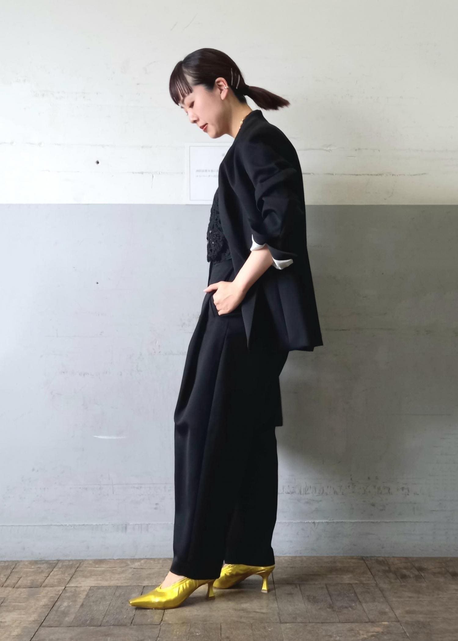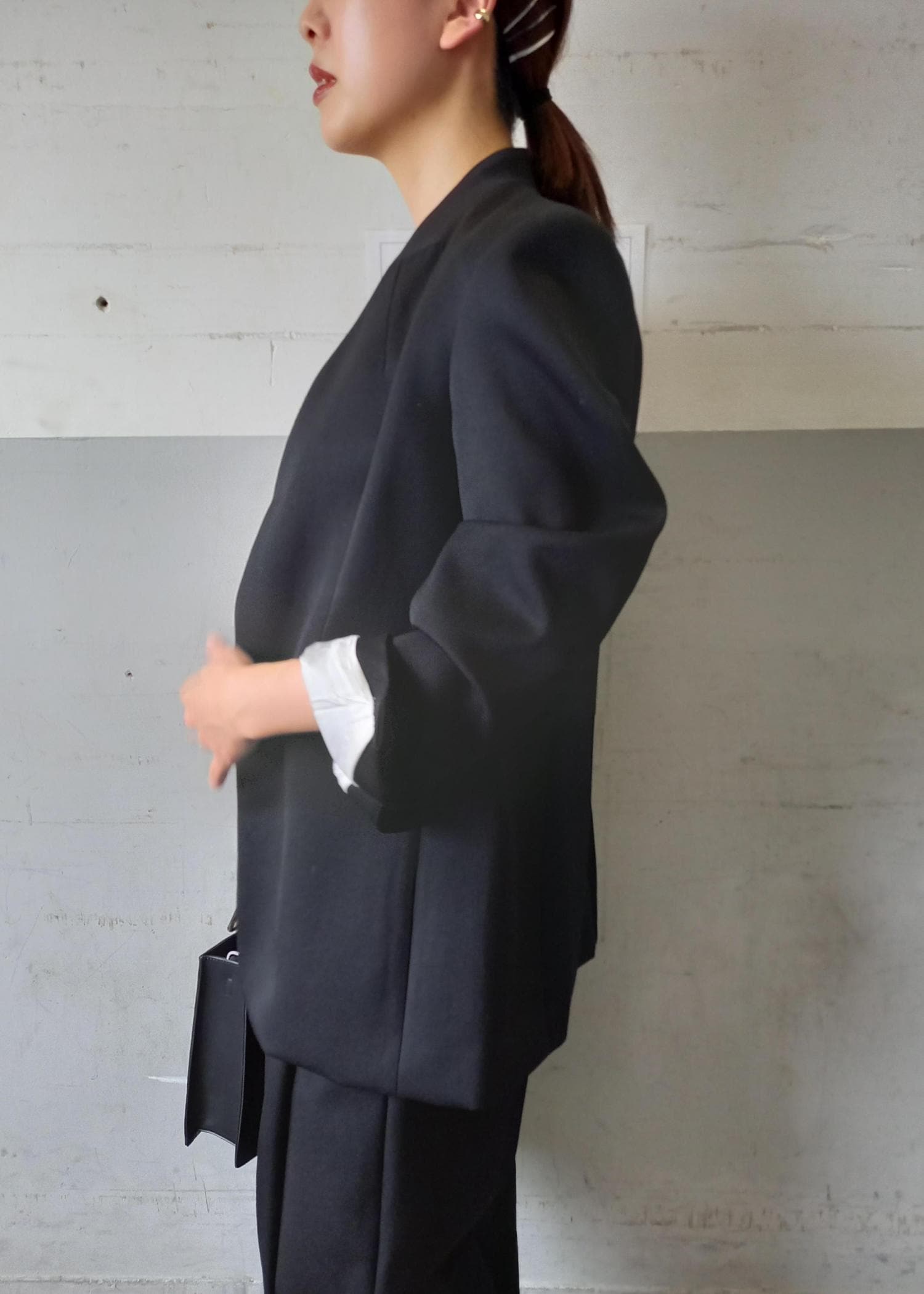襟元のモタつきもなくお顔回りの流れるシルエットが素敵です。