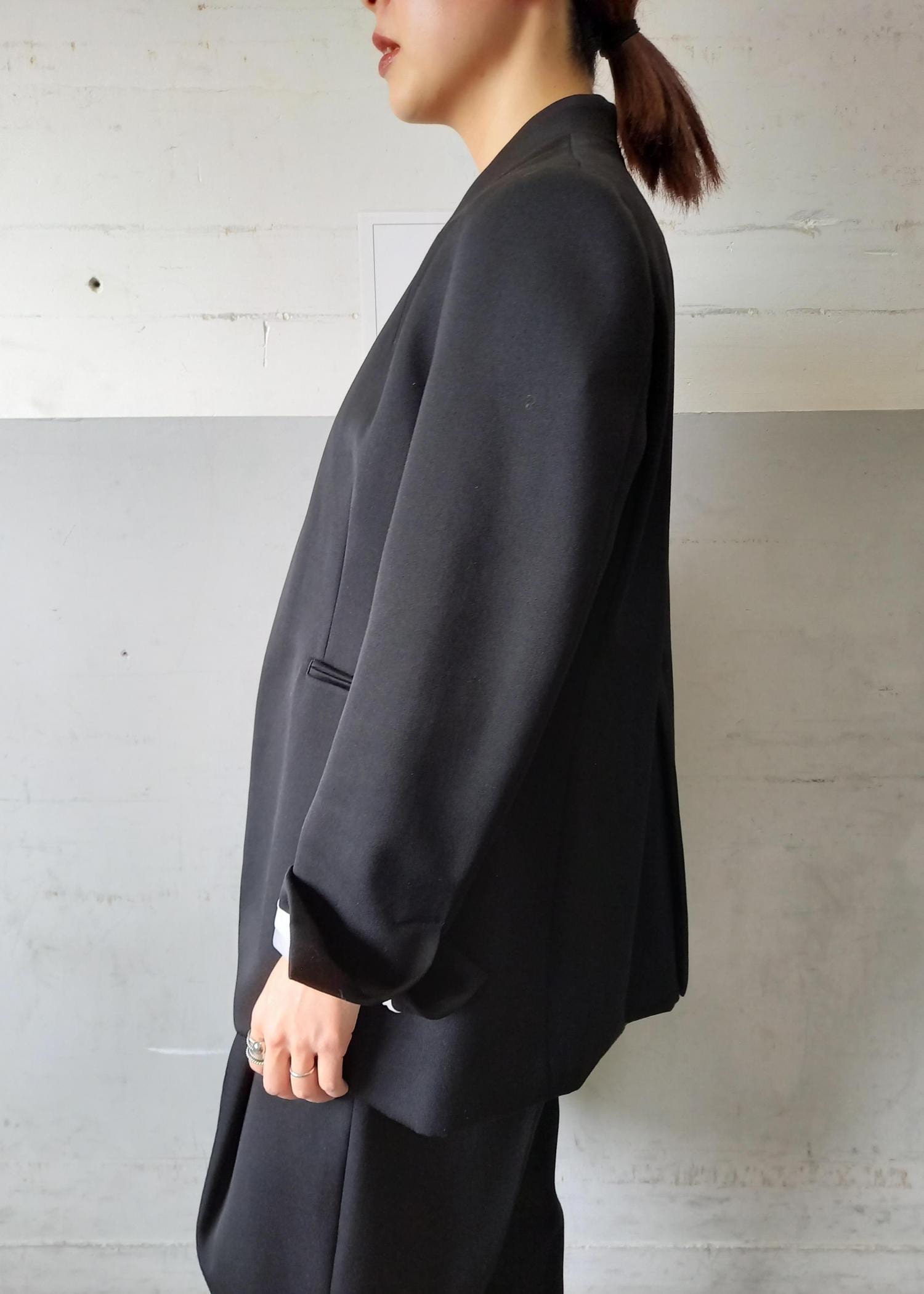 襟元はスッキリとシャープなノーカラージャケット。