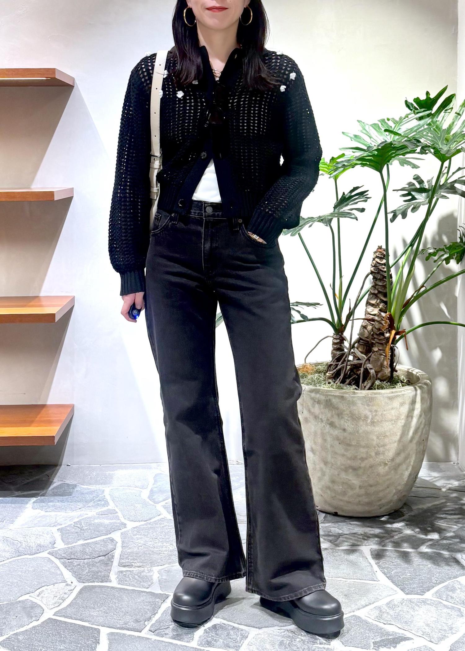 ニットにデザインがあるので、ボトムスはシンプルにデニムあわせで。