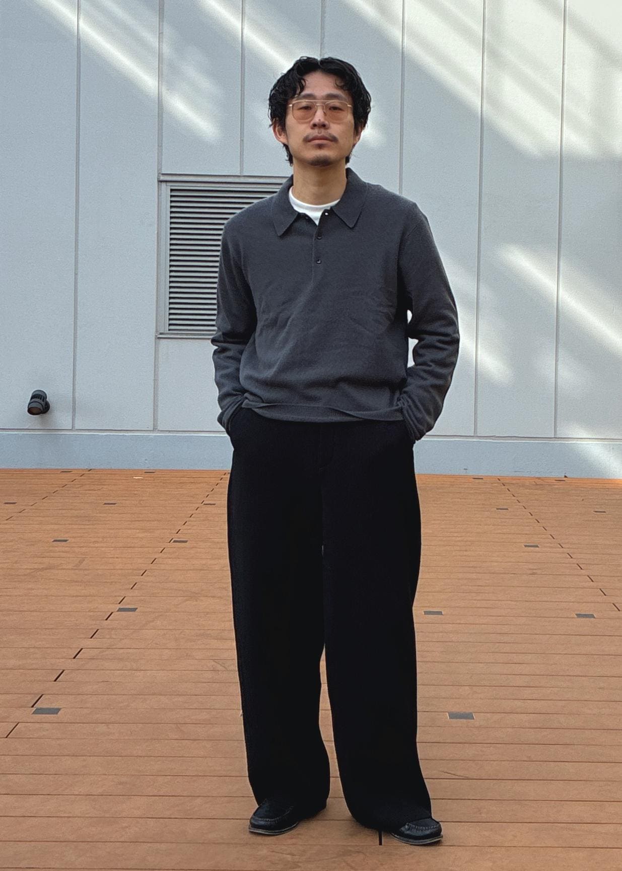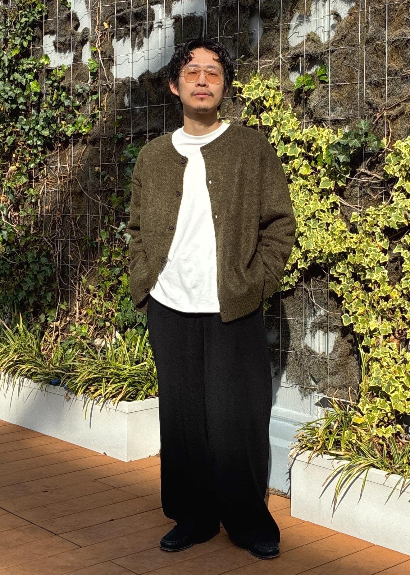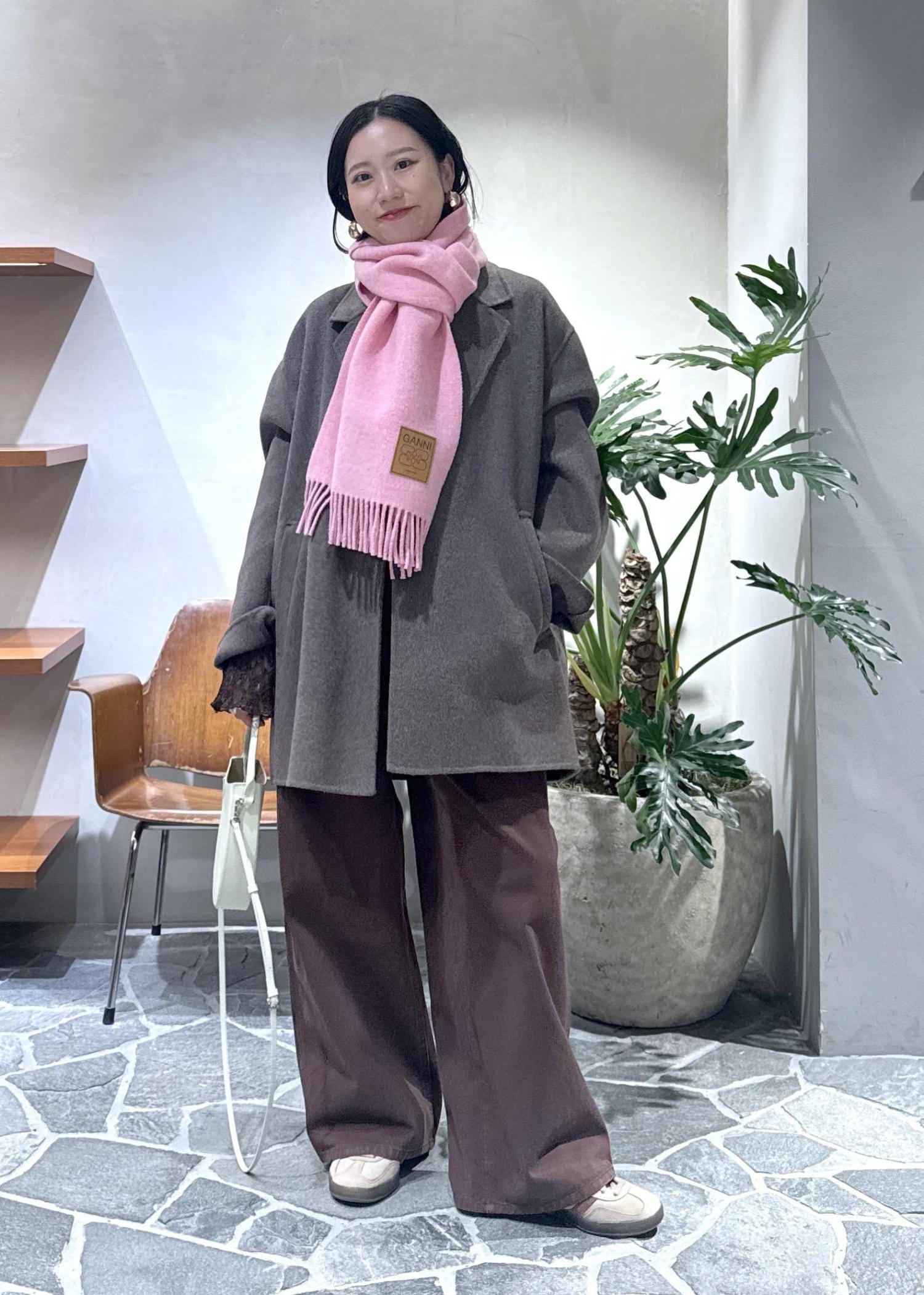 短丈ブラウスとスラックスパンツで足長効果抜群のスタイル。