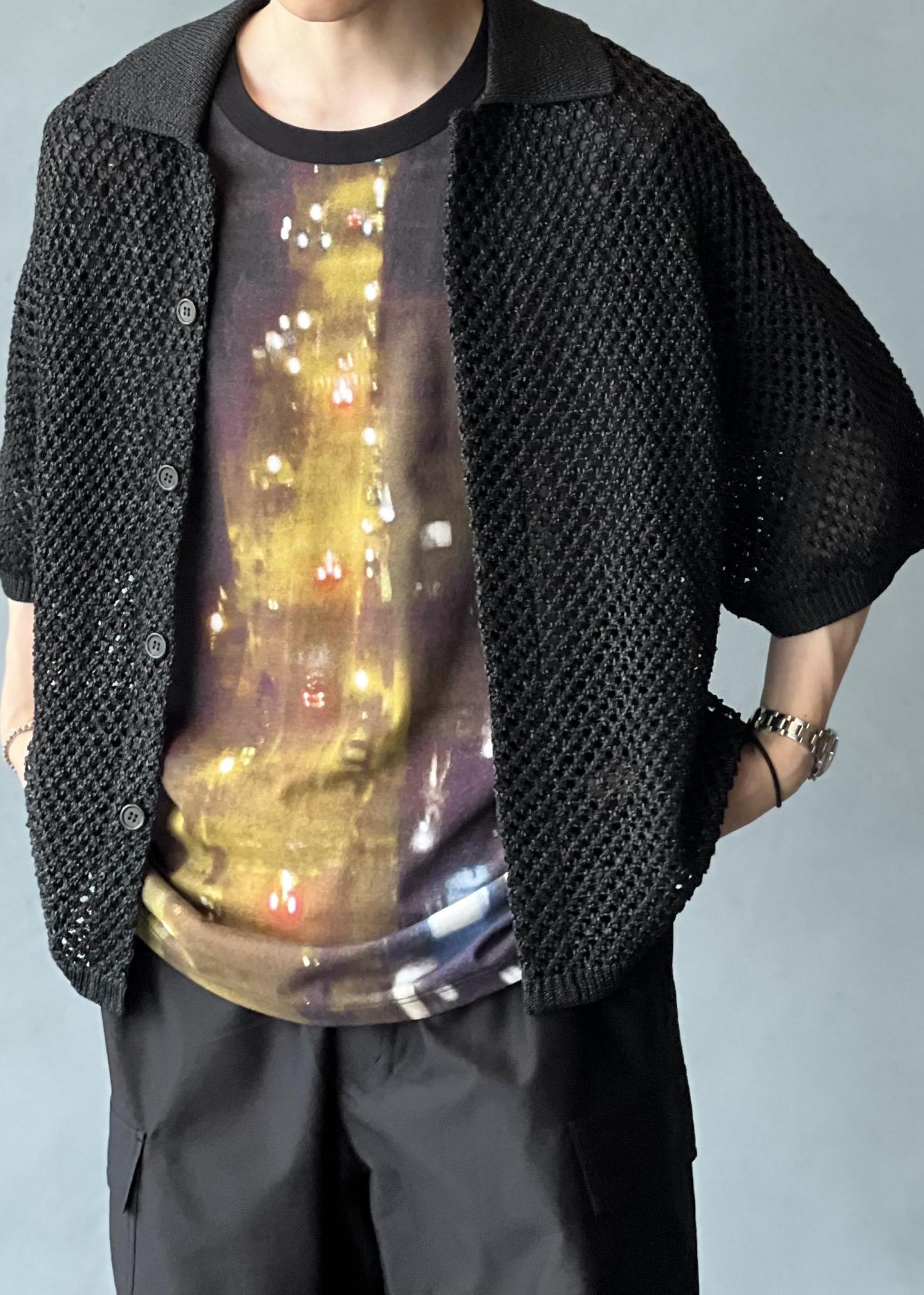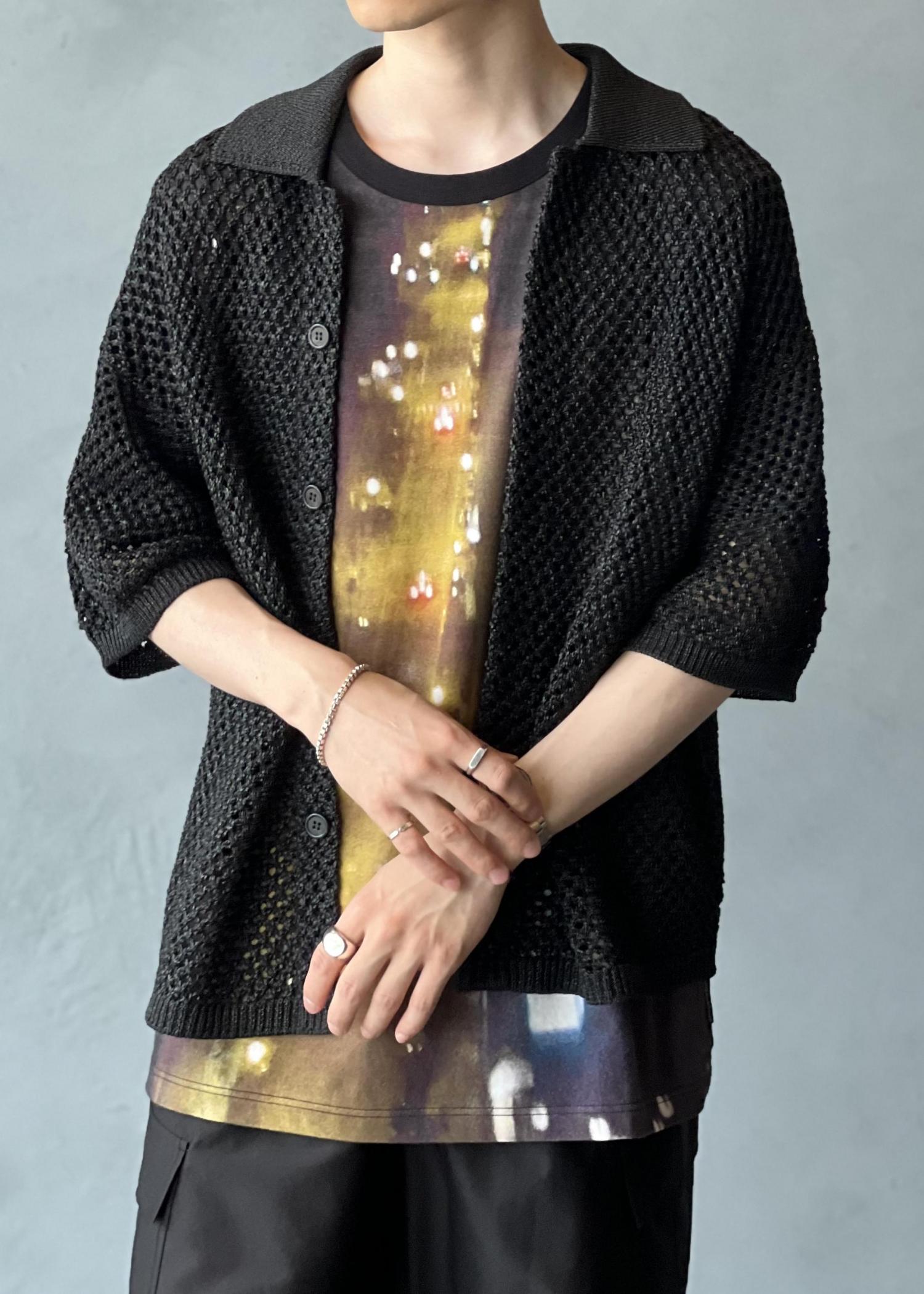 インナーはインパクトのあるプリントTシャツを合わせました。